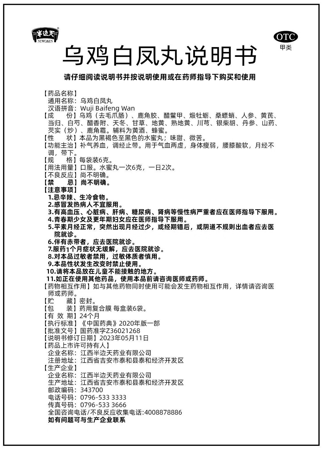 【自营推荐】半边天 乌鸡白凤丸老牌子6gx6袋水蜜丸补气养血调经止带用于气血两虚身体瘦弱腰膝酸软妇科用药
