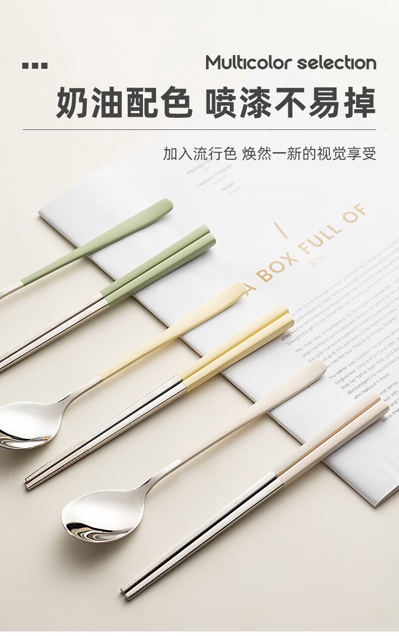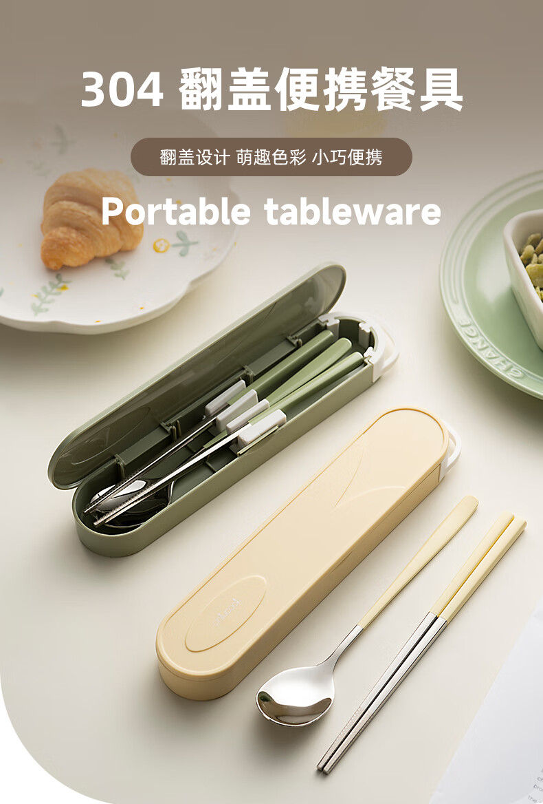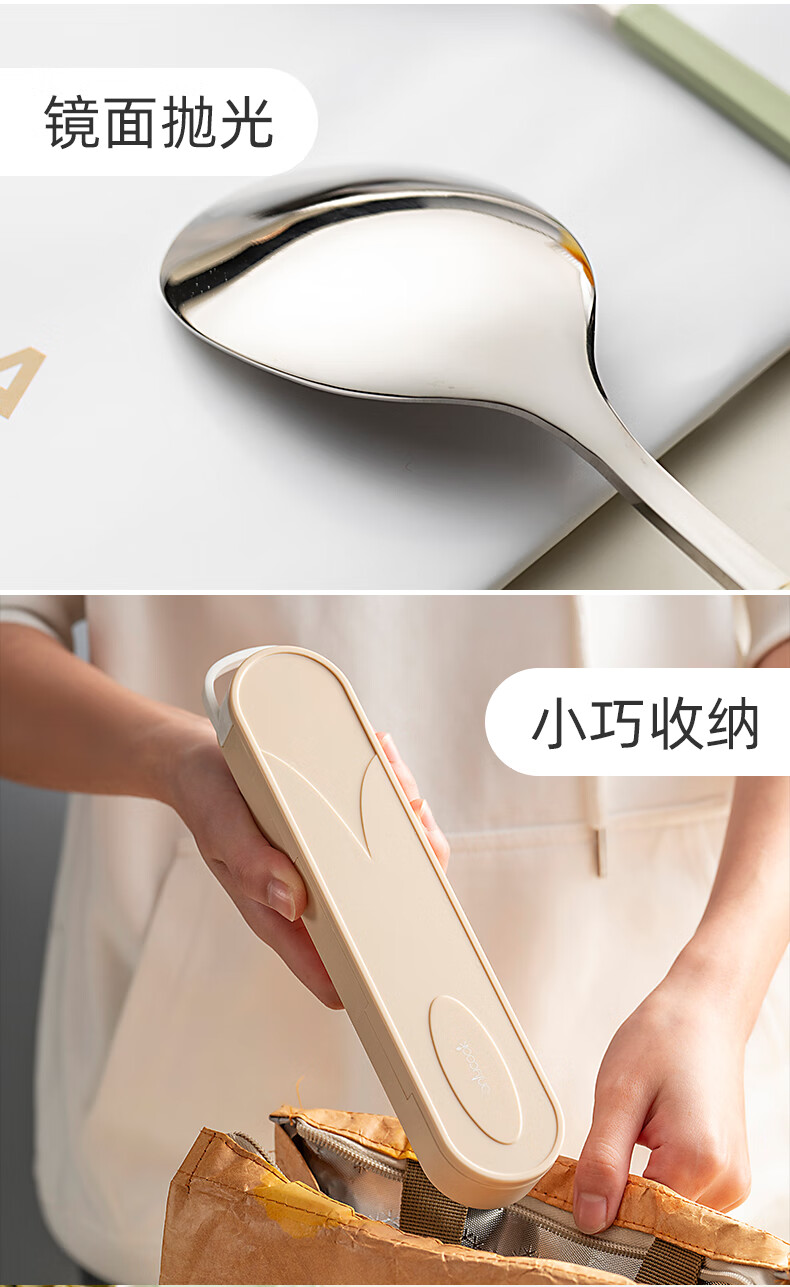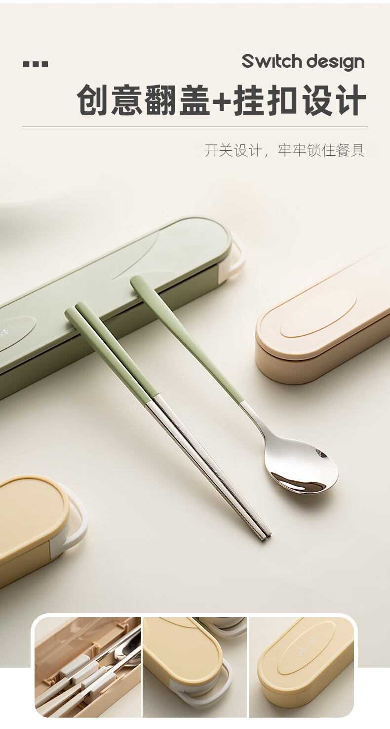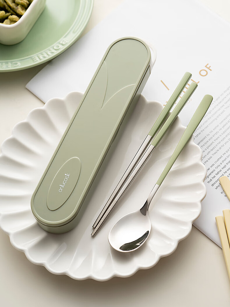 onlycook304不锈钢便携餐具盒套装 带挂钩筷子勺子套装 学生餐具套装绿色