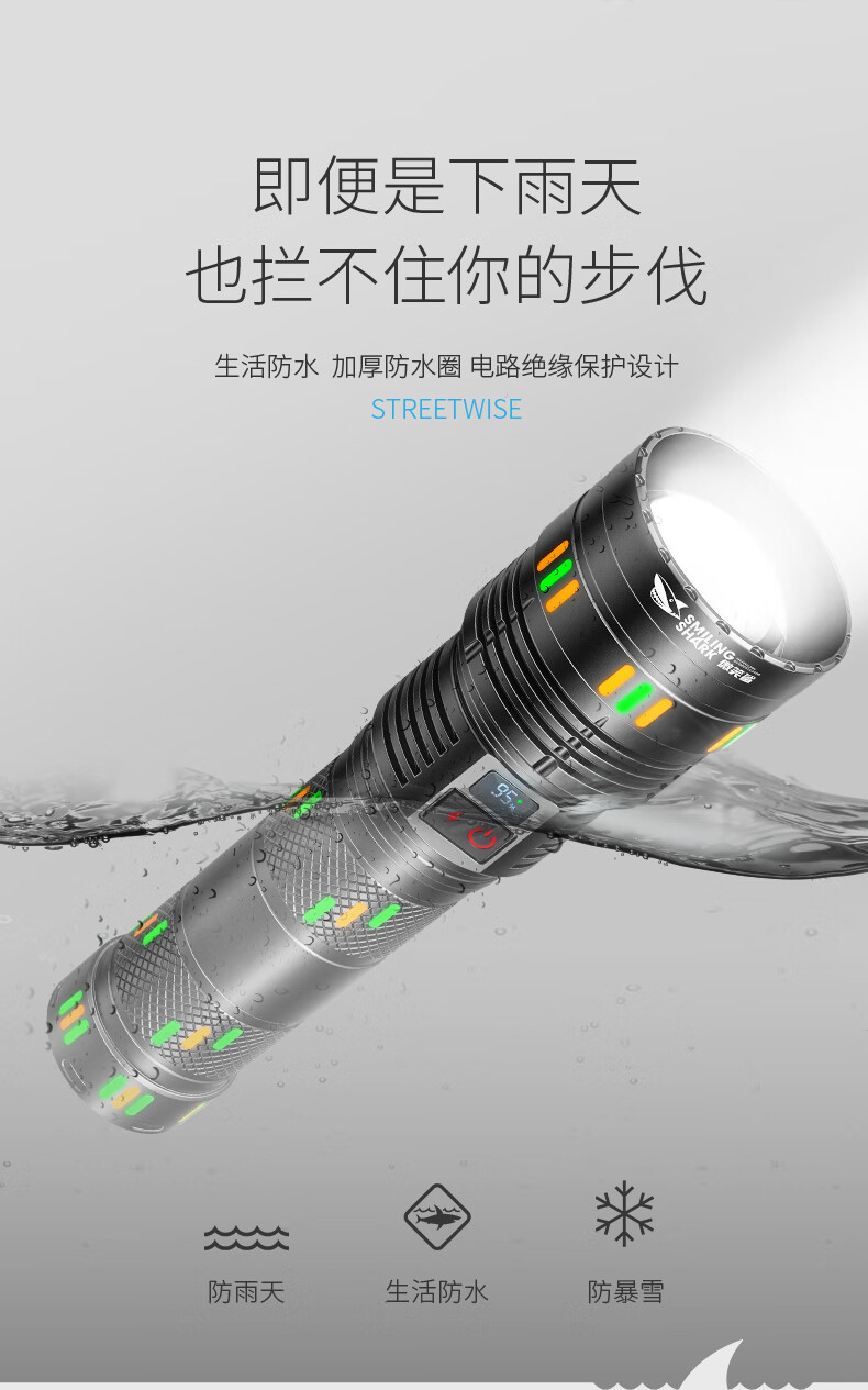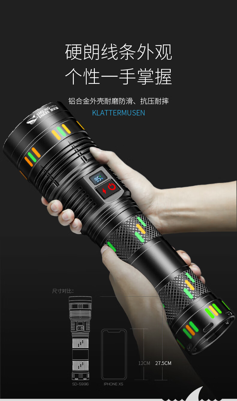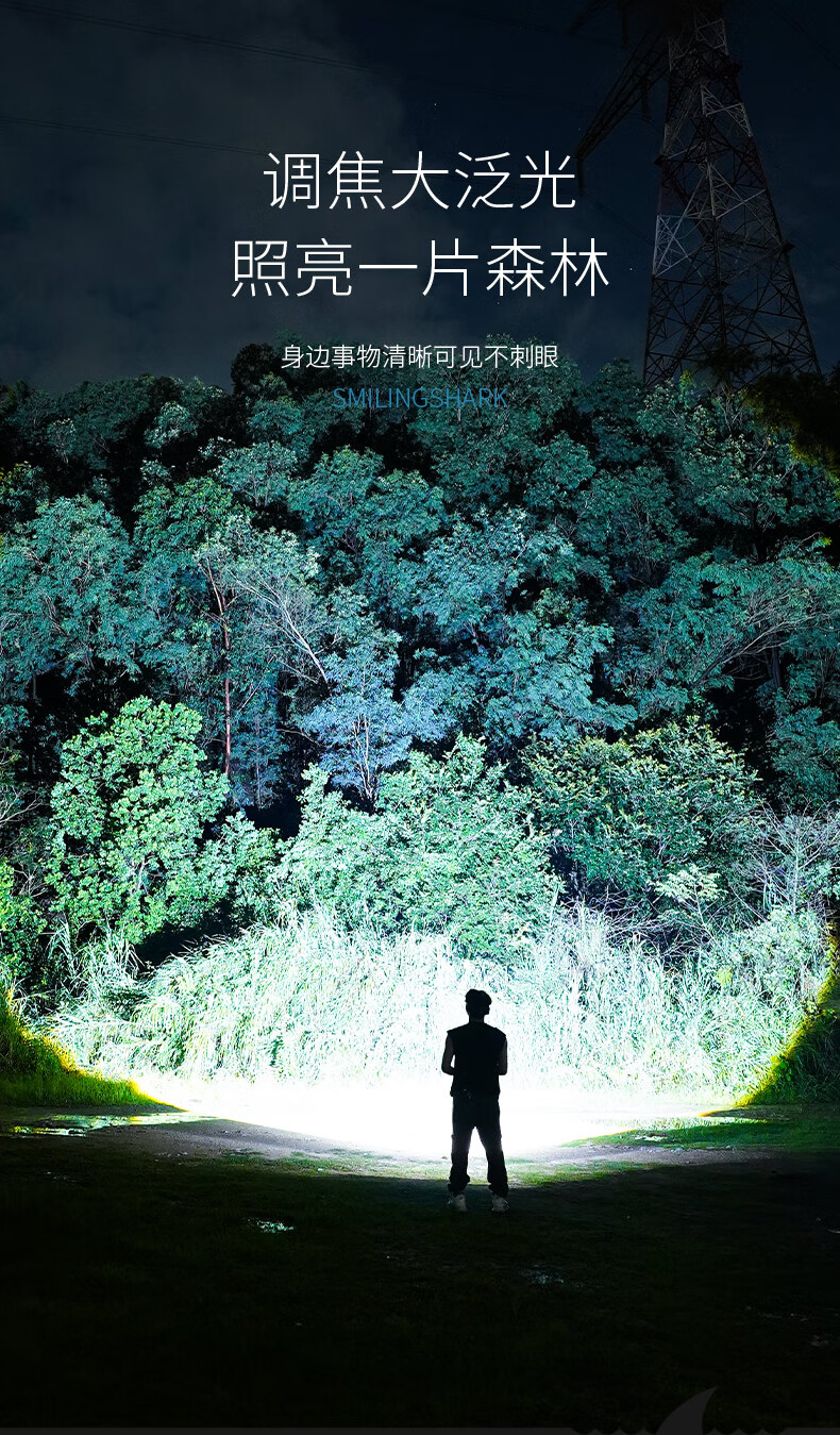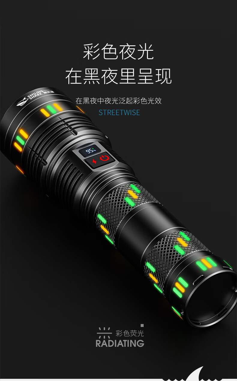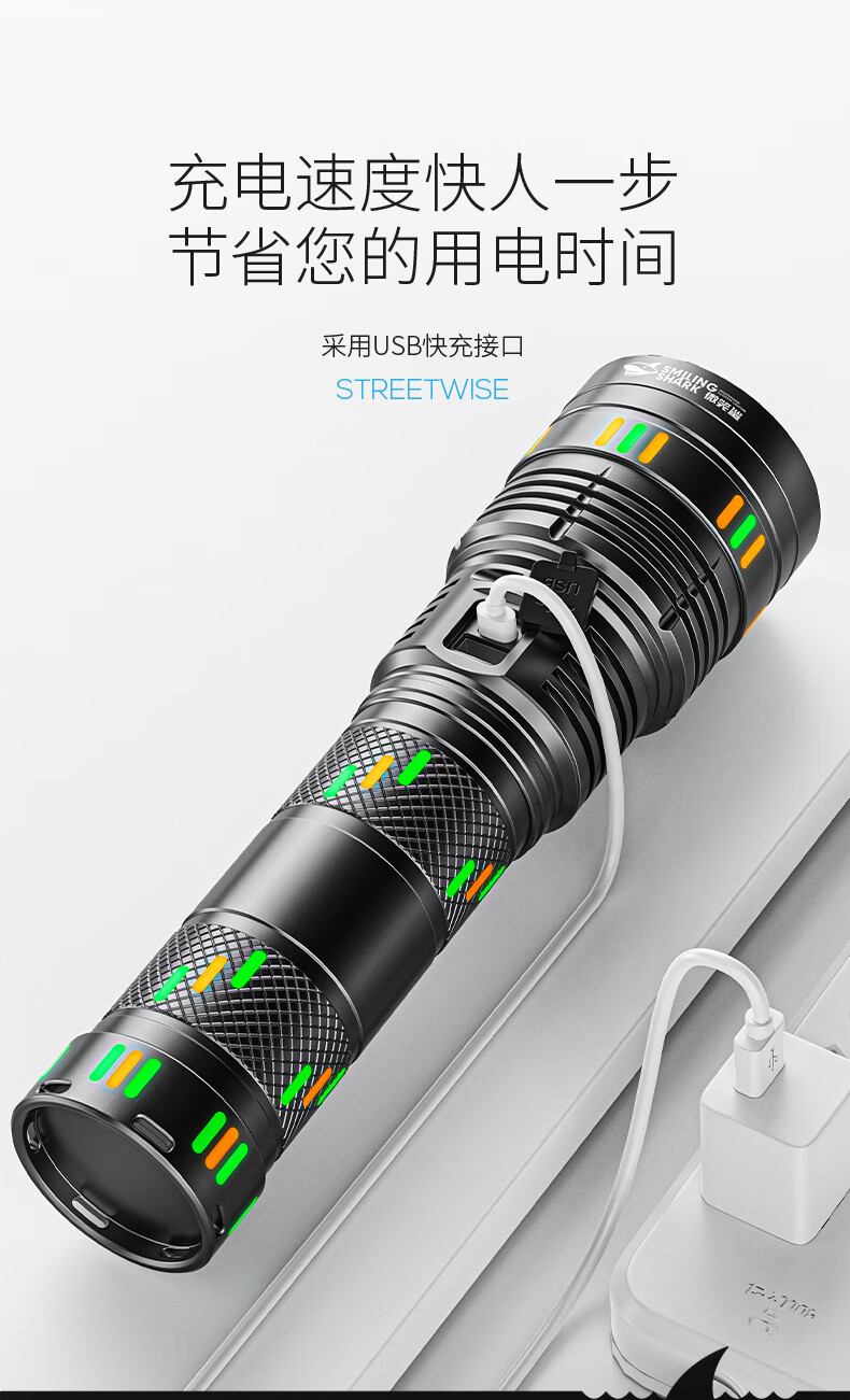 微笑鲨夜魂强光手电筒超长续航户外充电应急灯家用变焦远射激光探照灯 夜光长款-M80灯芯【8电】