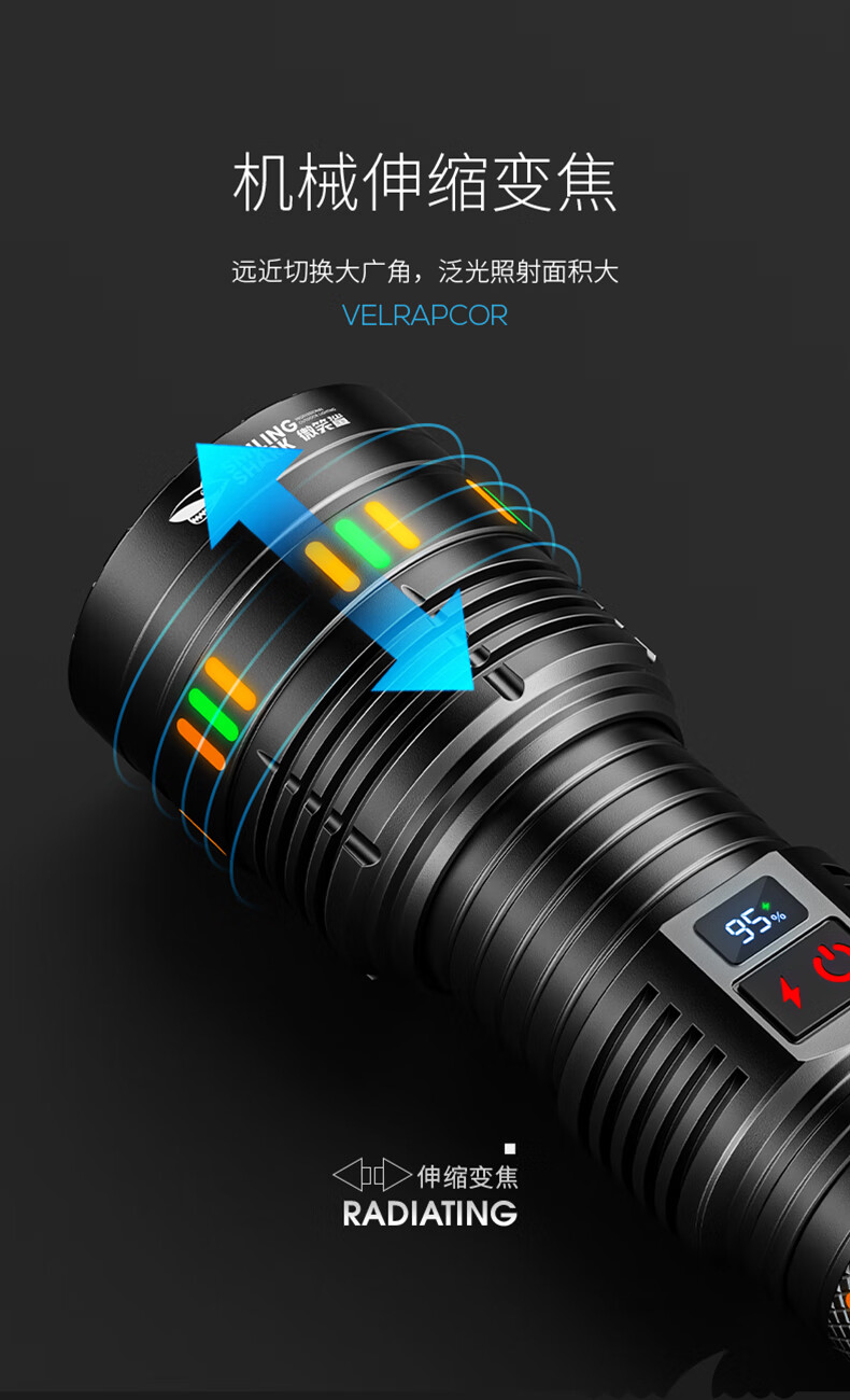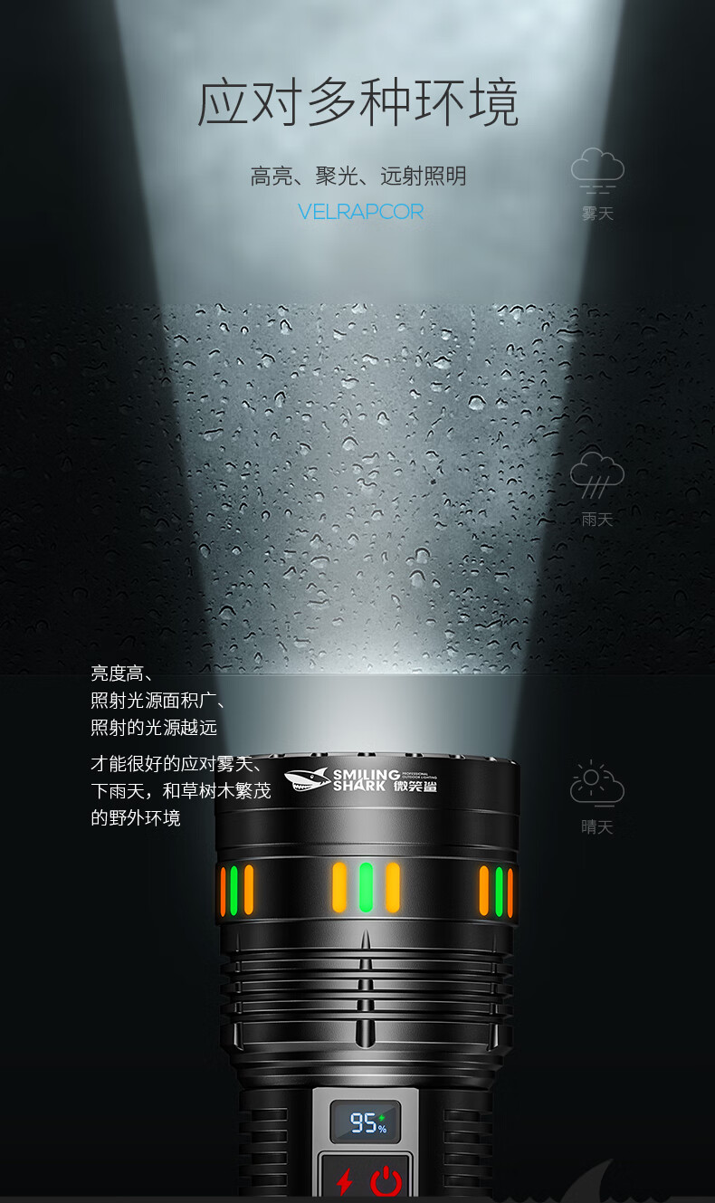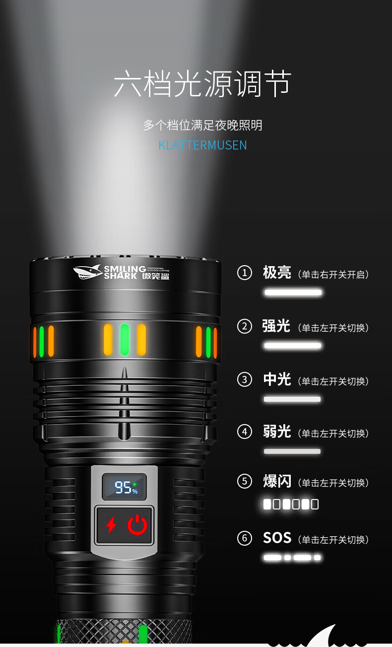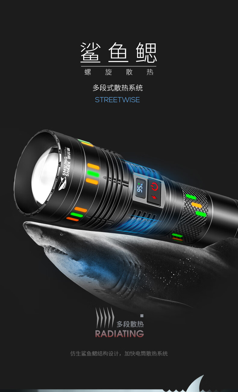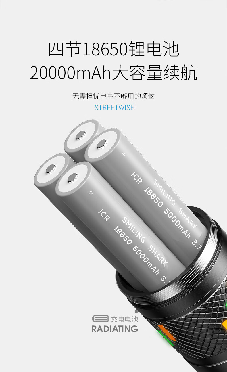 微笑鲨夜魂强光手电筒超长续航户外充电应急灯家用变焦远射激光探照灯 夜光长款-M80灯芯【8电】