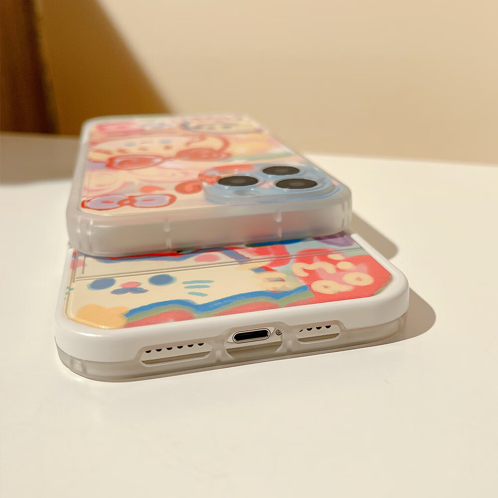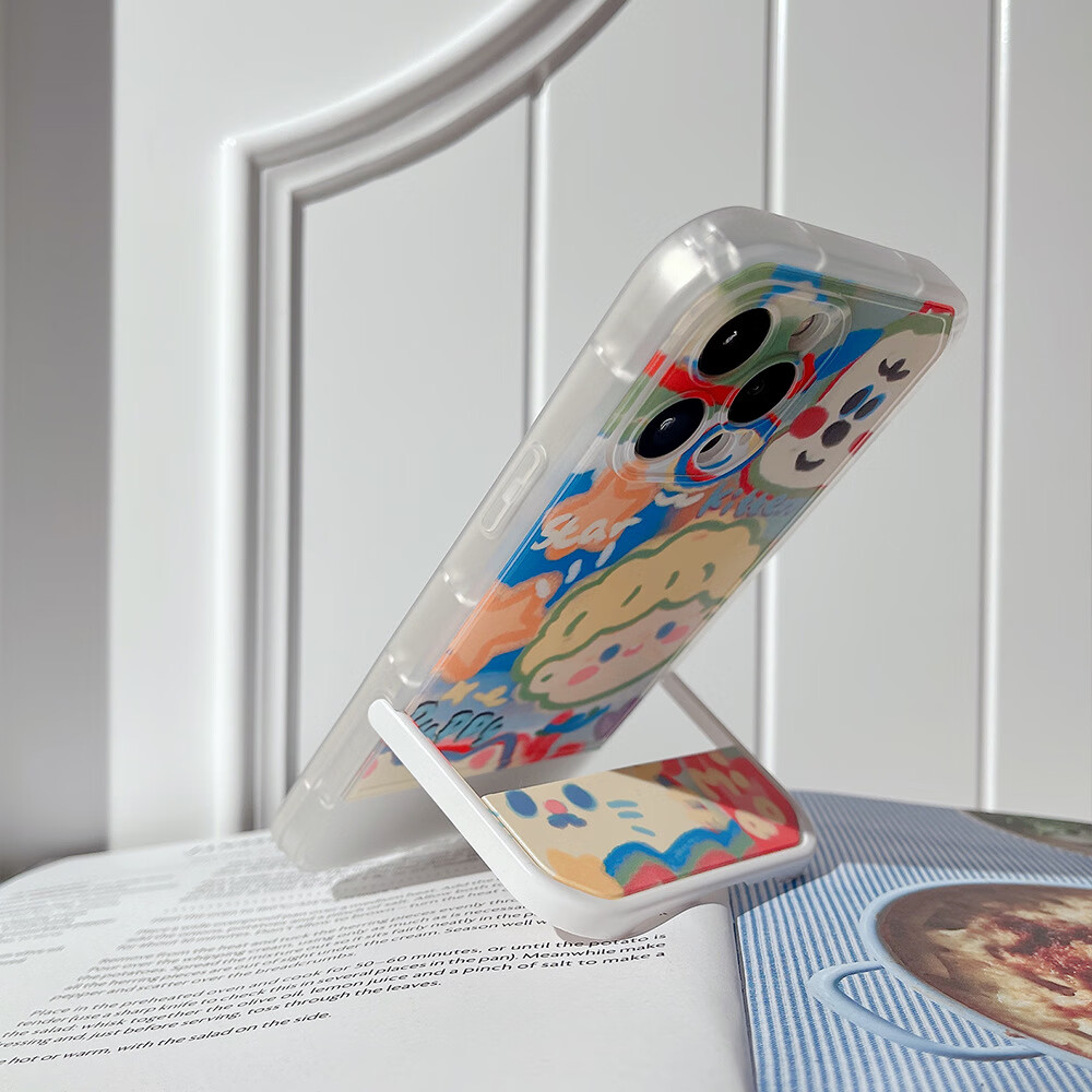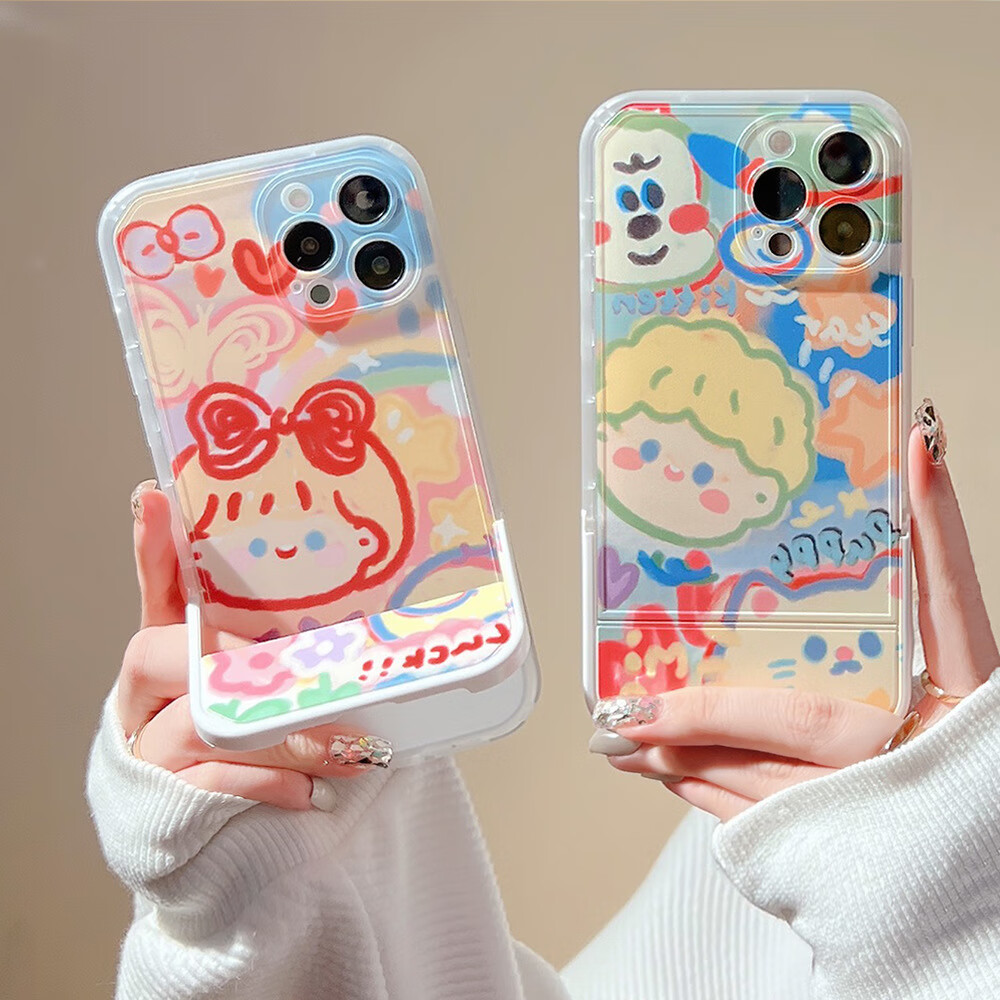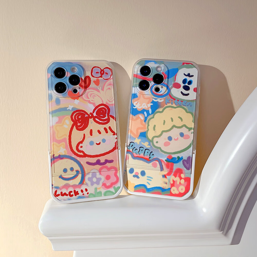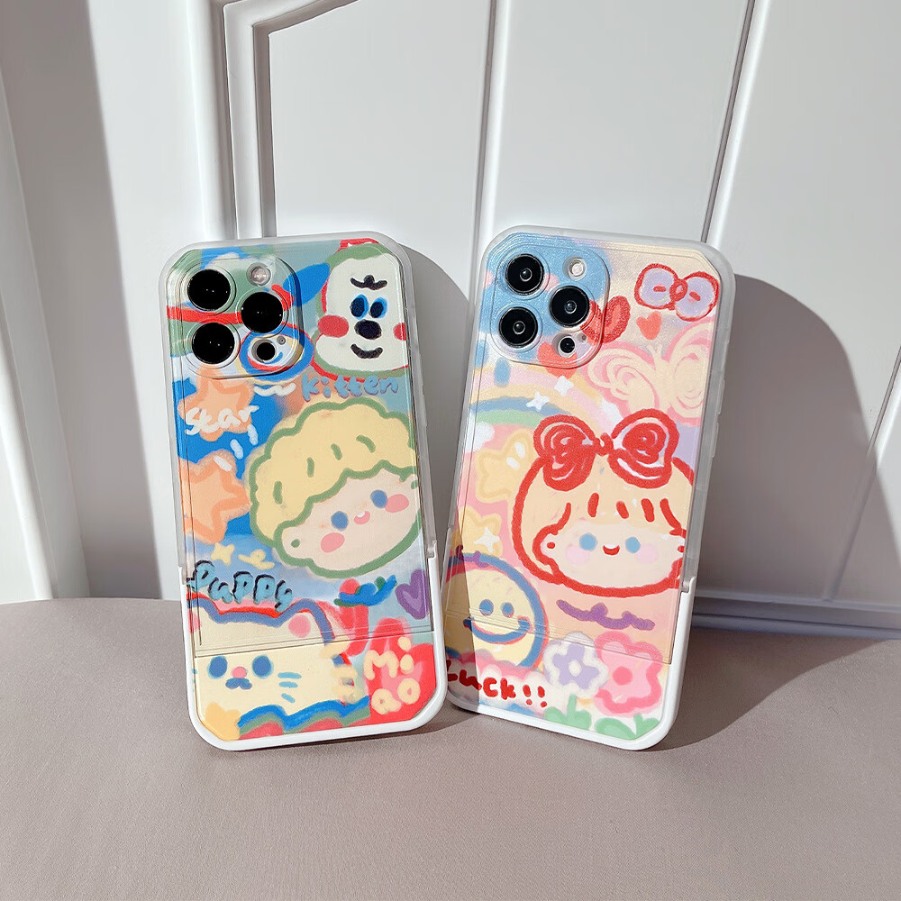 【实用】卡通情侣涂鸦15适用iPhone13promax苹果手机壳14隐形支架 白色宠物男孩 16promax