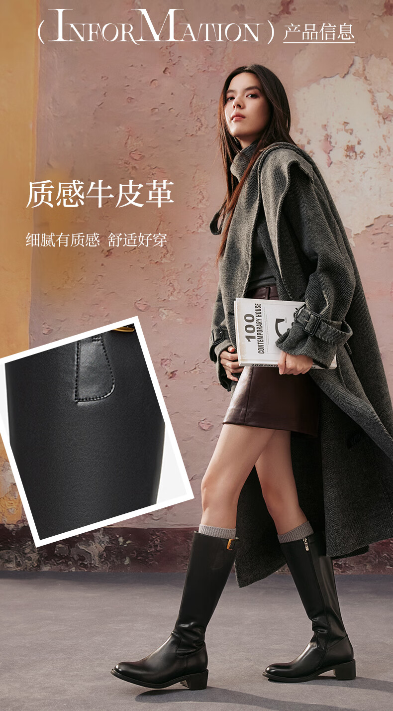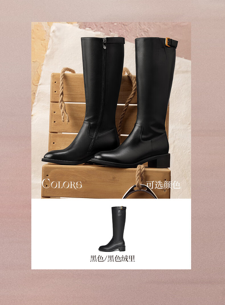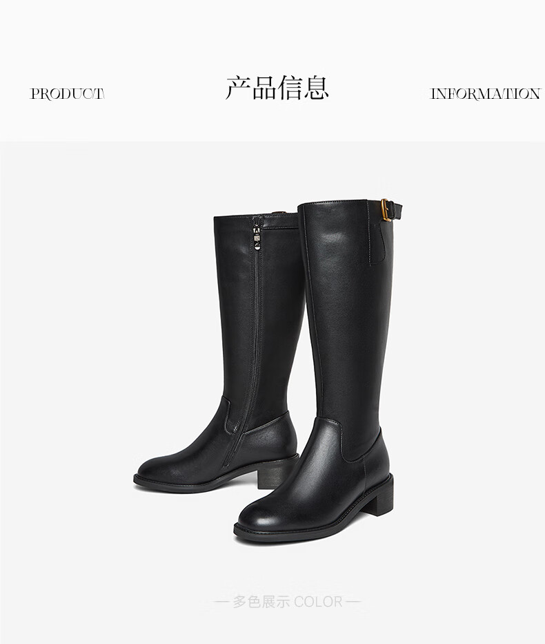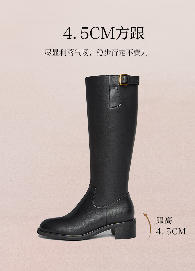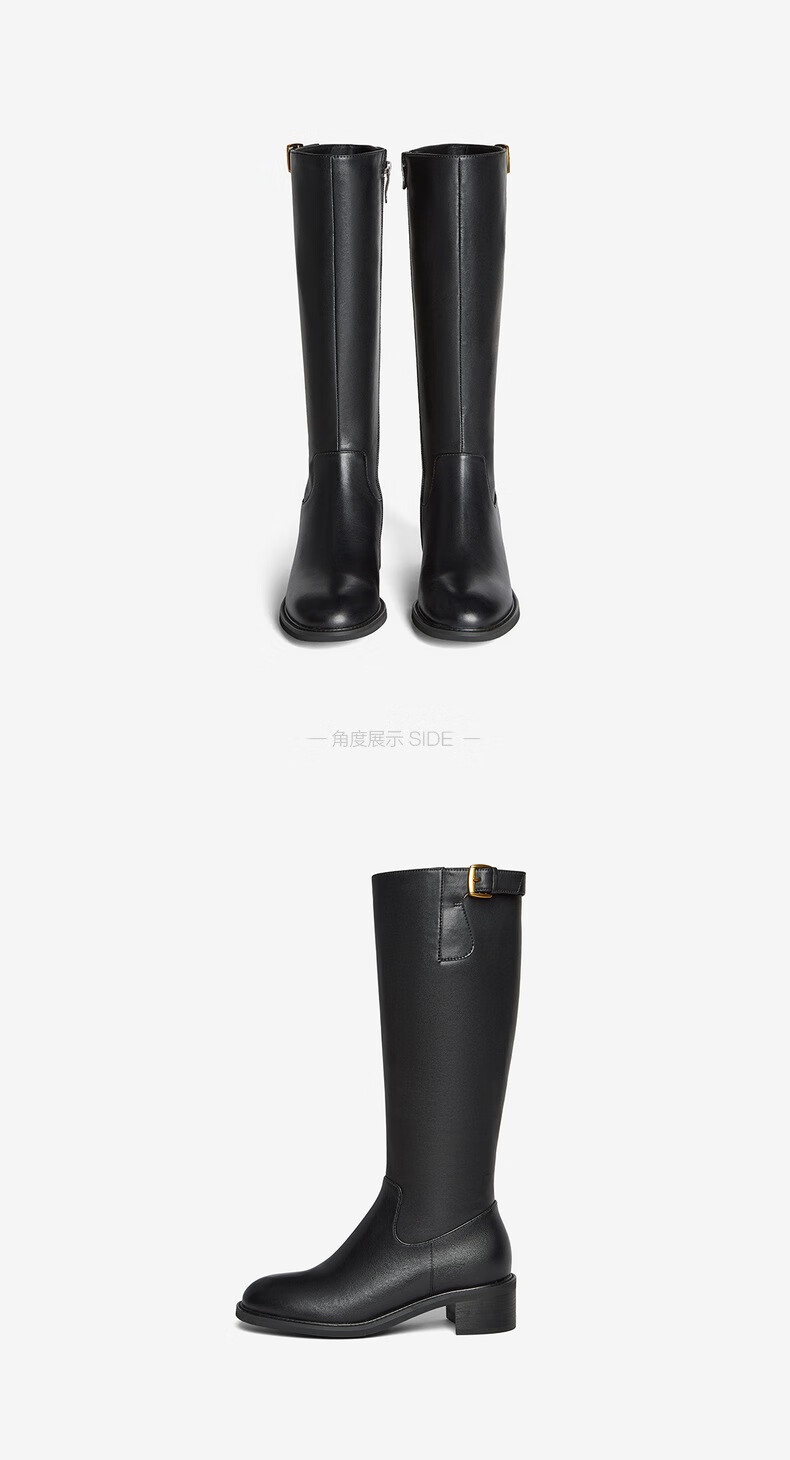 百思图25冬新款牛皮圆头粗跟骑士靴通勤女大筒围高筒长靴AX891DG5 黑色 37