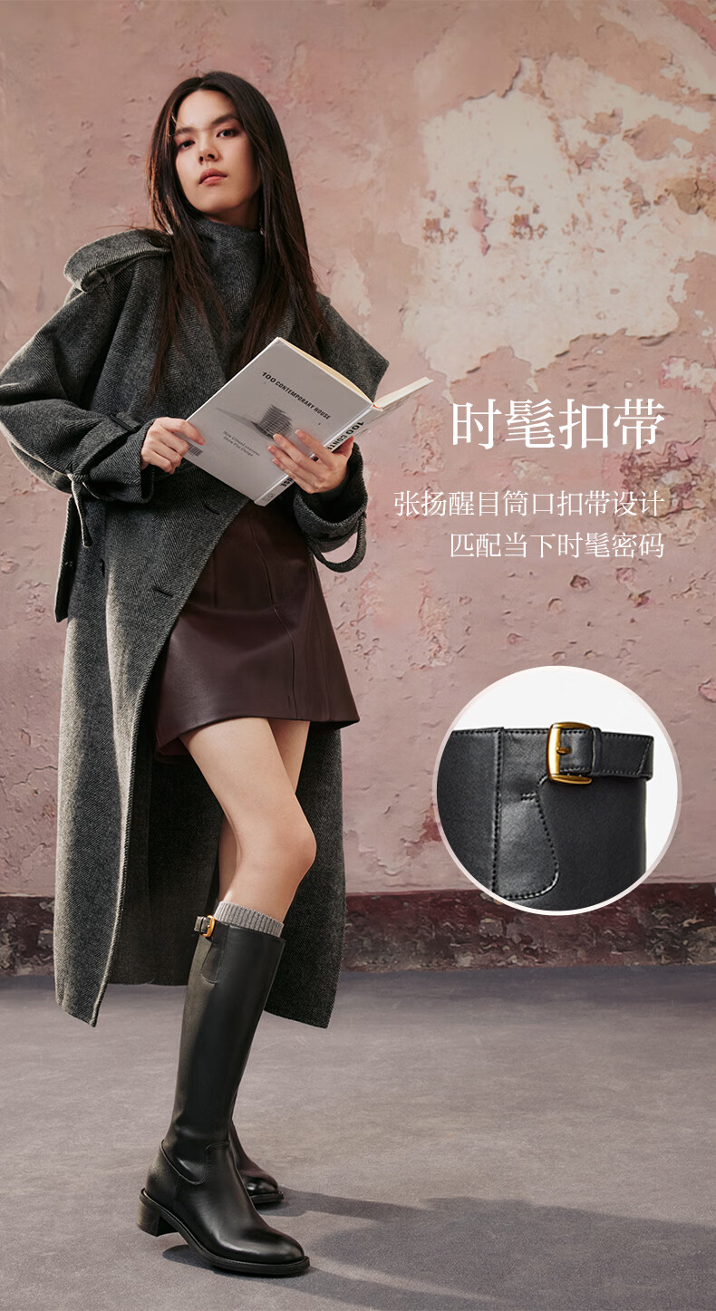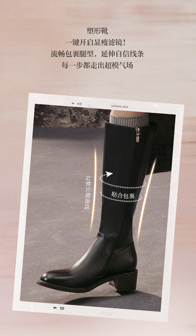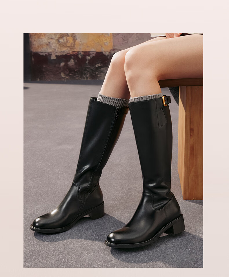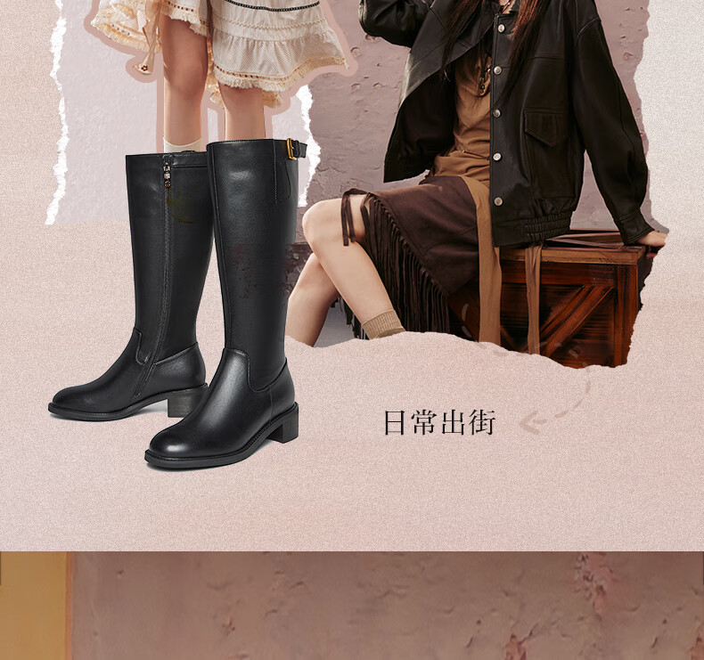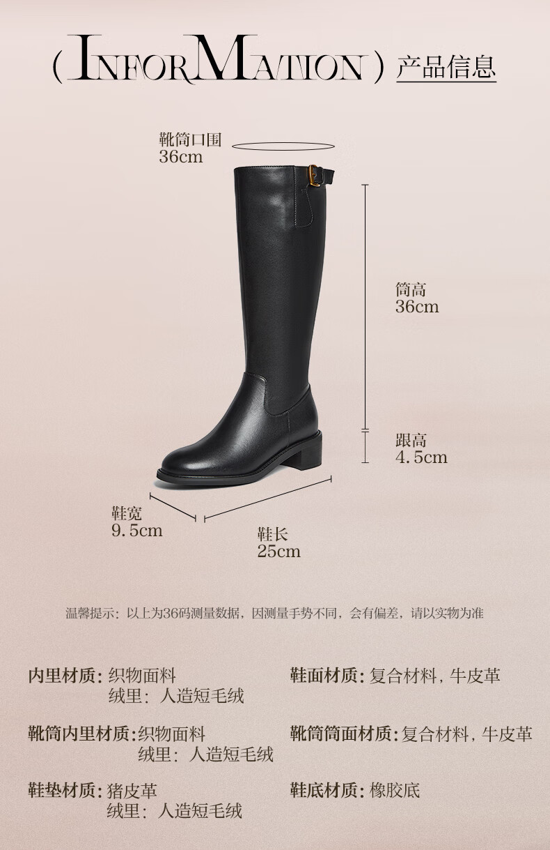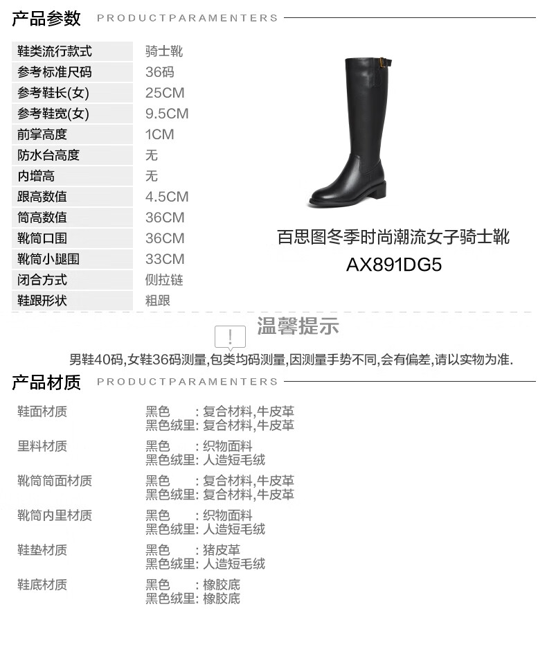 百思图25冬新款牛皮圆头粗跟骑士靴通勤女大筒围高筒长靴AX891DG5 黑色 37