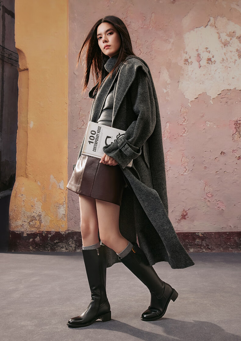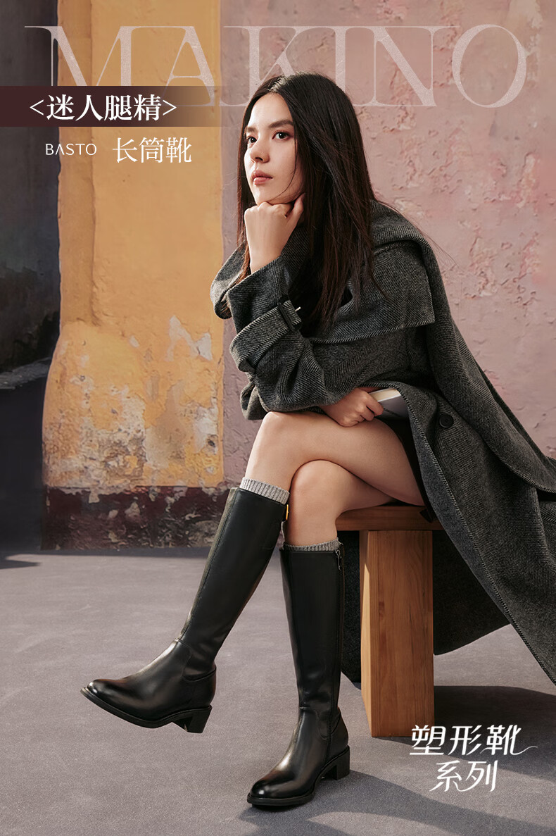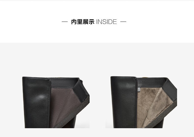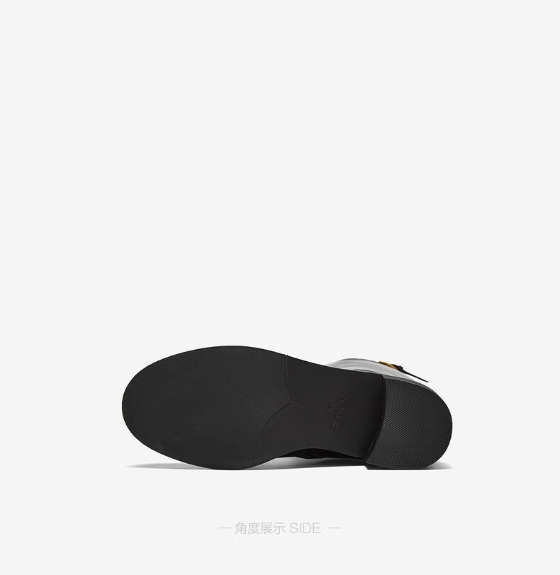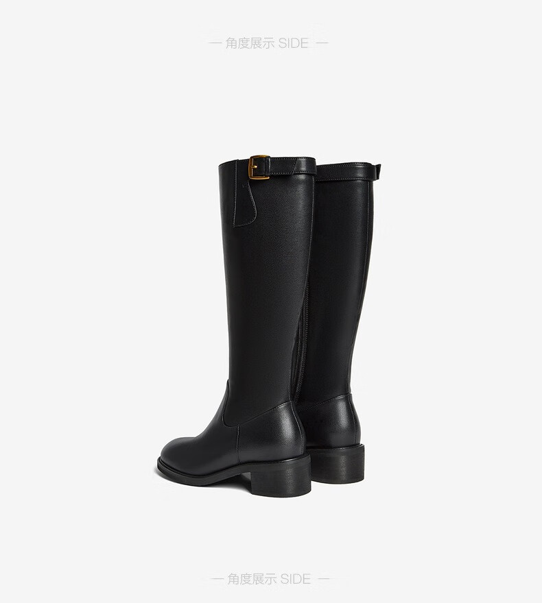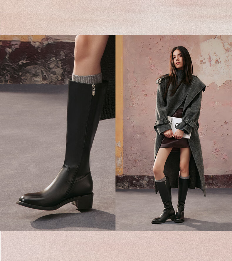 百思图25冬新款牛皮圆头粗跟骑士靴通勤女大筒围高筒长靴AX891DG5 黑色 37