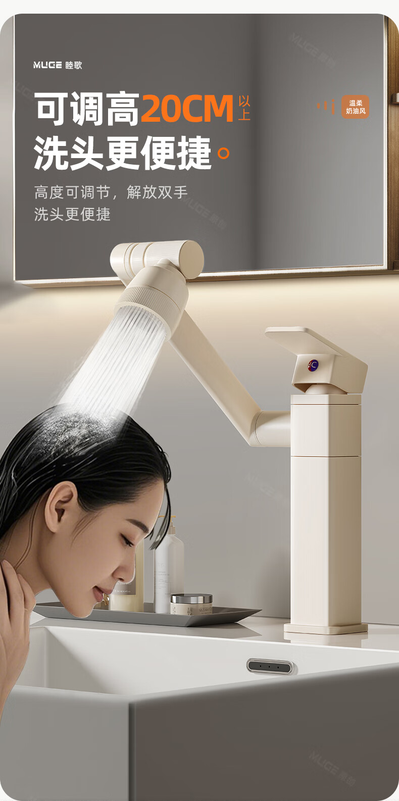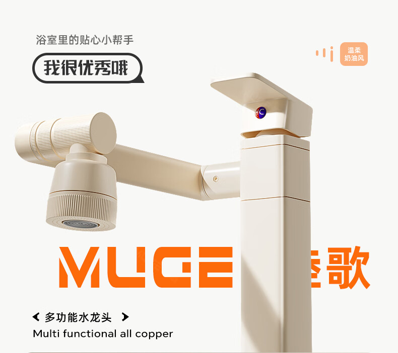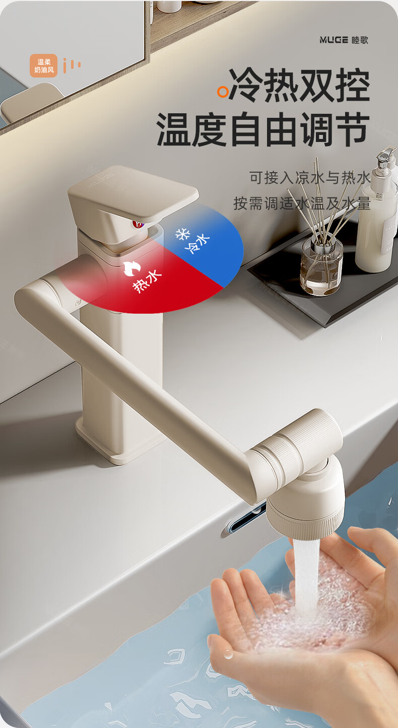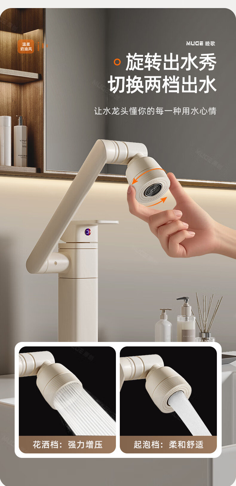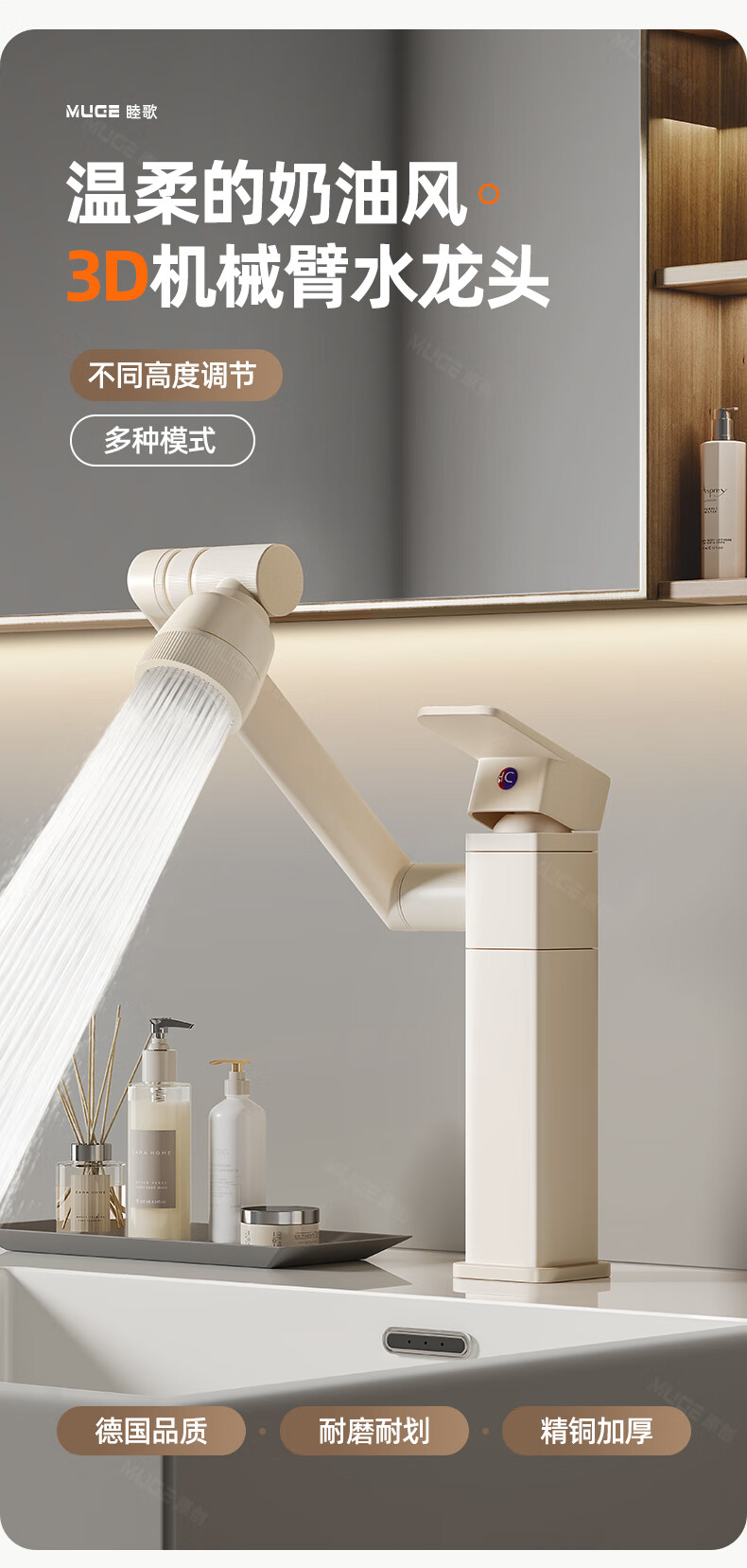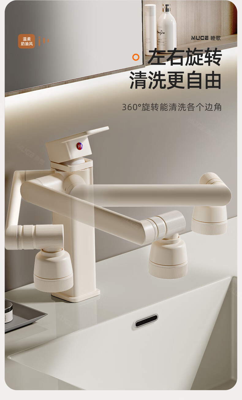 睦歌(MUGE)卫生间洗脸盆面盆水龙头洗手盆冷热浴室柜洗漱台机械臂万向水龙头 全铜加厚【奶油风】厨卫通用水龙头