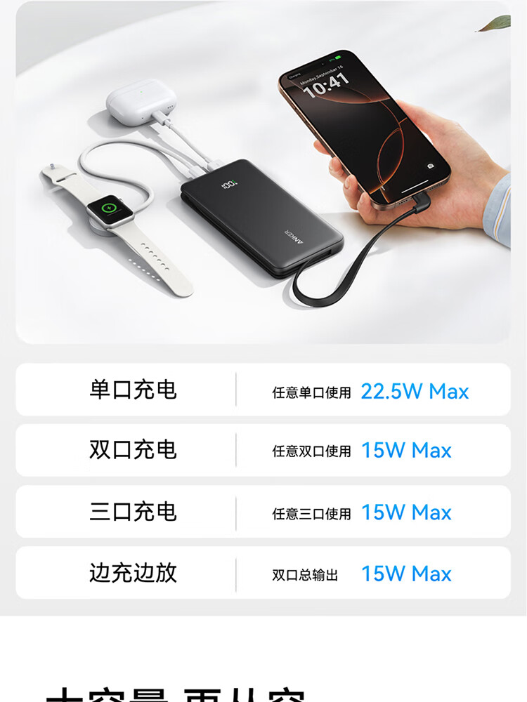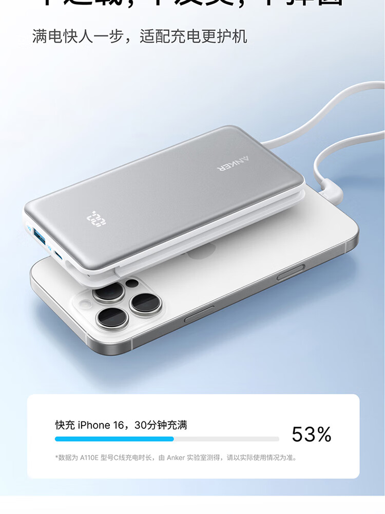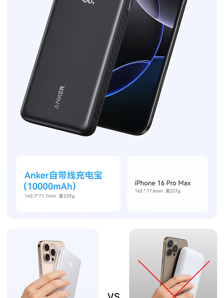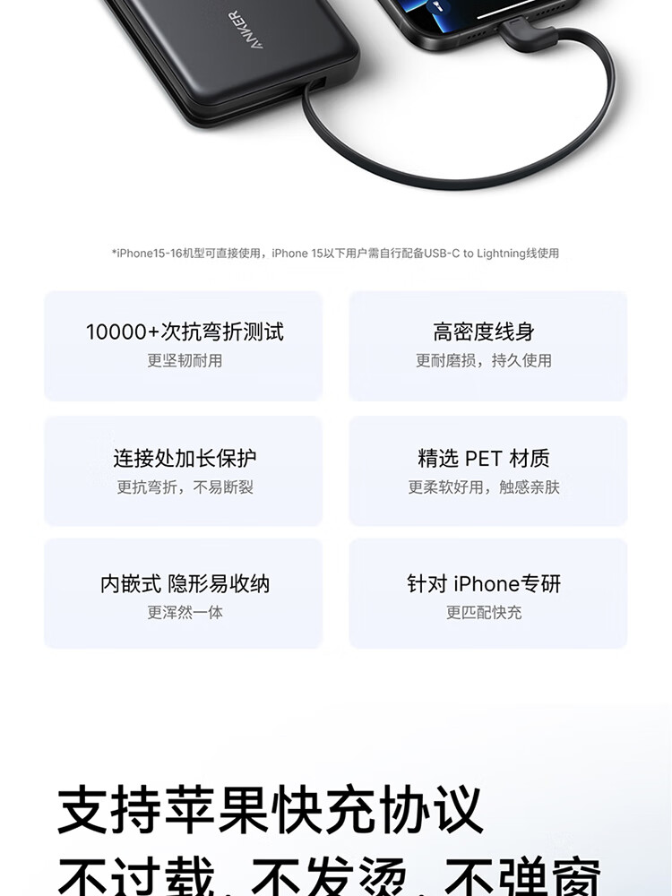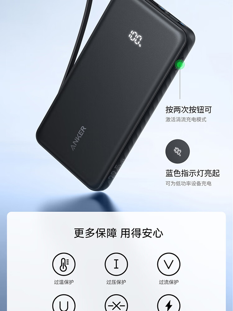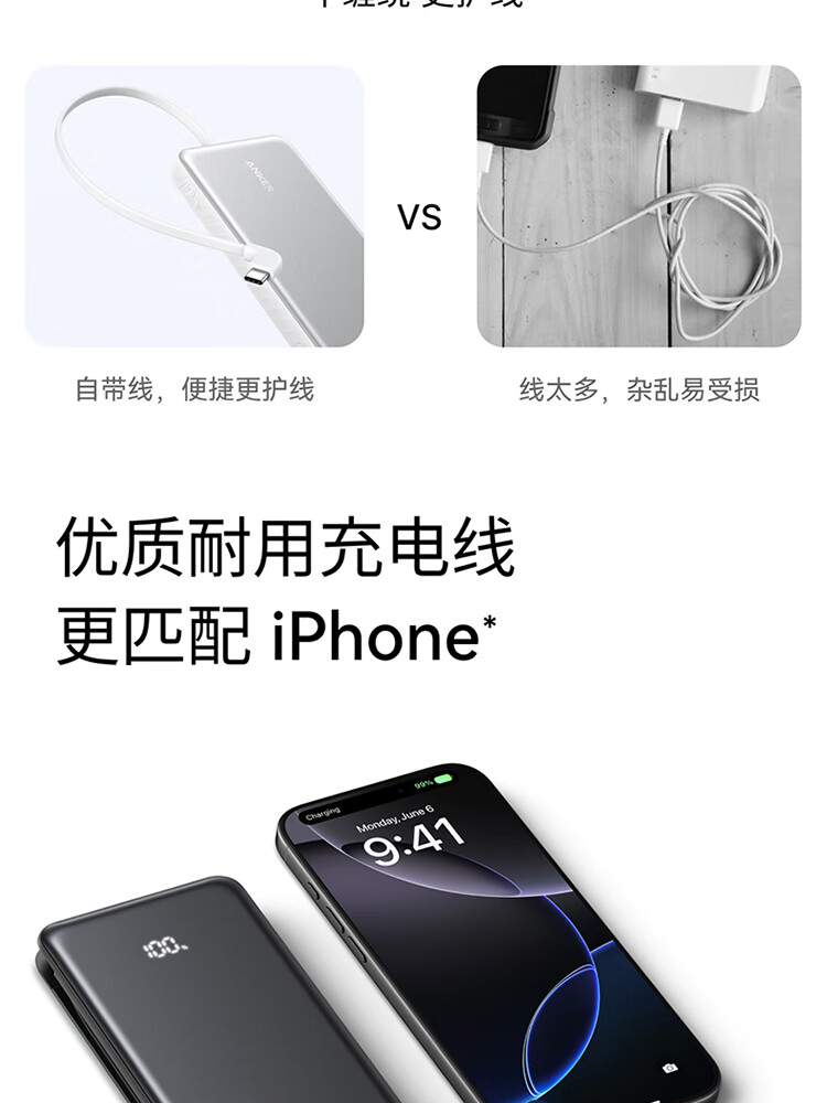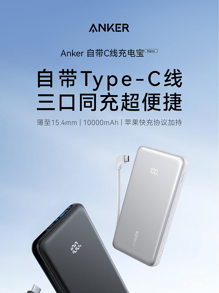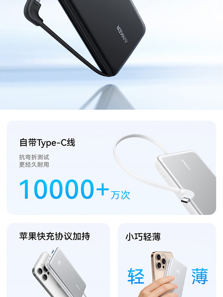 ANKER安克【新3C认证可上飞机,苹果17/iPhone16】自带type-c线充电宝快充10000mAh移动电源黑适用安卓