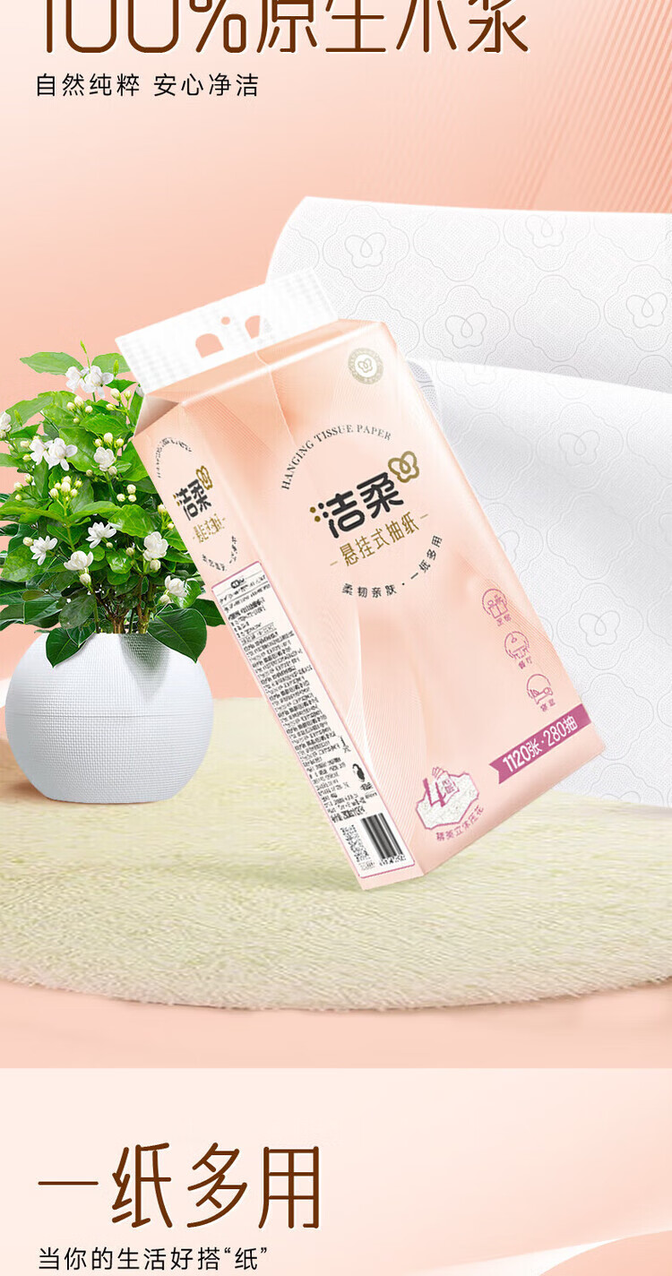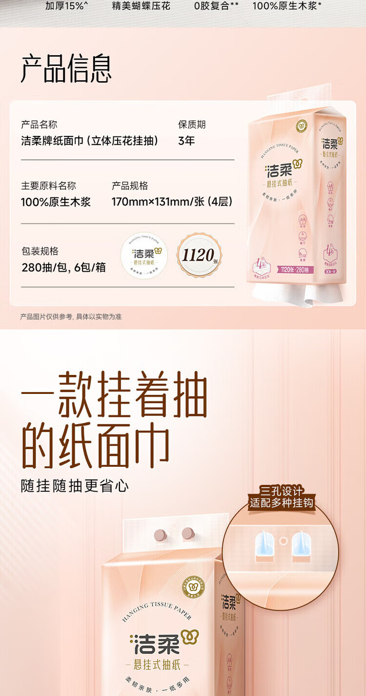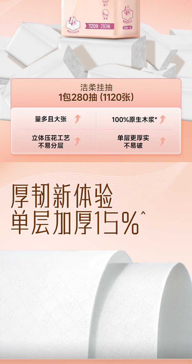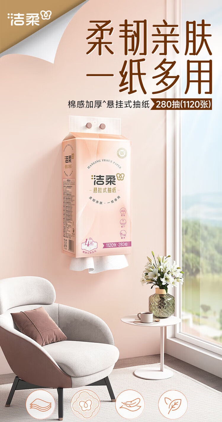 洁柔便利抽挂抽纸大包悬挂式抽纸4层280抽厕所挂壁式厕纸卫生纸巾hd 4层1120张*2提