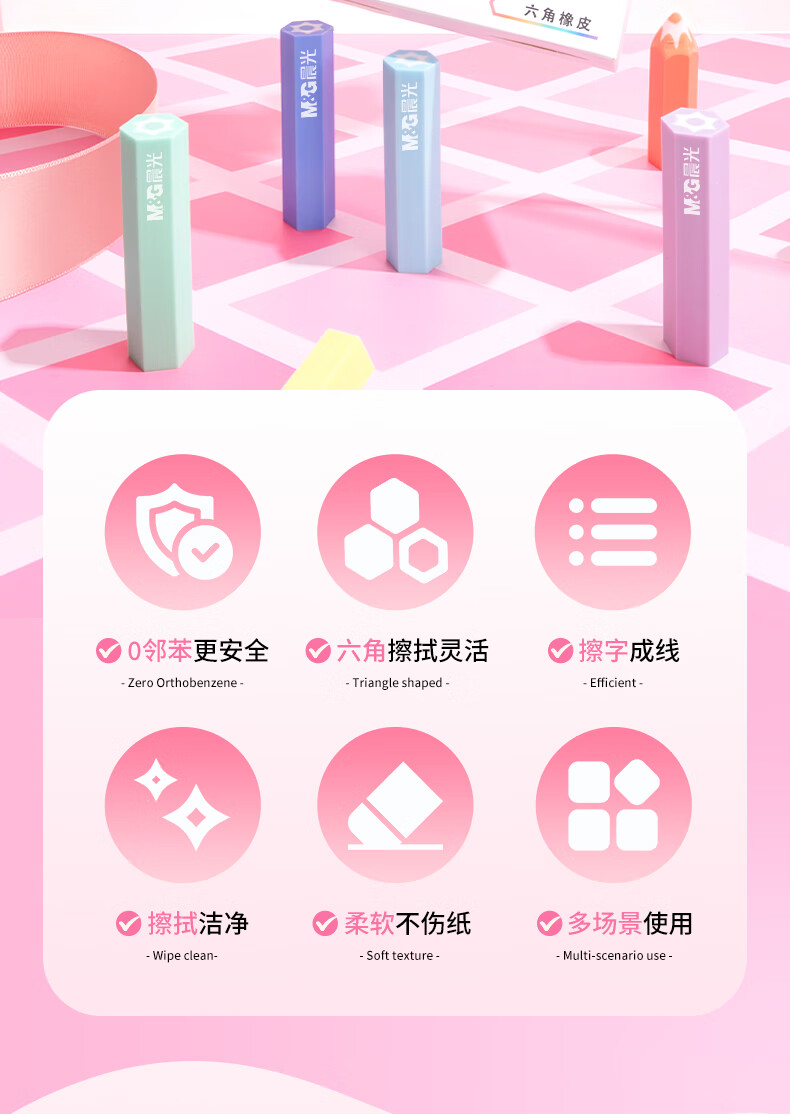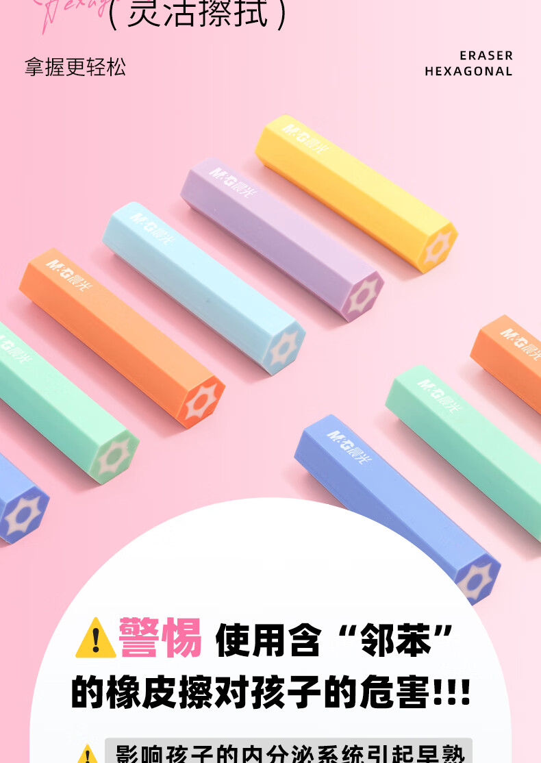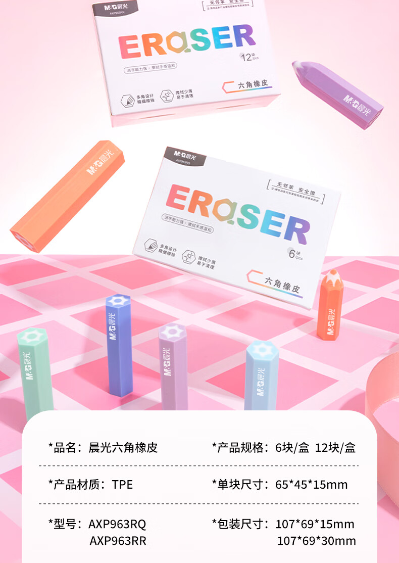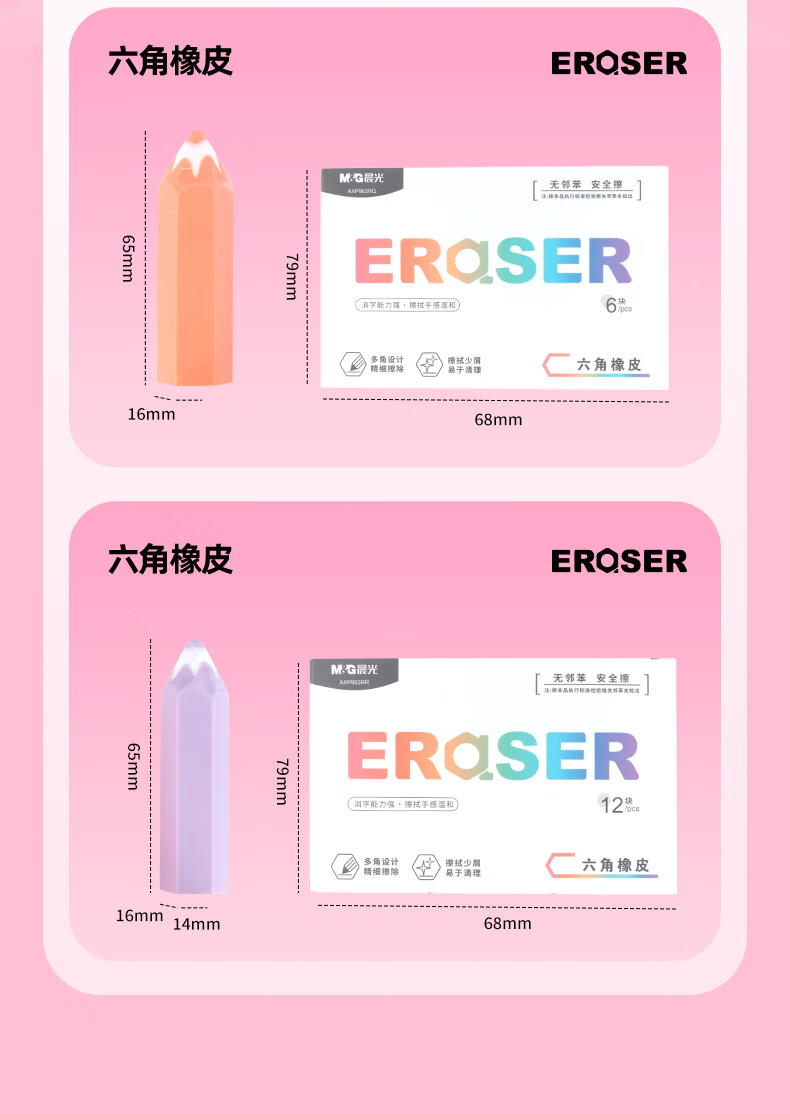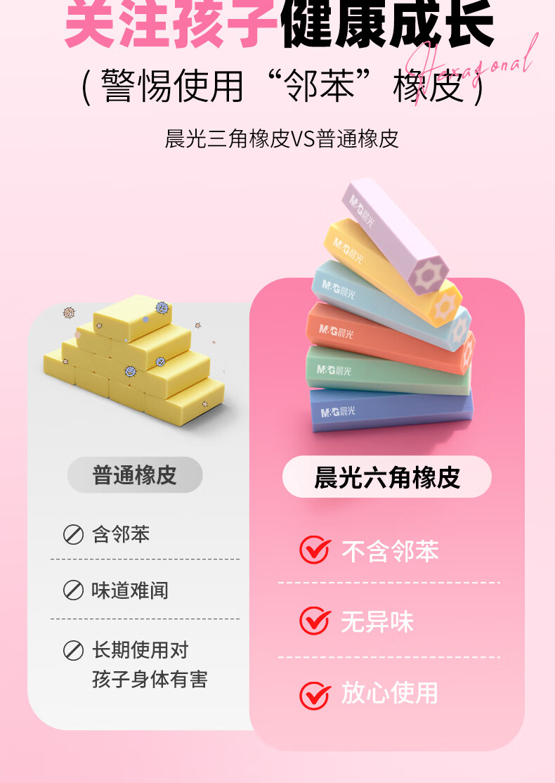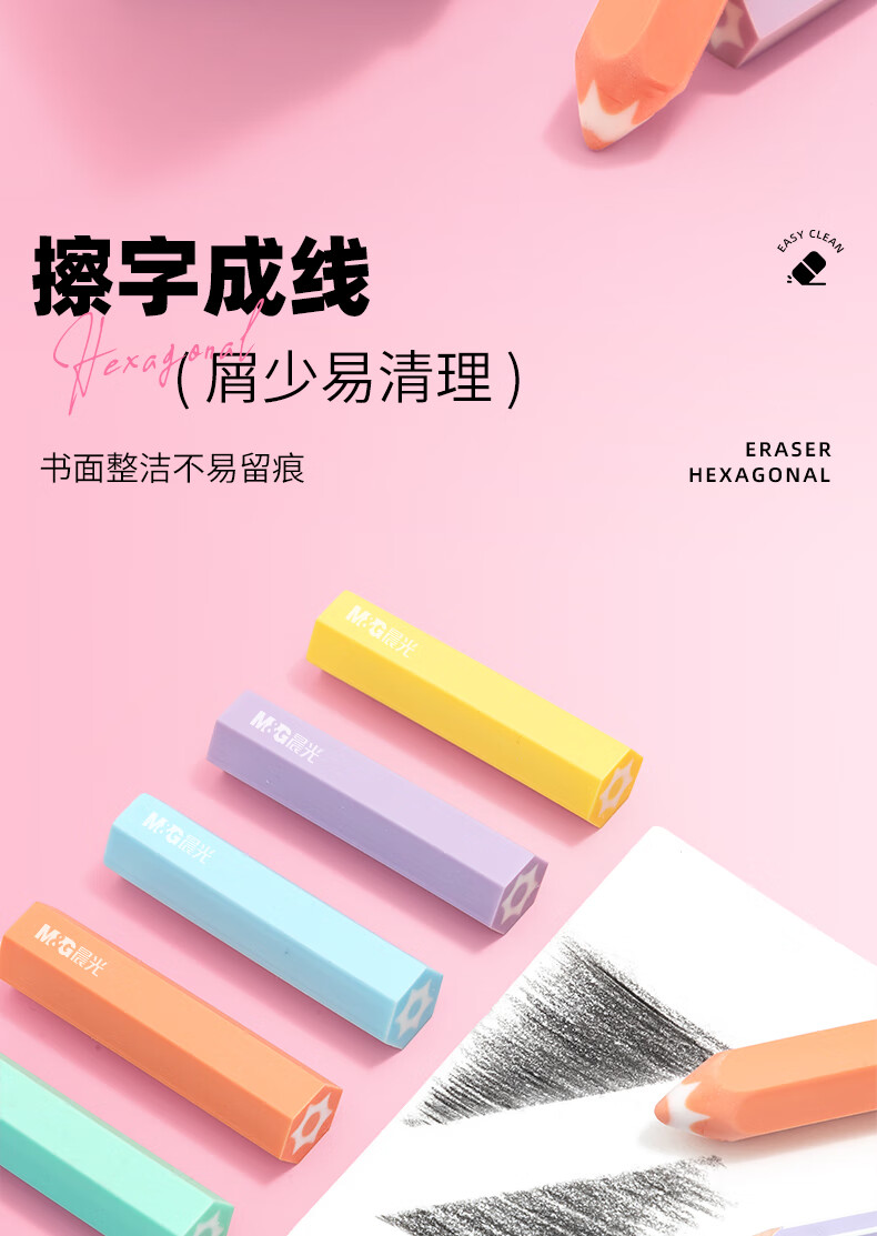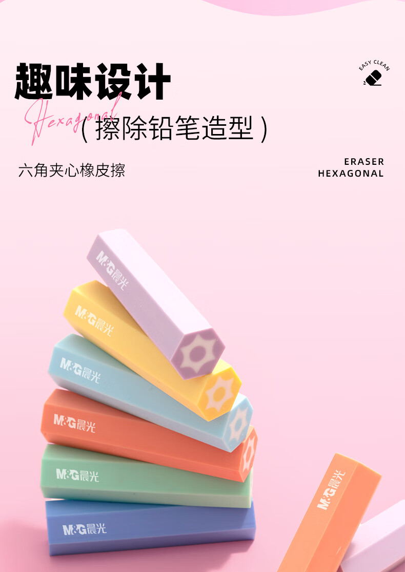晨光(M&G)文具橡皮擦无屑干净小学生专用铅笔橡皮 彩色六角夹心橡皮6个装 AXP963RQ