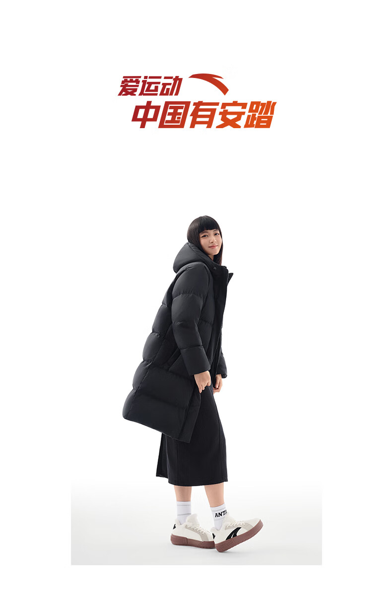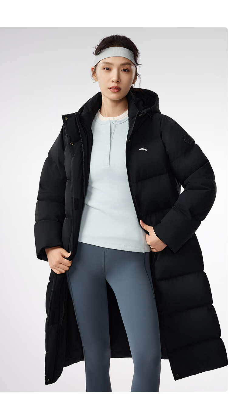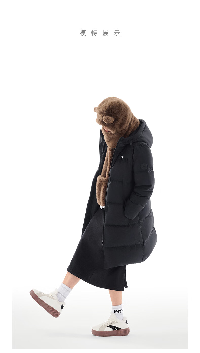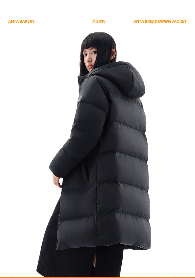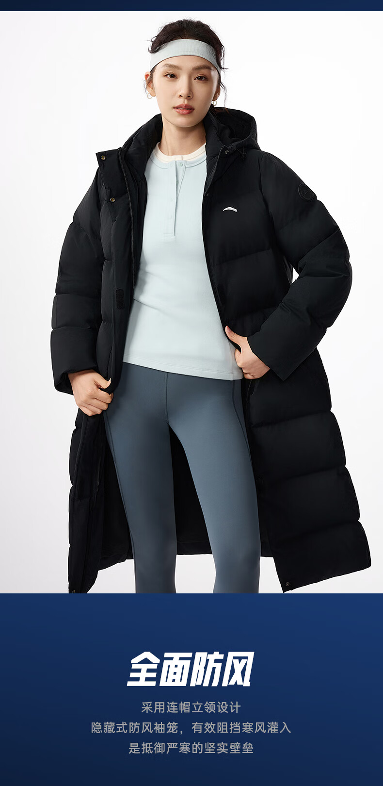 安踏(ANTA)面包羽绒丨中长款连帽羽绒服女装冬季新款防泼水加厚鸭绒保暖外套 【黑巧法棍-中长款】基础黑-3 M (充绒量175)