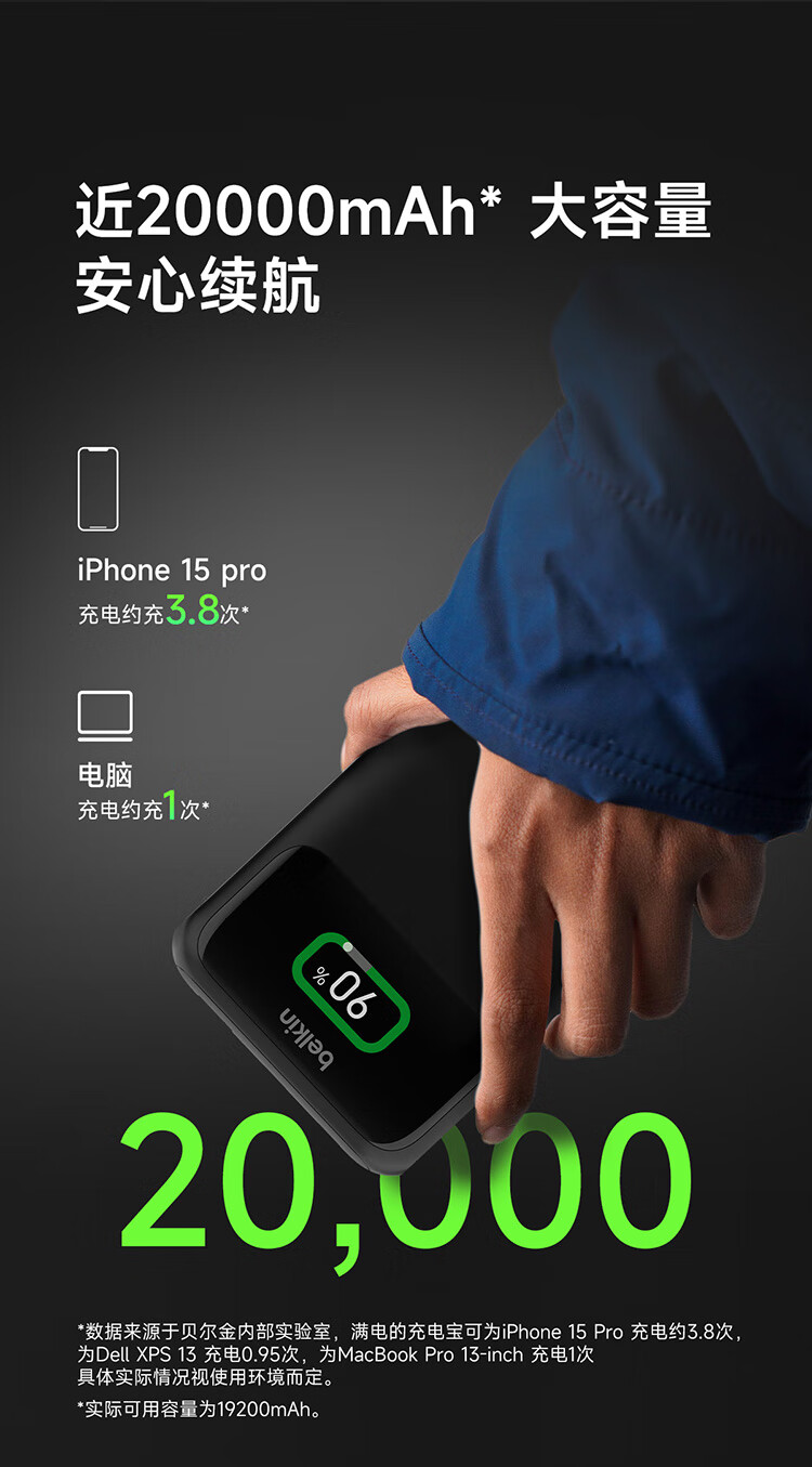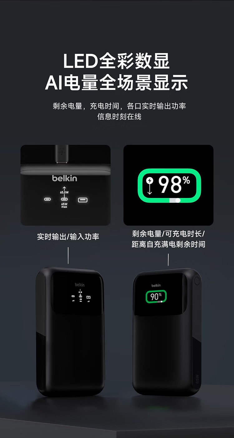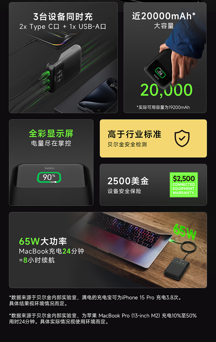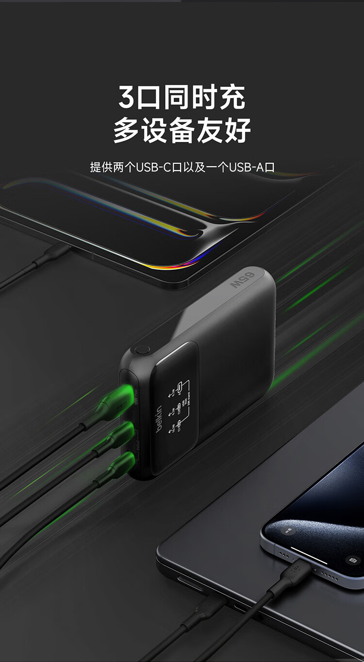 贝尔金(BELKIN)【3C及多国认证】充电宝2万毫安 65W双向快充Type-C充电宝 3口输出移动电源大容量手机电源 BPB020