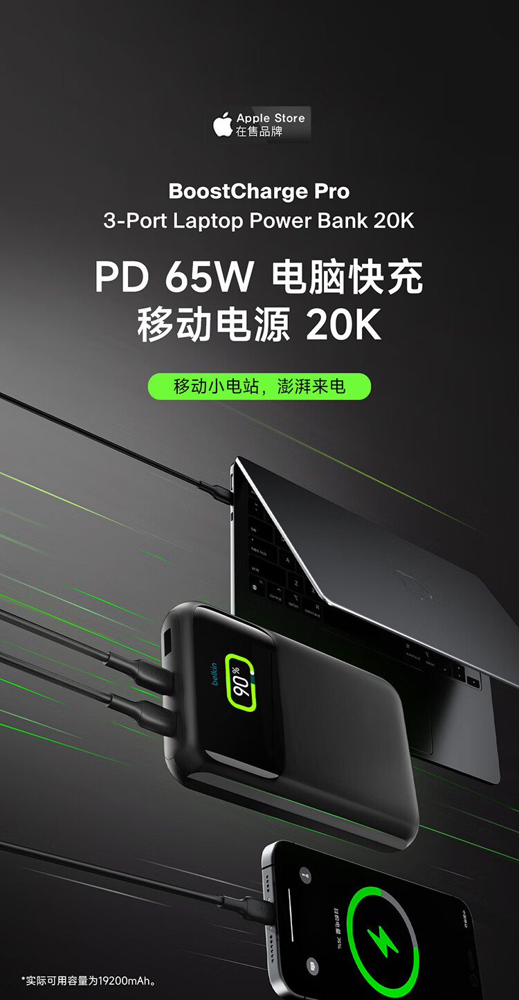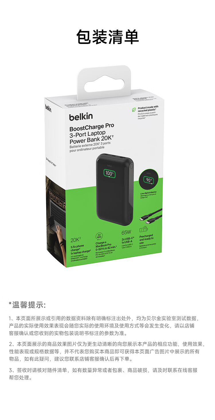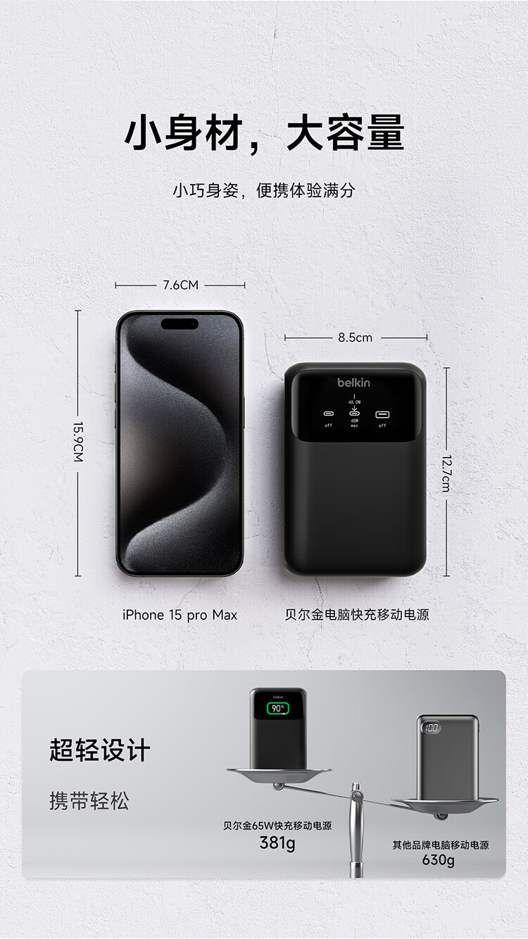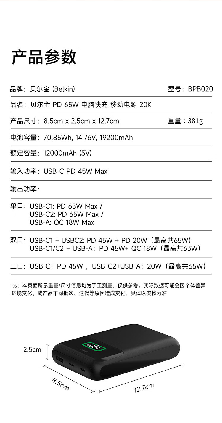贝尔金(BELKIN)【3C及多国认证】充电宝2万毫安 65W双向快充Type-C充电宝 3口输出移动电源大容量手机电源 BPB020