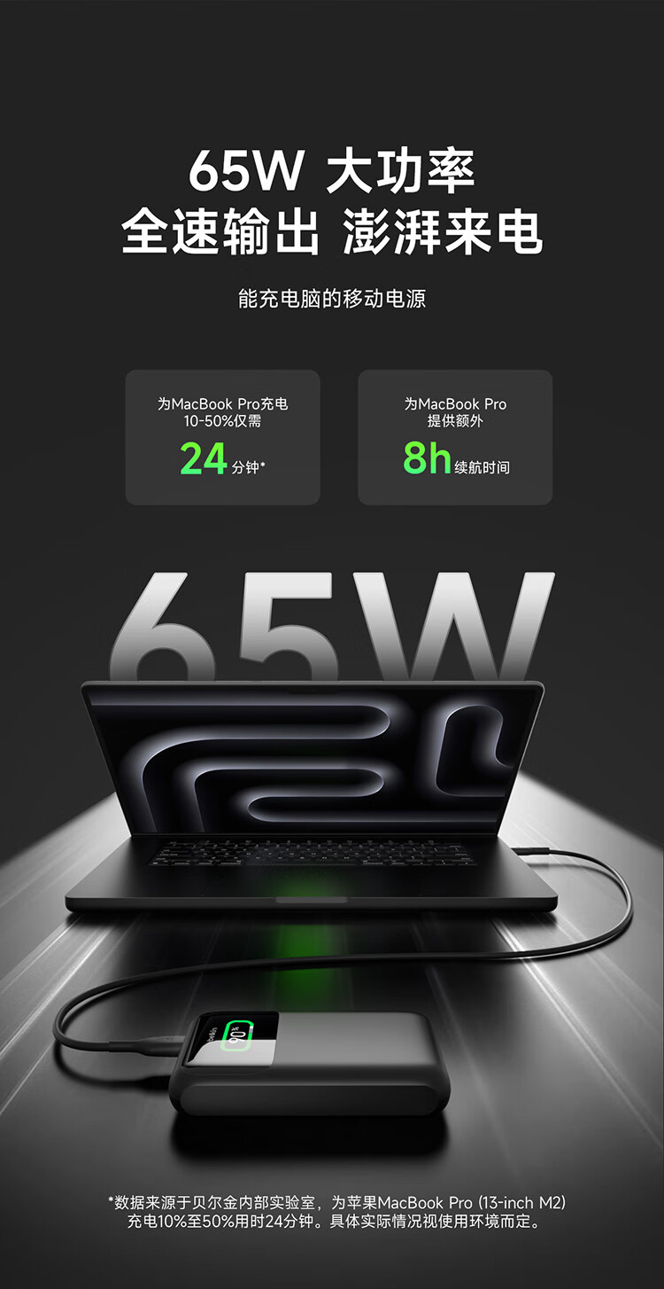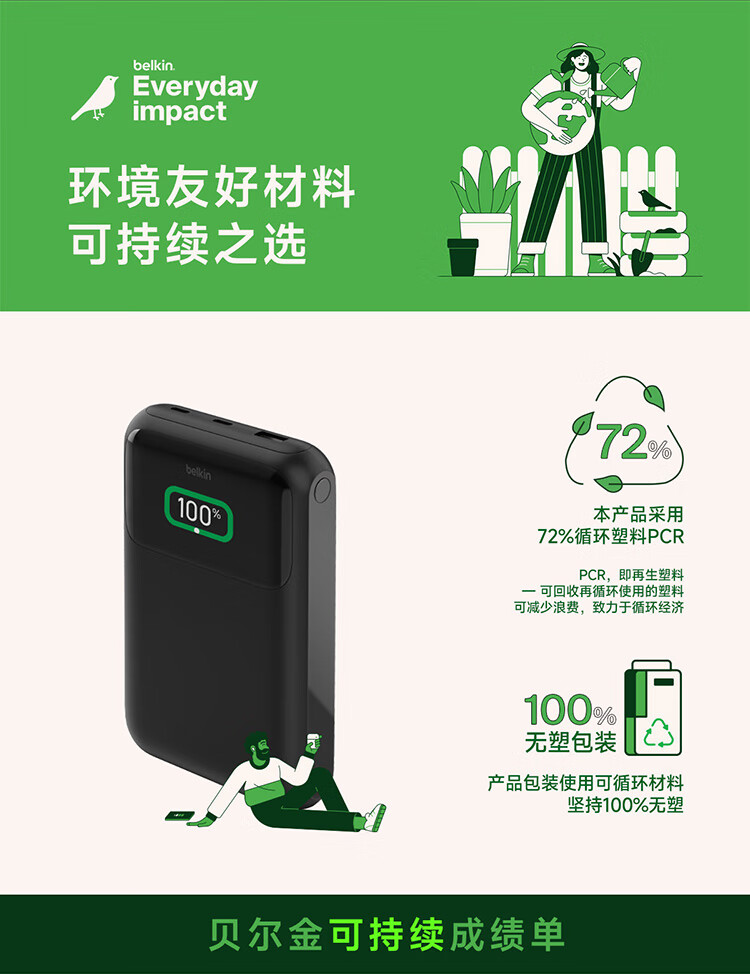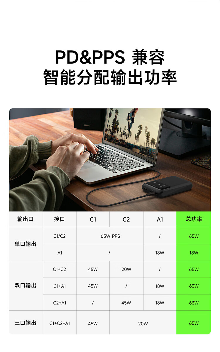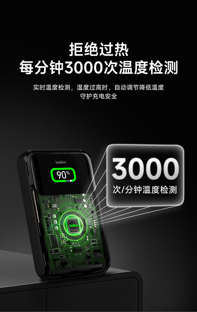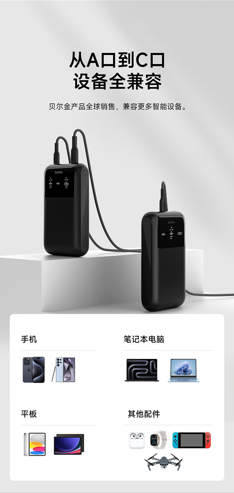 贝尔金(BELKIN)【3C及多国认证】充电宝2万毫安 65W双向快充Type-C充电宝 3口输出移动电源大容量手机电源 BPB020
