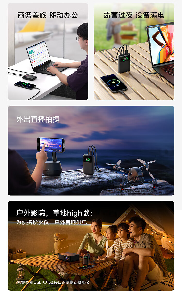 品胜【3C认证】充电宝自带双线20000毫安大容量可上飞机22.5W快充移动电源适用苹果17promax小米华为紫