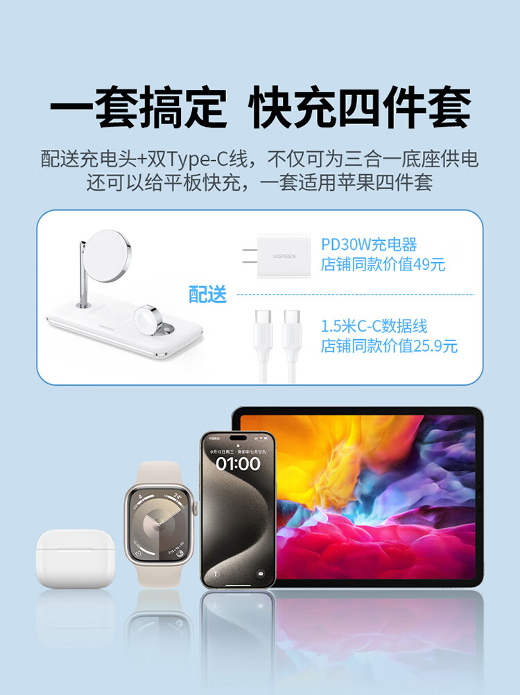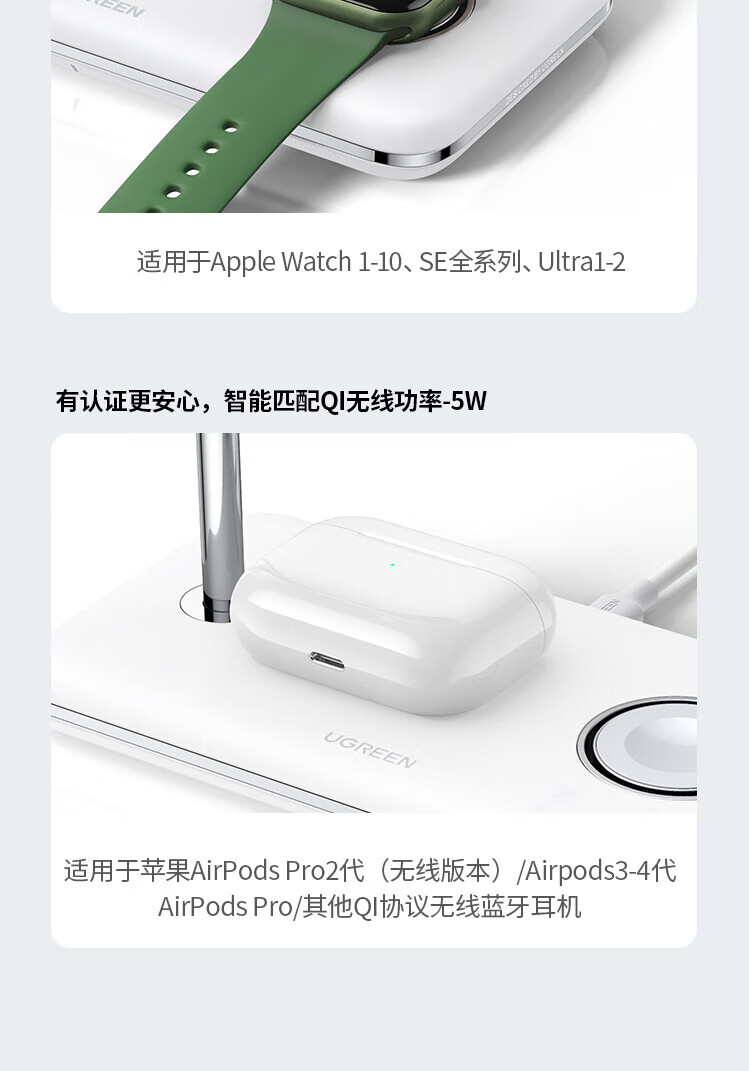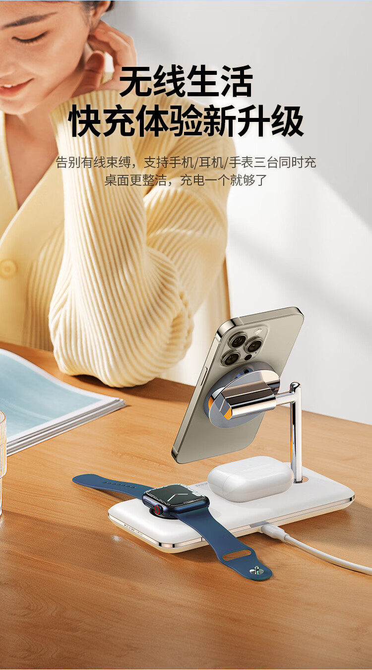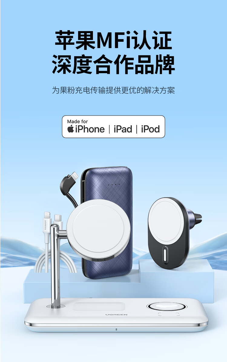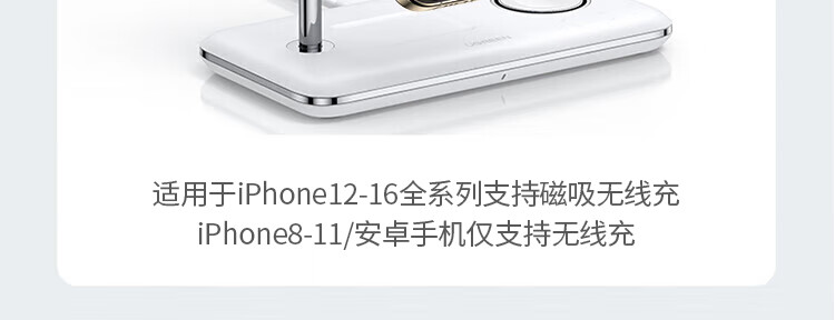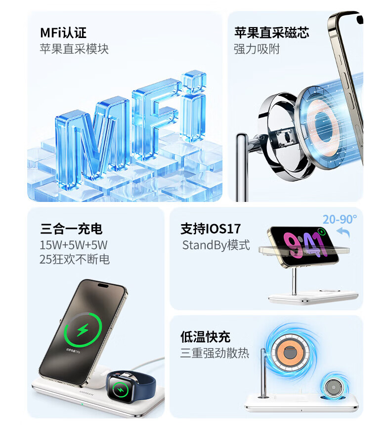 绿联MFi认证适用苹果三合一无线充电器MagSafe磁吸充电支架15W快充iPhone17/16/15/14苹果手表耳机通用