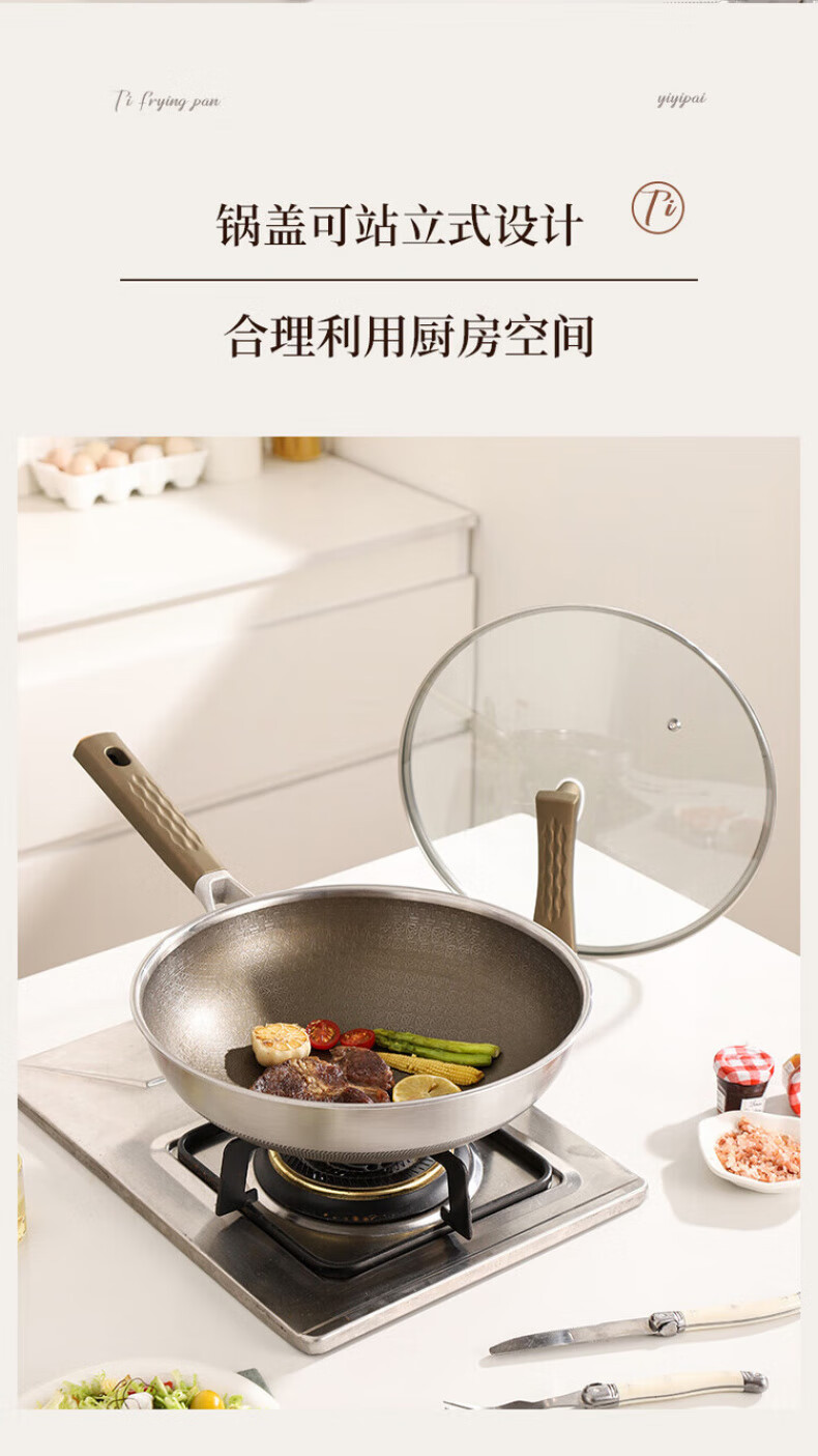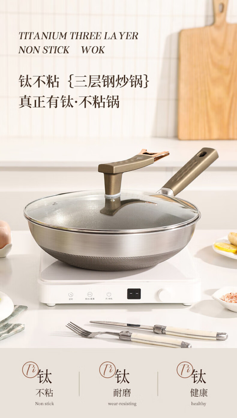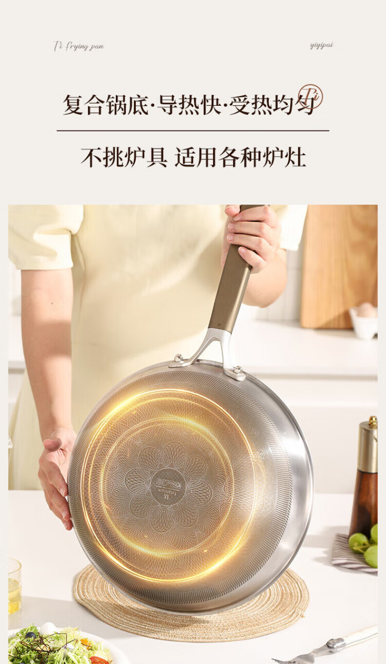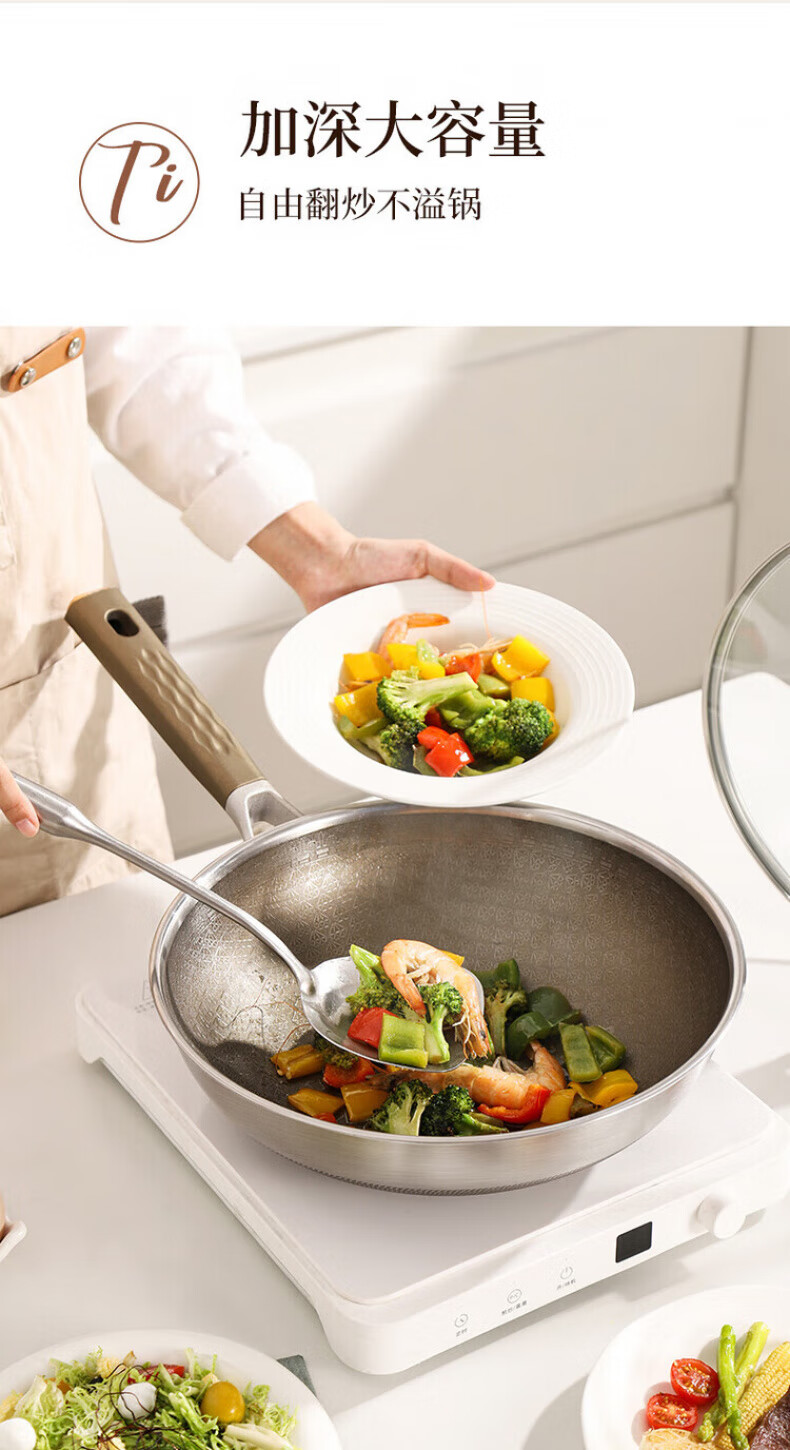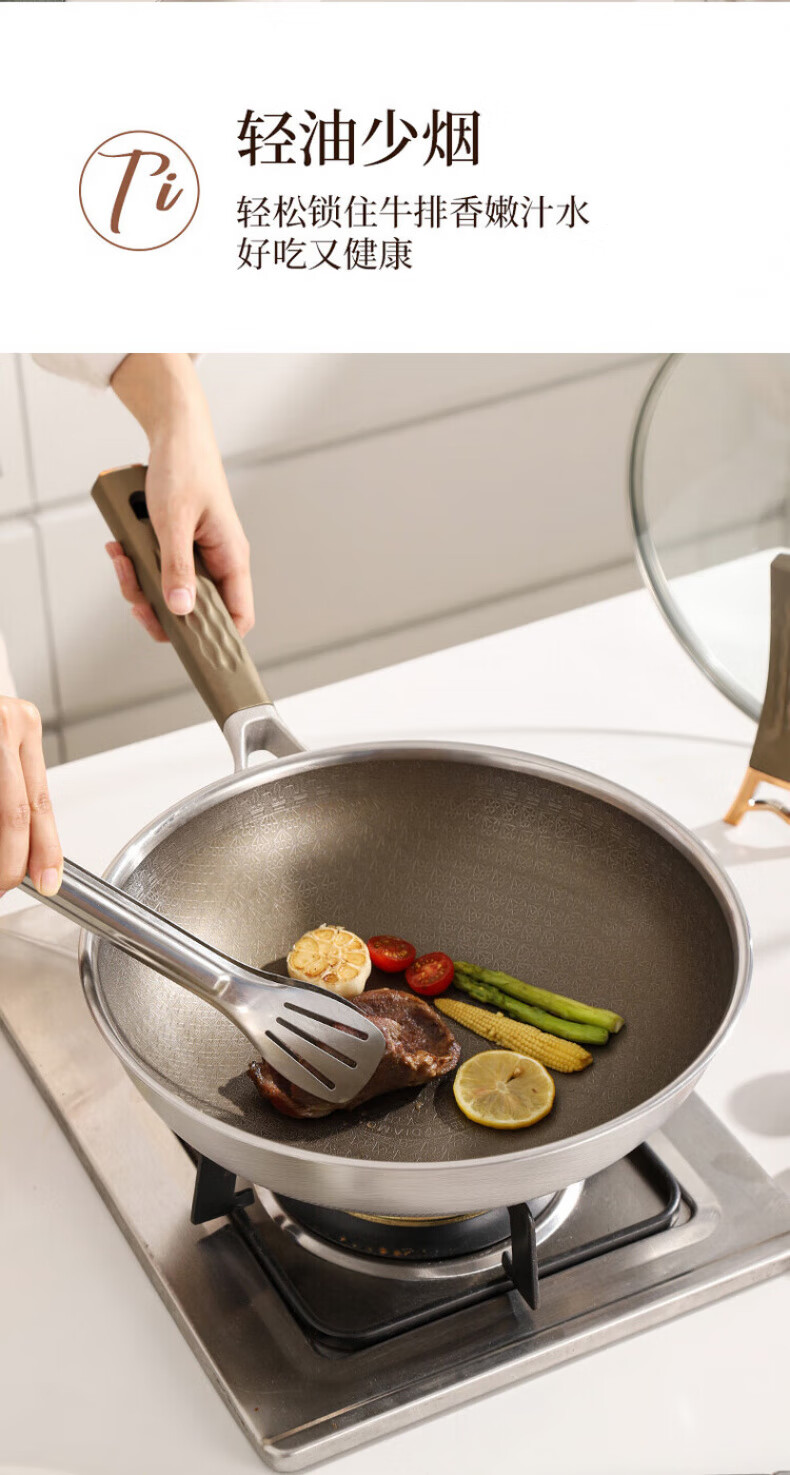 DEATKN德国316钛钢炒锅无涂层不粘锅炒菜锅家用电磁炉灶通用不锈钢钛锅 316L+双面钛【30CM无盖】60w次耐磨不粘 1寸