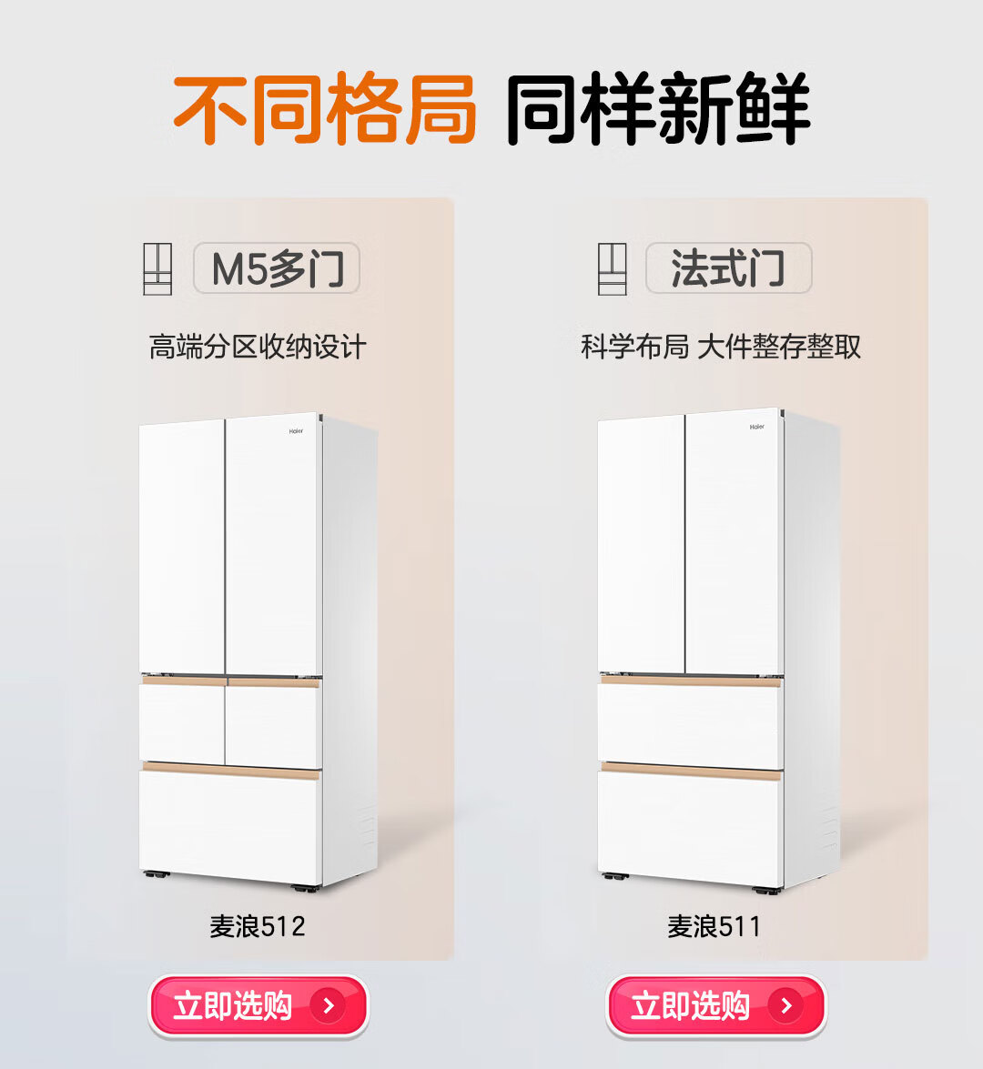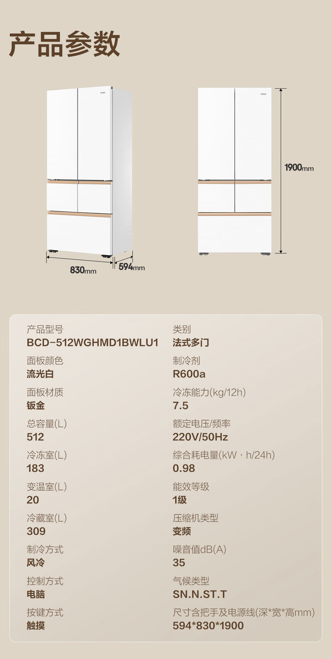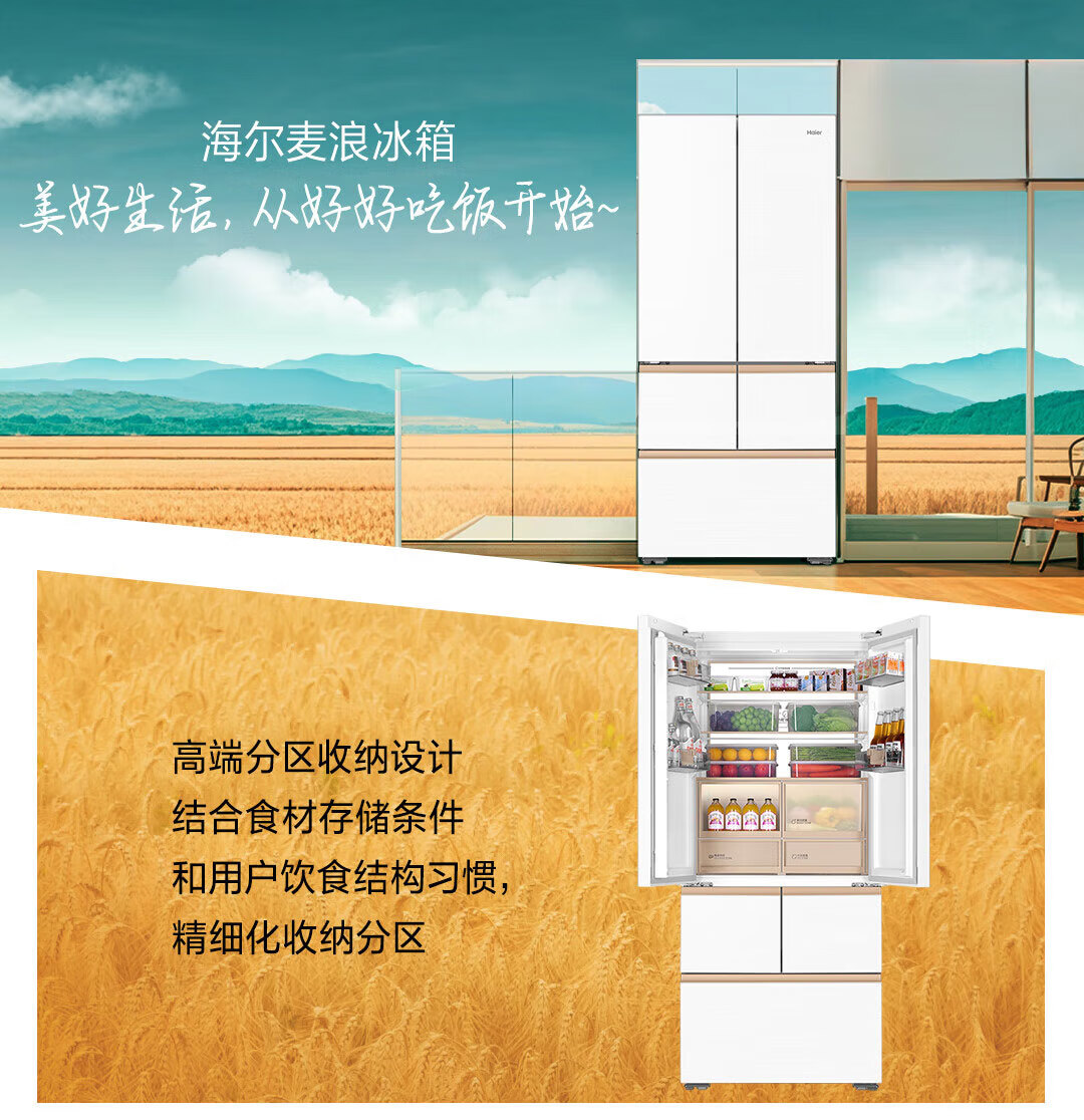 海尔(Haier)511/512升麦浪套系全空间保鲜594专业超薄零嵌法式多门EPP超净一级能效变温家用电冰箱国家补贴20% 五门BCD-512WGHMD1BWLU1咨询领补贴