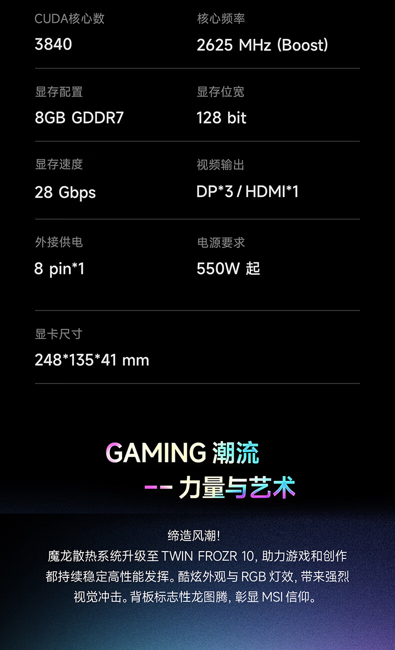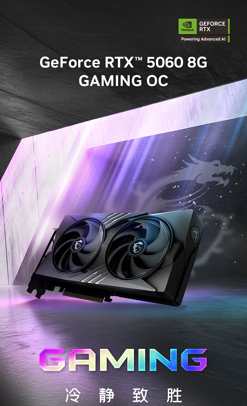 微星(MSI)魔龙 GeForce RTX 5060 8G GAMING OC AI推理 电竞游戏设计智能学习独立显卡