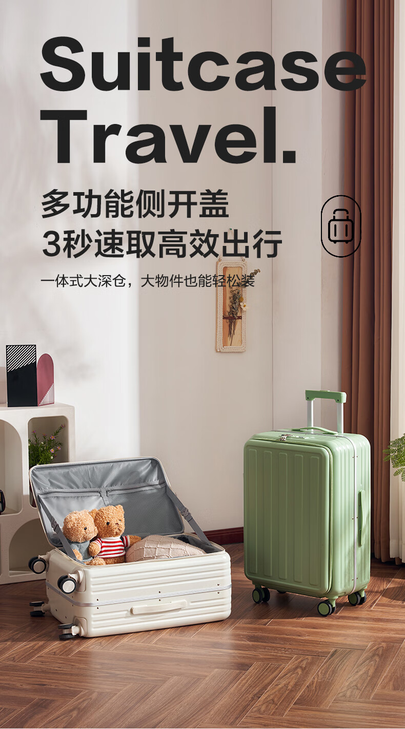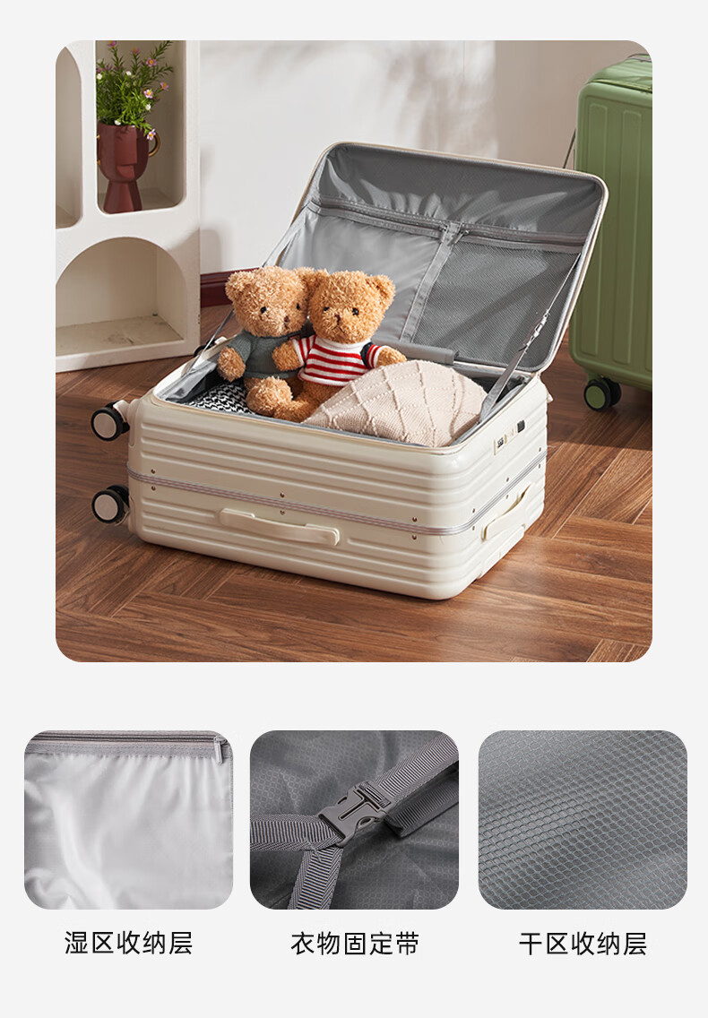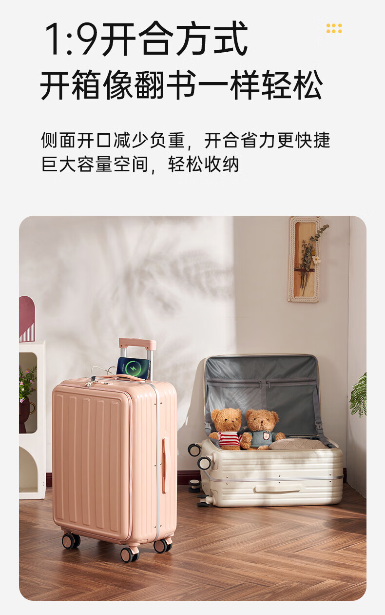 REDOO侧开盖行李箱多功能铝框拉杆箱大容量男女密码箱登机旅行箱子皮箱 米白色【侧开+USB+杯架+手机架】 20英寸 登机箱【无侧提支脚挂钩】