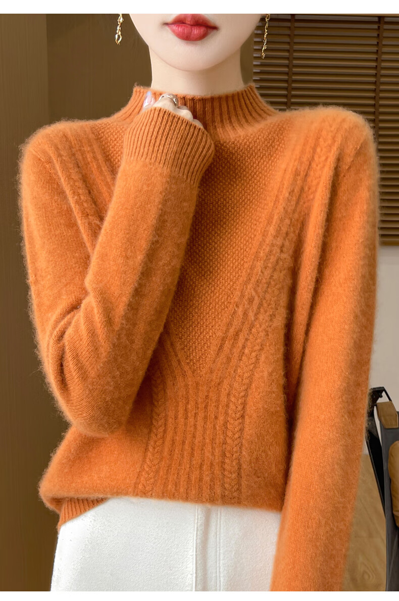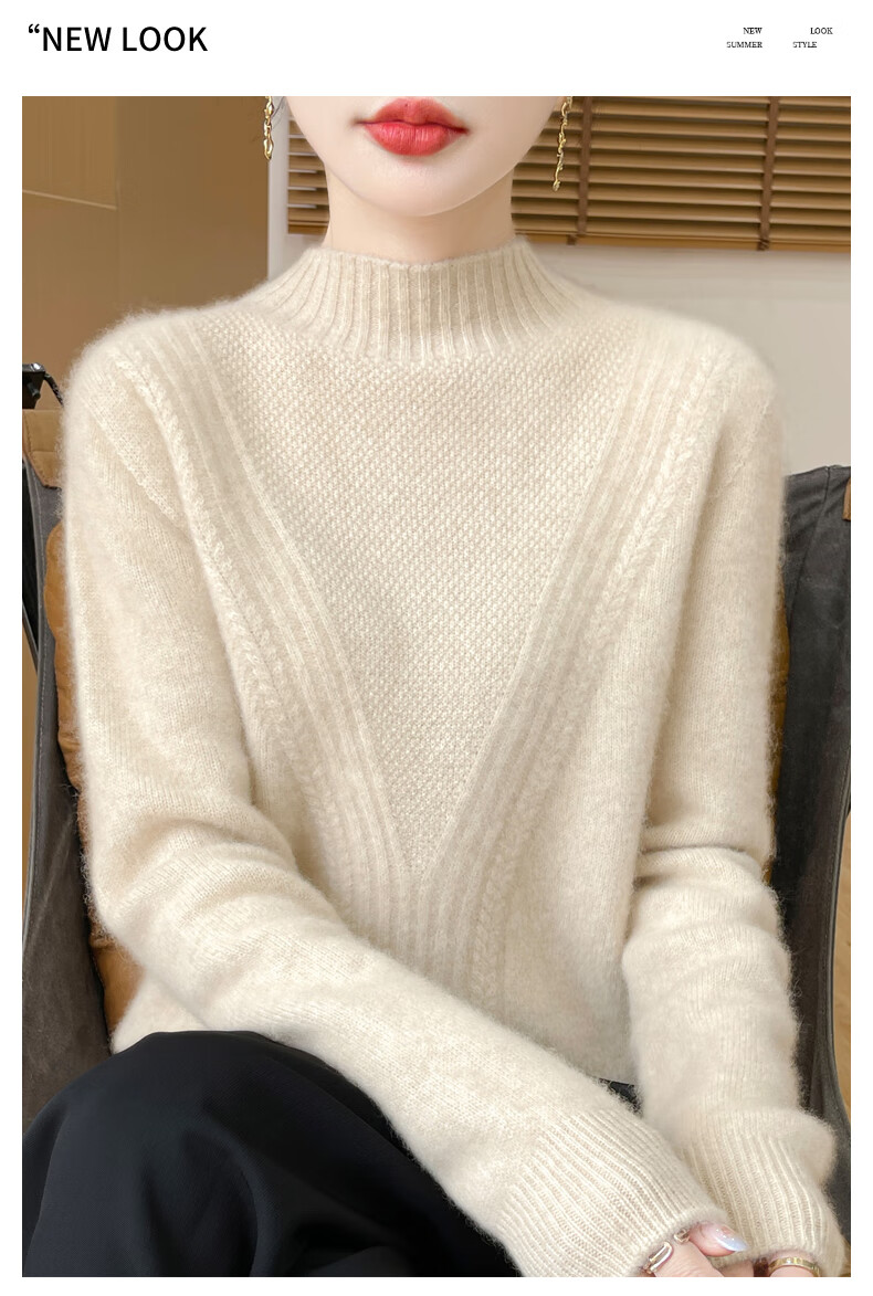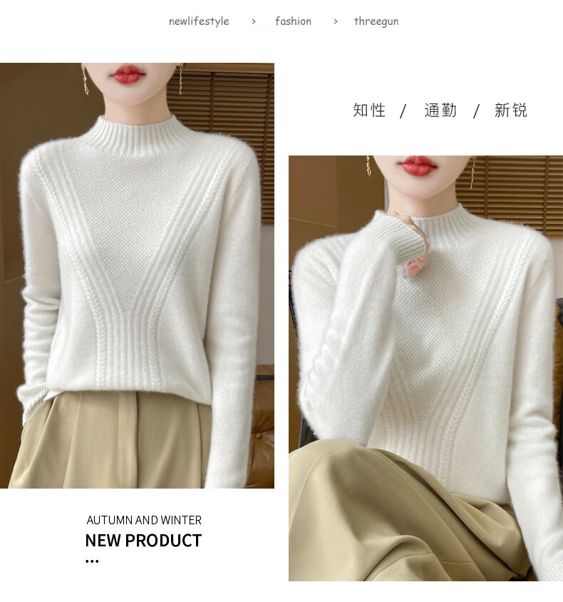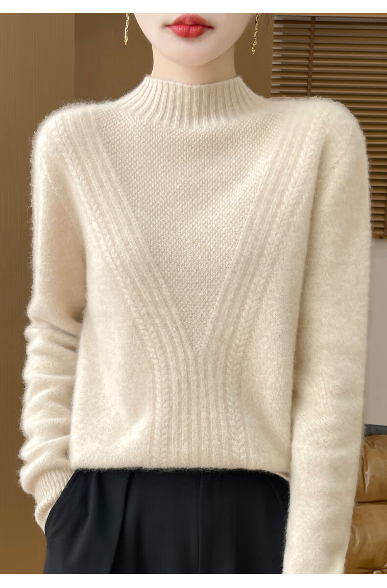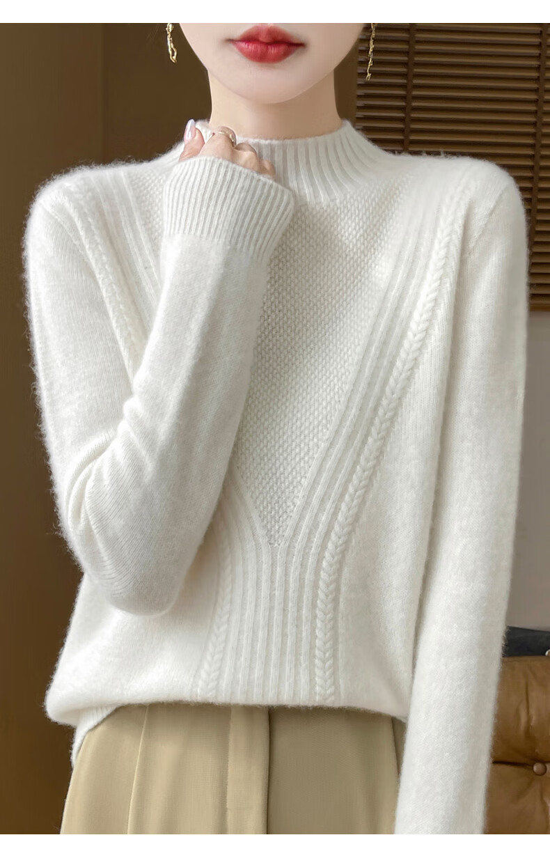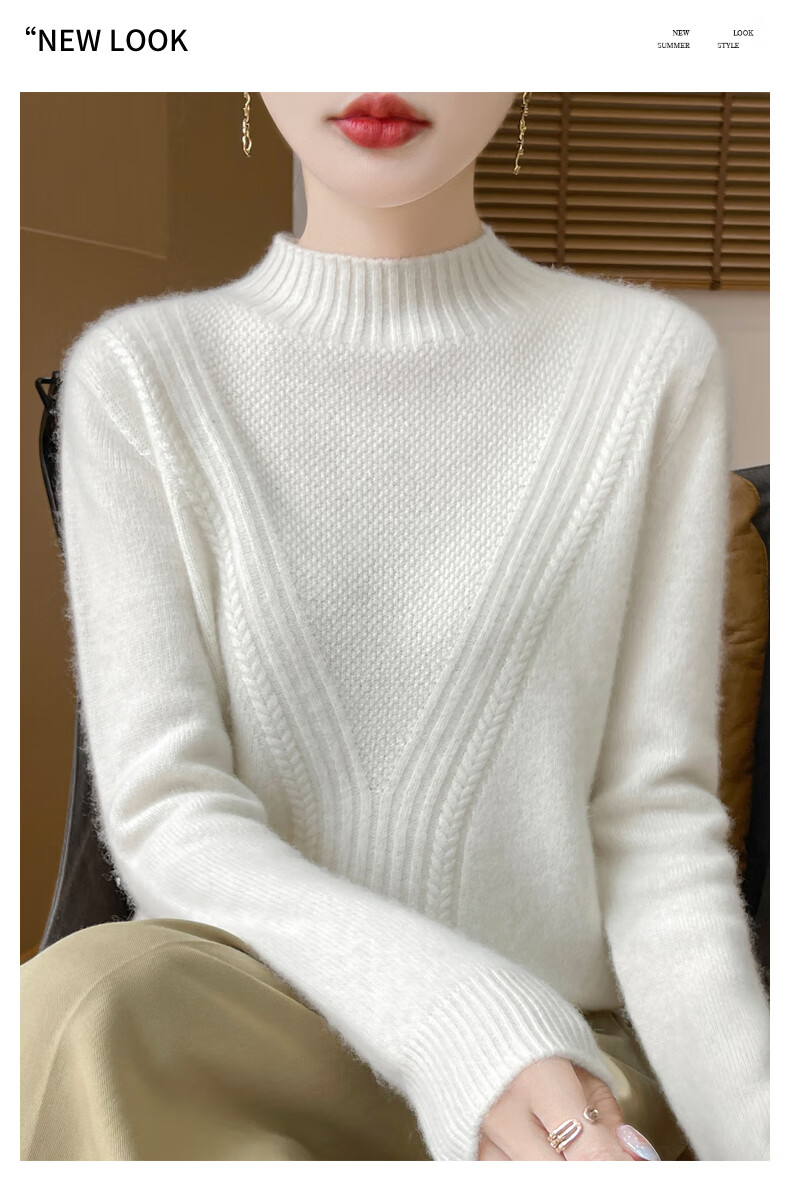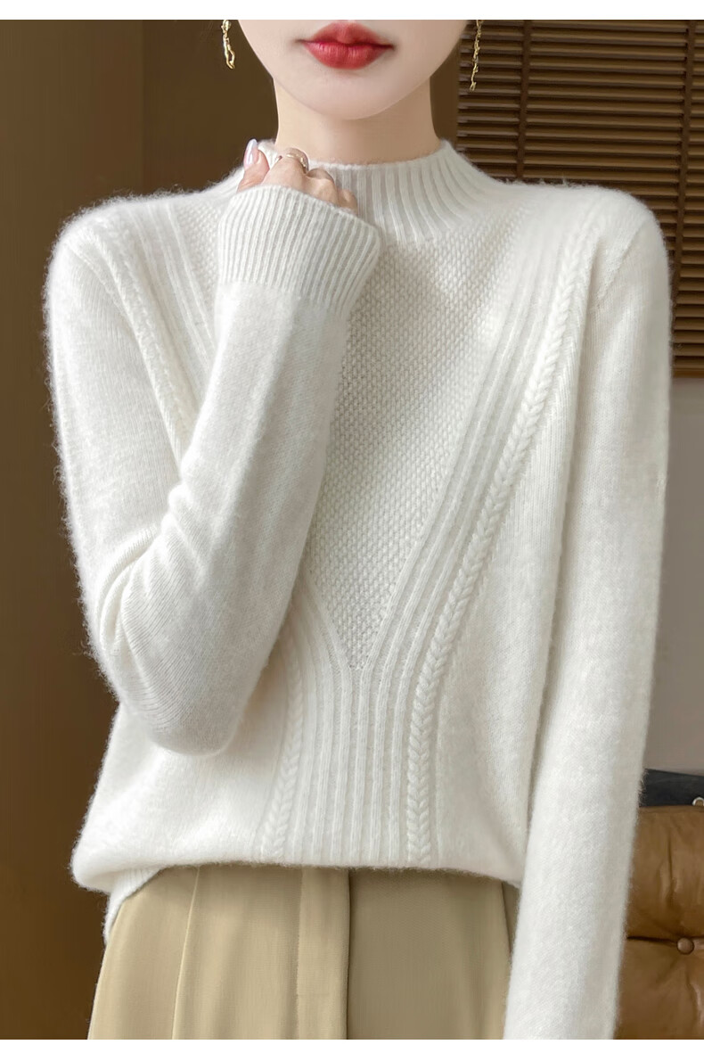 香影芬100%纯羊毛衫女套头半高领毛衣加厚扭花时尚秋冬羊毛针织打底衫女 白色 S (建议95斤以内)