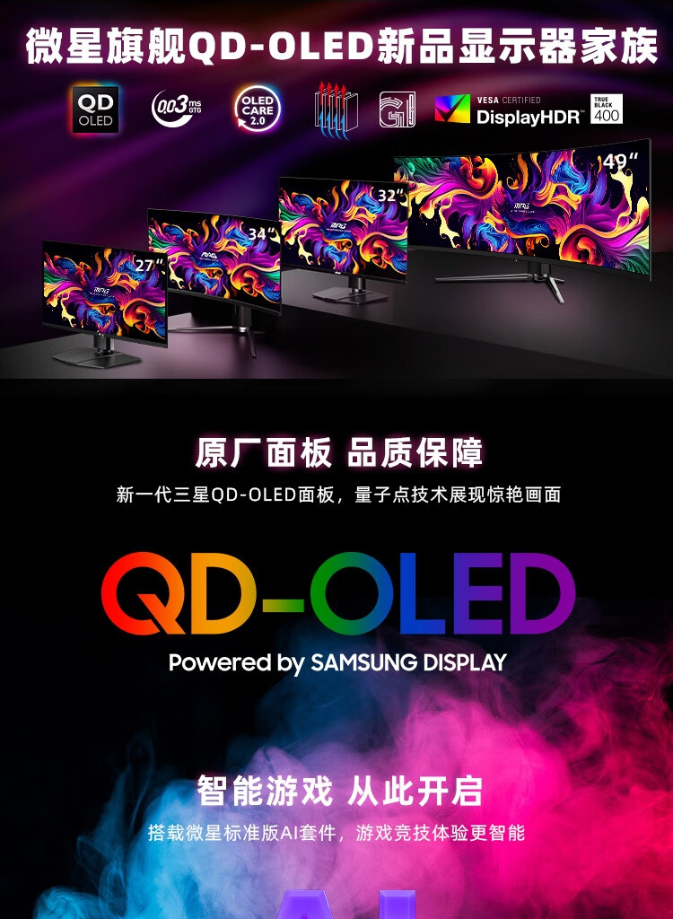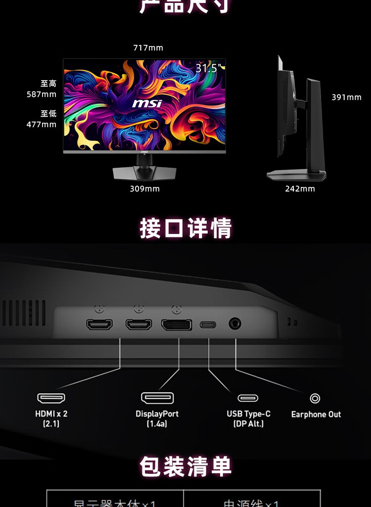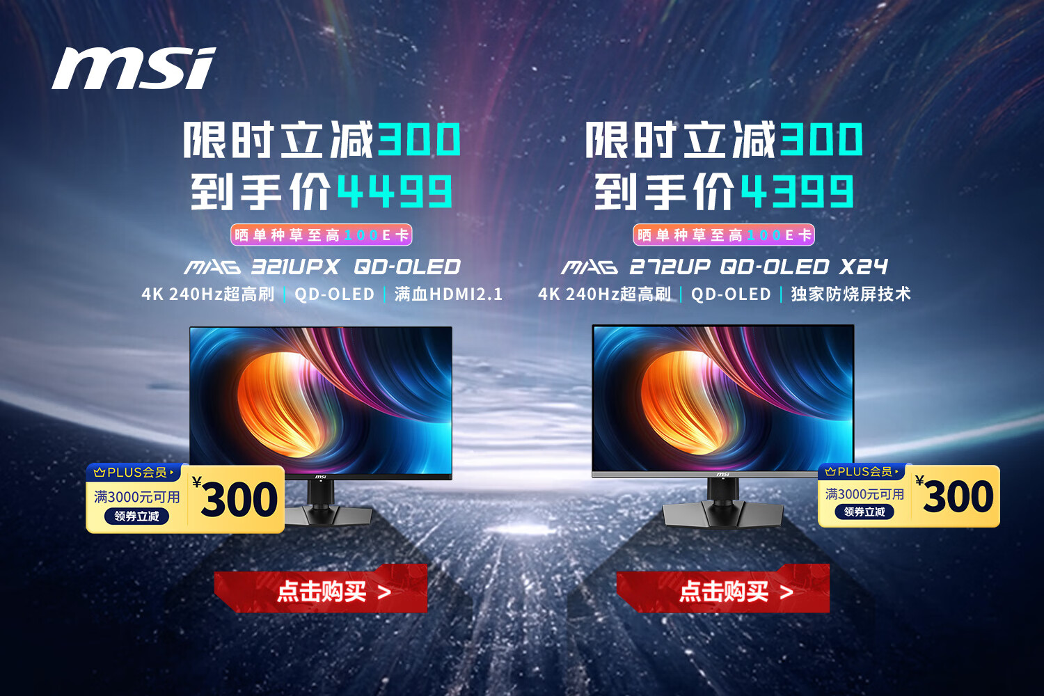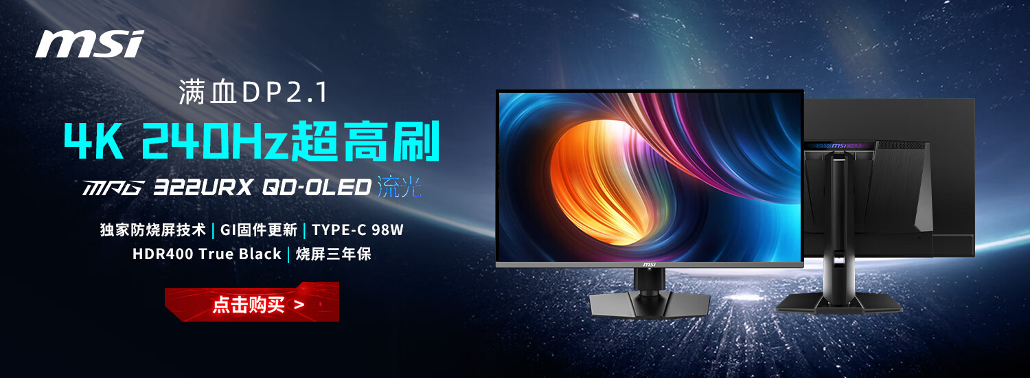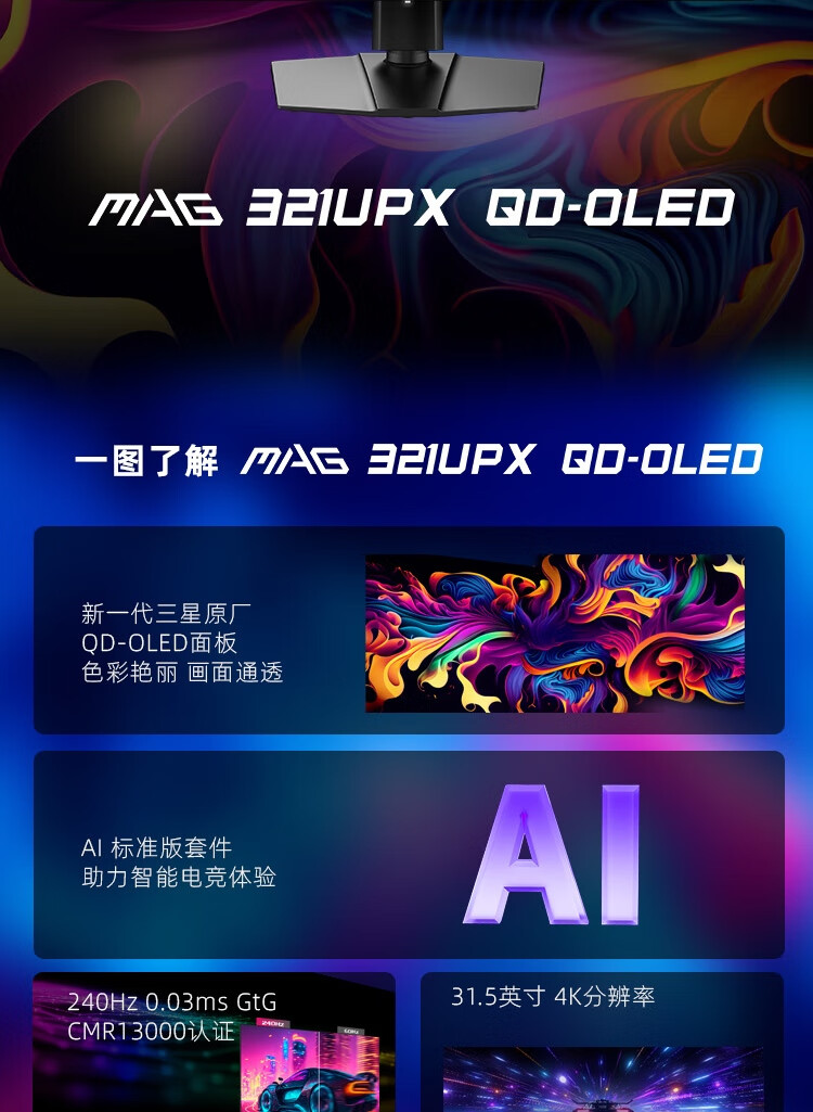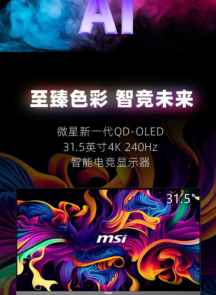 微星(MSI)31.5英寸 4K 量子点 OLED 240Hz 0.03ms(GTG) HDR400 游戏电竞显示器屏 MAG 321UPX QD-OLED