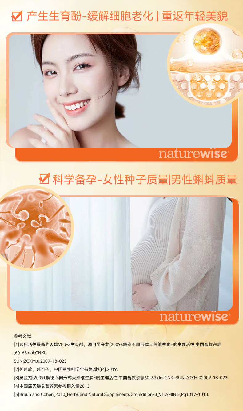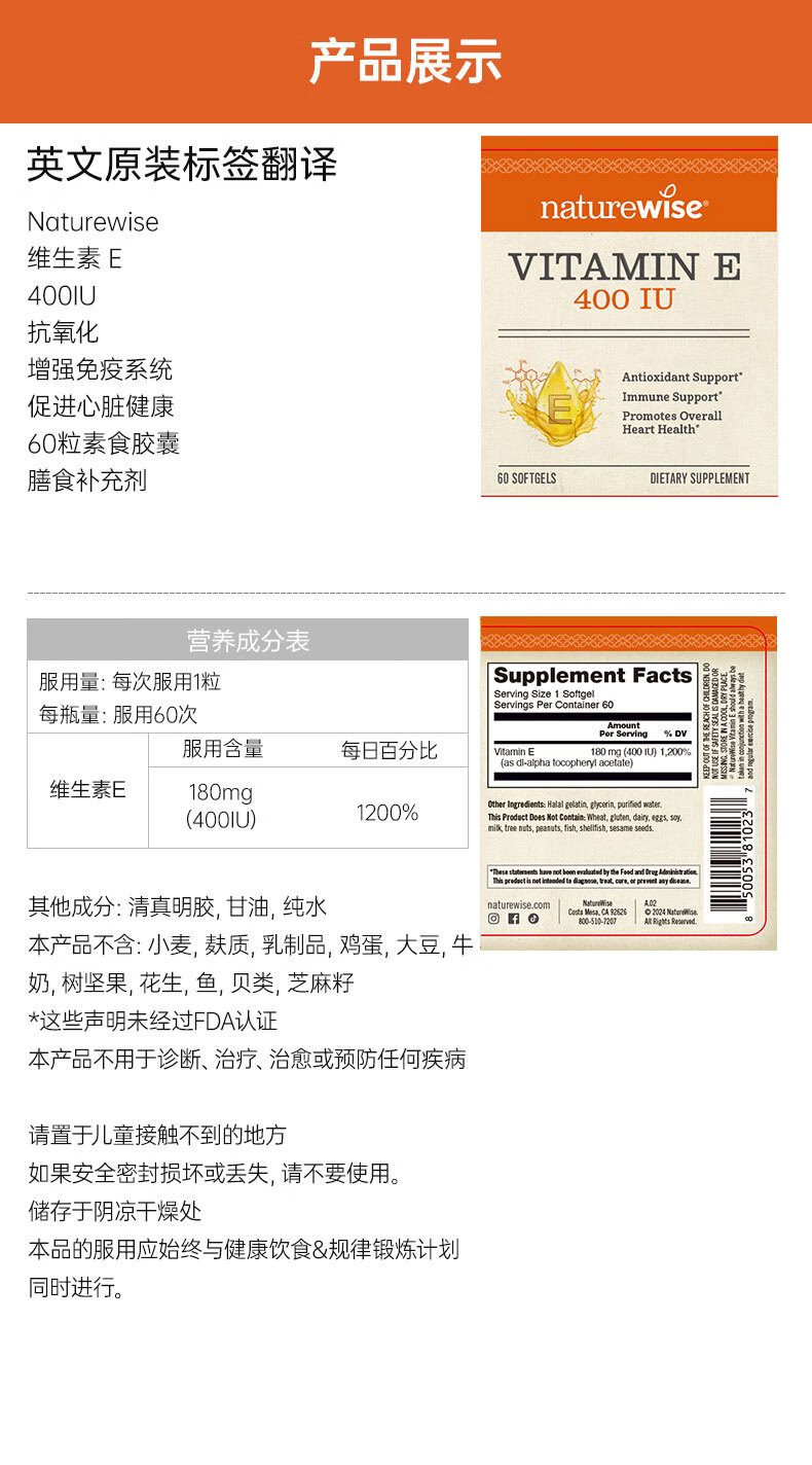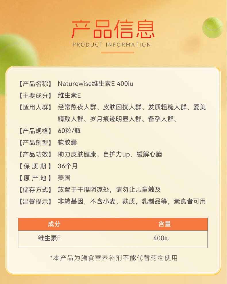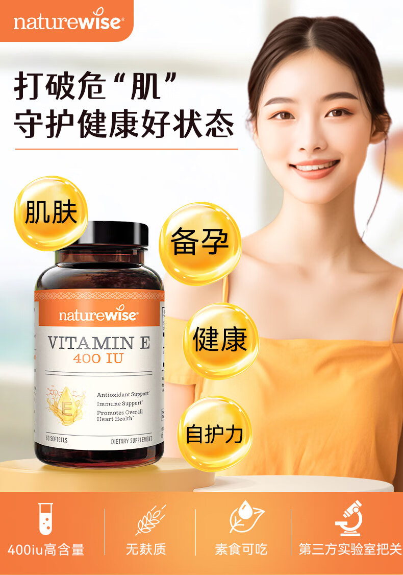 naturewise维生素E软胶囊400IU ve美白淡斑抗氧化备孕男女成人内服 60粒/瓶
