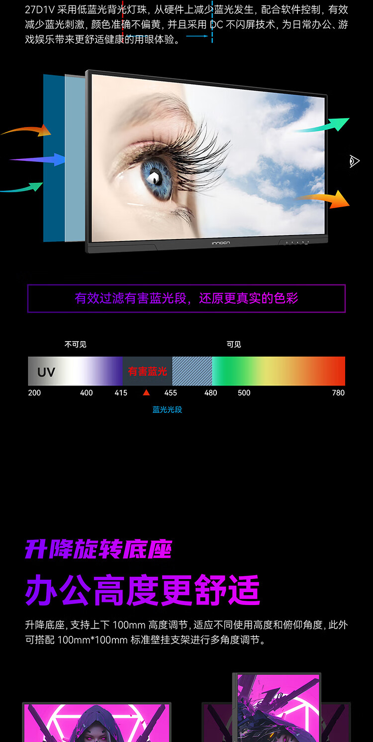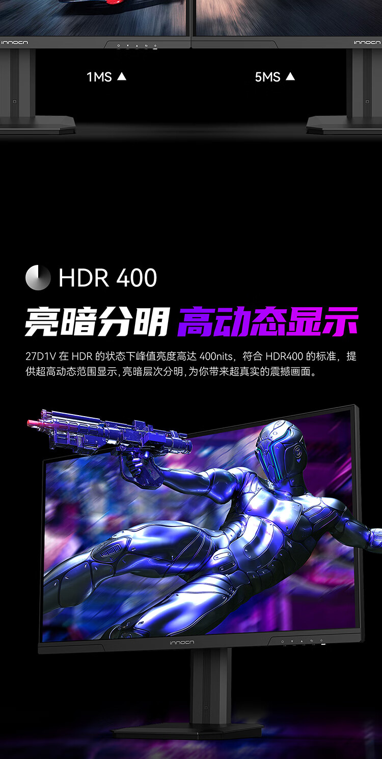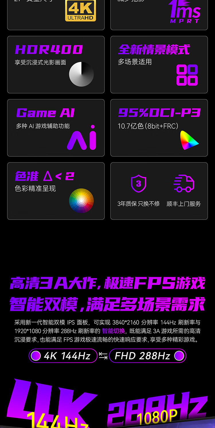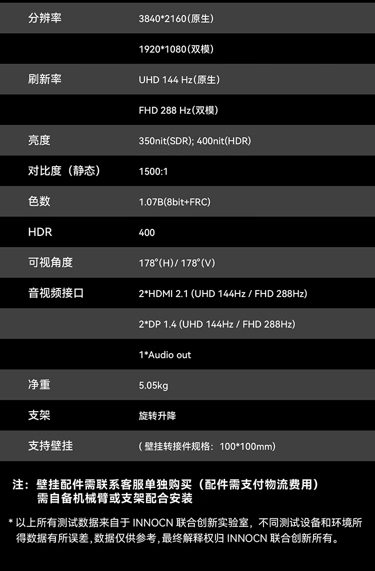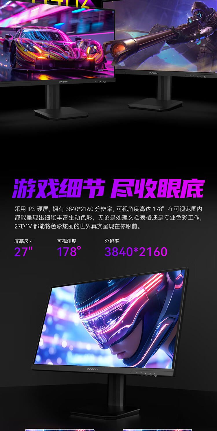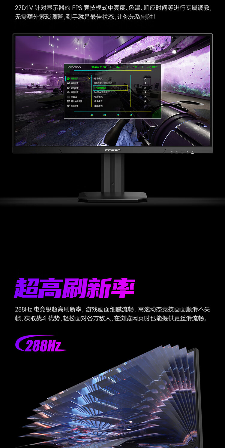 联合创新27英寸 4K超清144Hz双模288Hz IPS屏HDR400硬件低蓝光护眼 旋转升降支架 电竞游戏电脑显示器27D1V