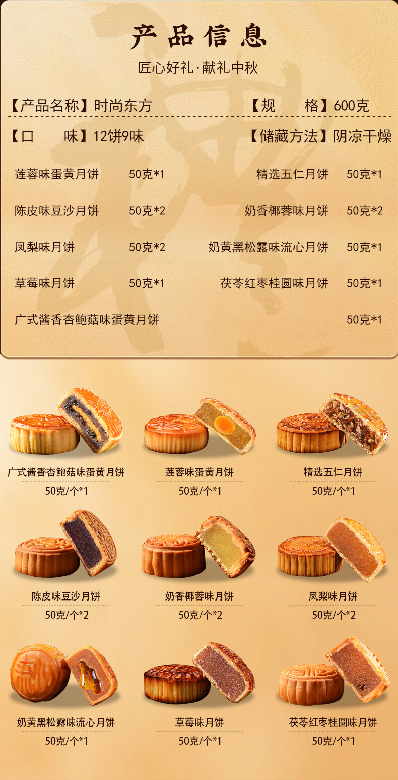 洽多饱中秋月饼礼盒送礼广式蛋黄莲蓉五仁陈皮豆沙糕点伴手礼企业团购 【买一送一】时尚东方 12饼9味 600g