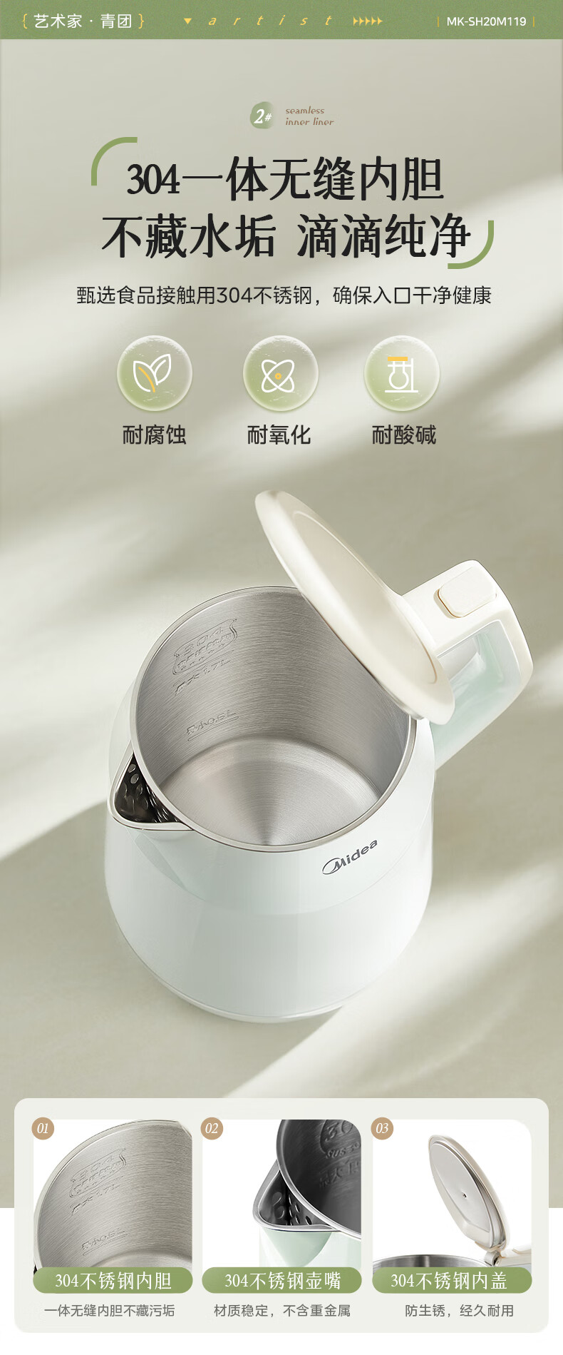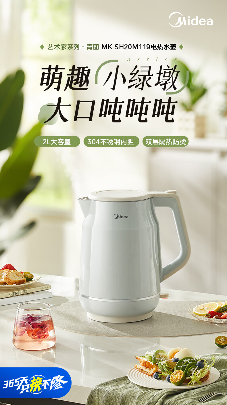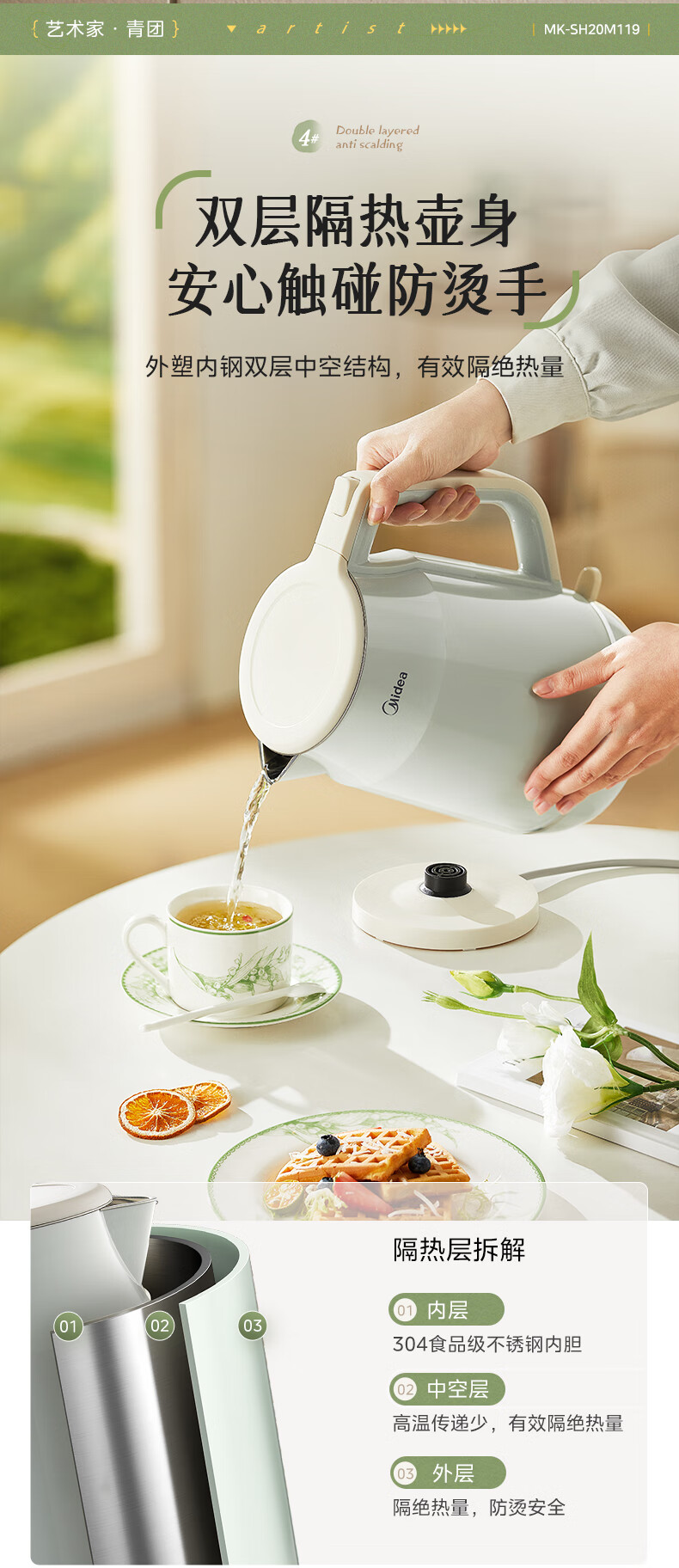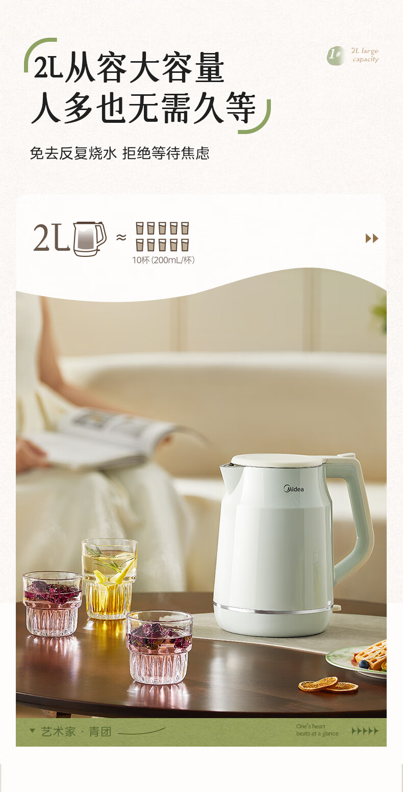 美的(Midea)电热水壶 2L大容量 1800W大功率速沸 双层防烫 304不锈钢无缝内胆 烧水壶电水壶 SH20M119