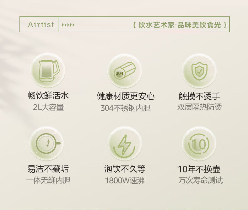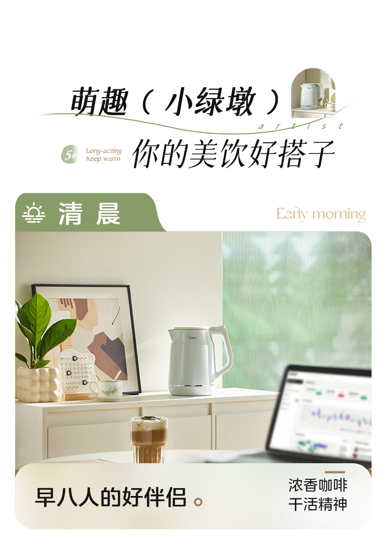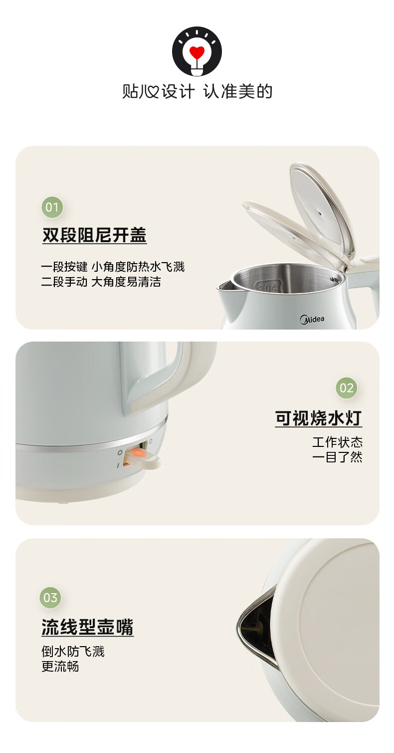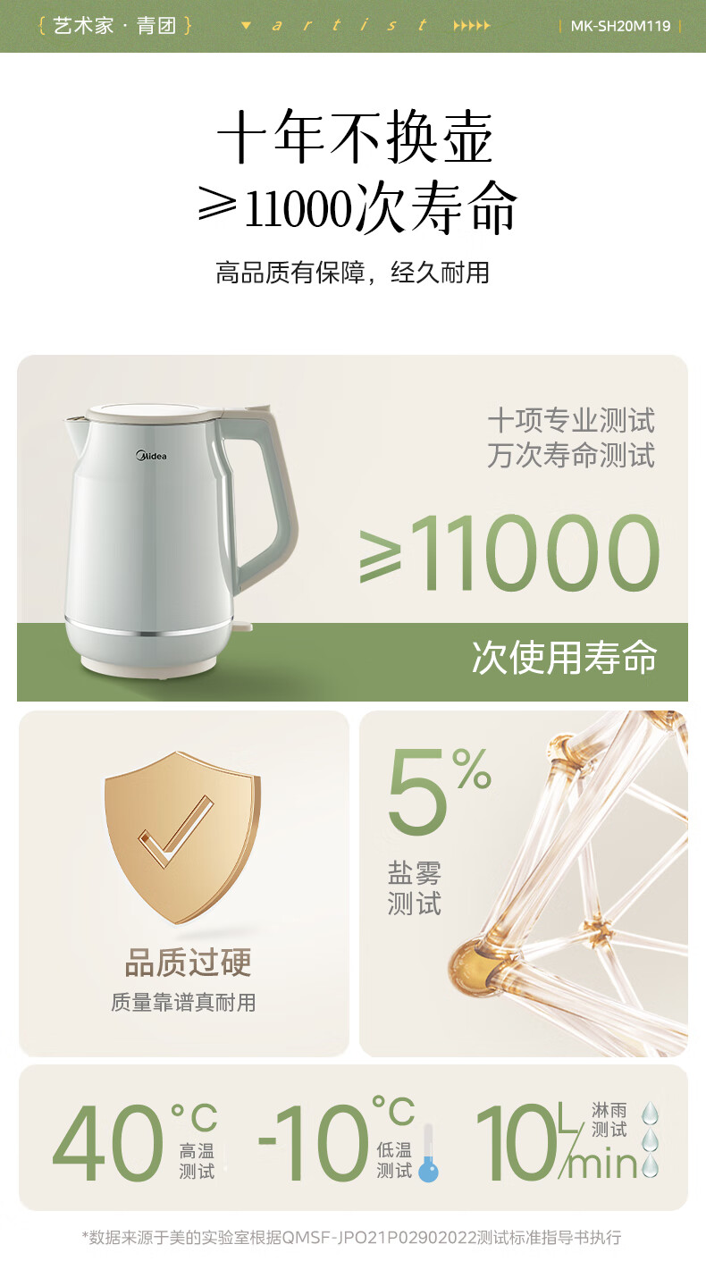 美的(Midea)电热水壶 2L大容量 1800W大功率速沸 双层防烫 304不锈钢无缝内胆 烧水壶电水壶 SH20M119