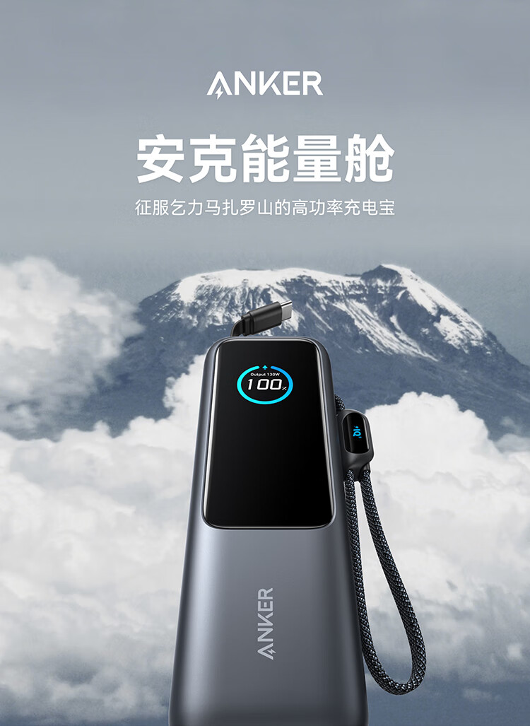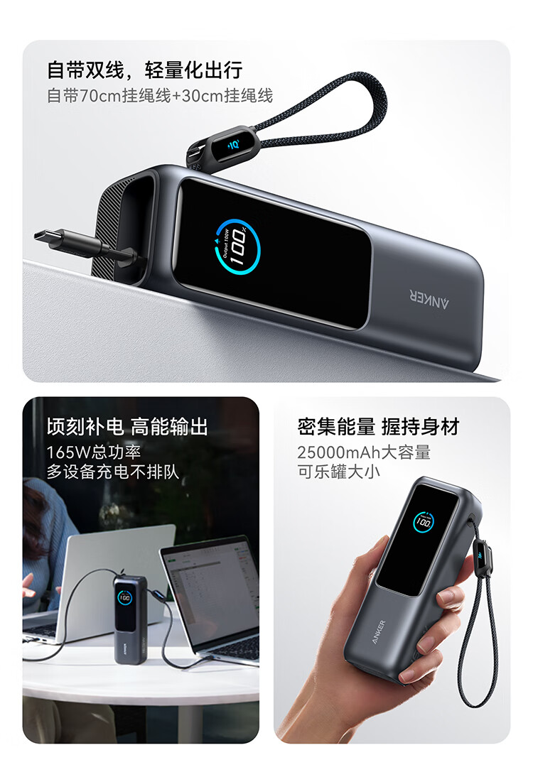 ANKER 安克能量舱【新3C认证可上飞机】LKs推荐165W充电宝超大容量自带伸缩线25000毫安100W苹果17银