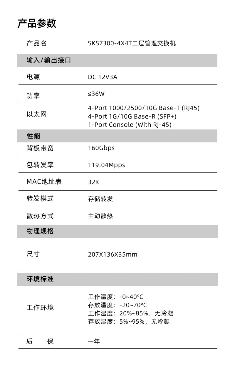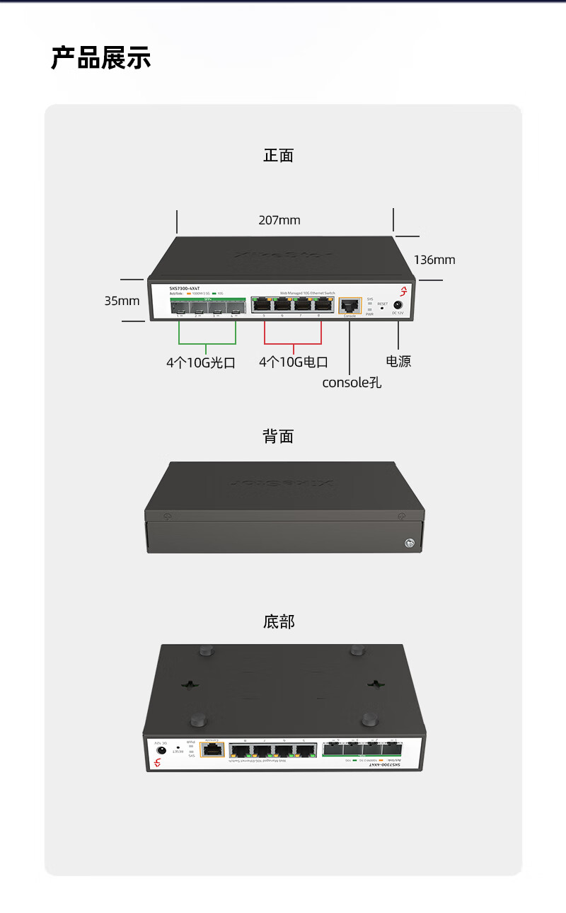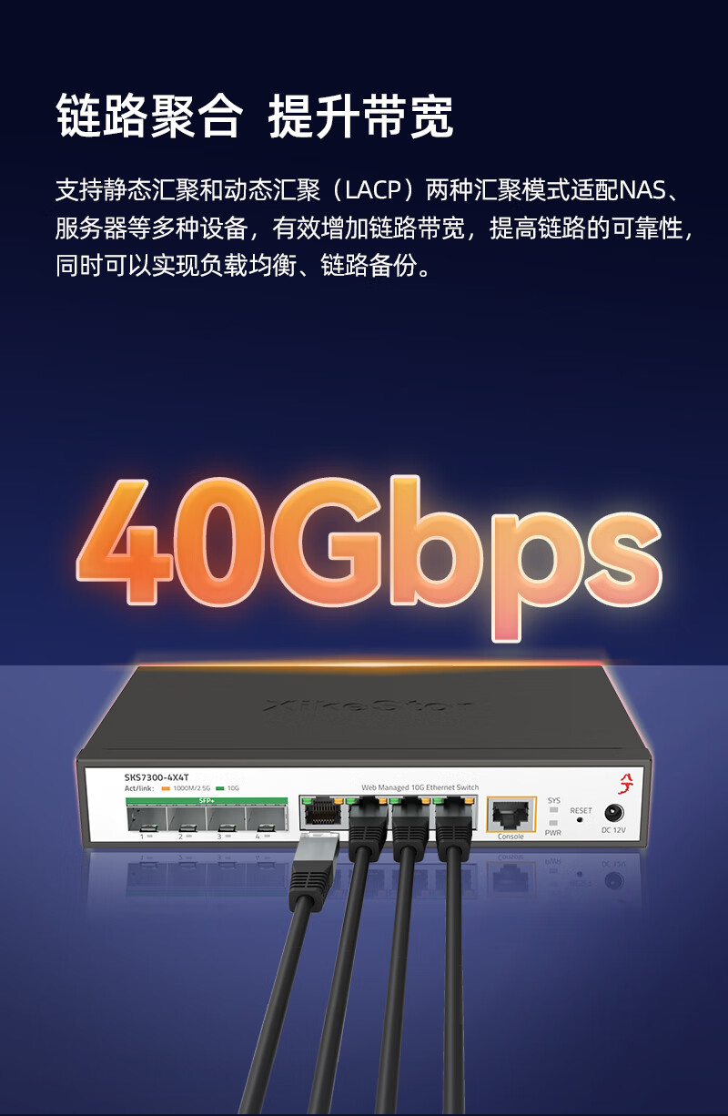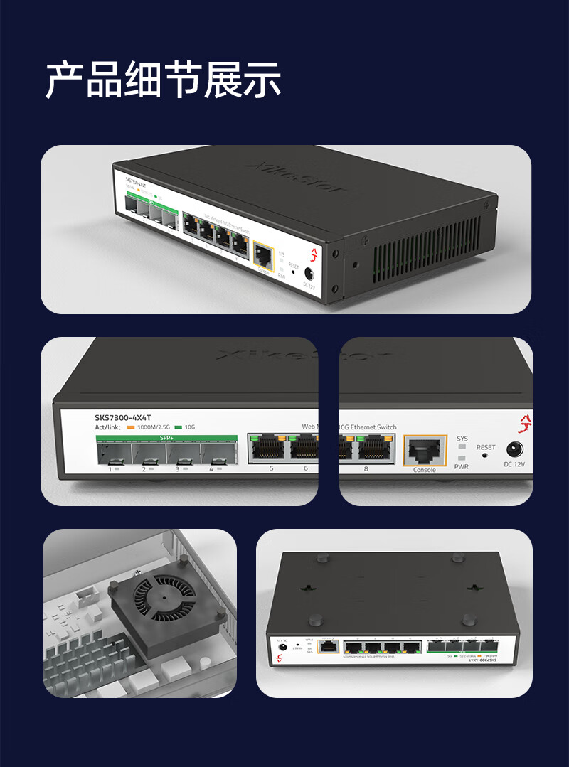 兮克8口全万兆交换机4口10G光口+4口10G电口兼容1G/2.5G/5G二层网管交换机支持VLAN 聚合SKS7300-4X4T