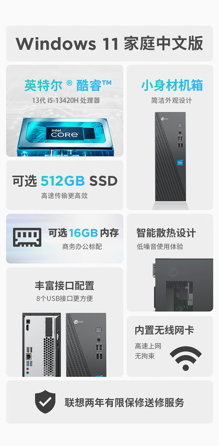 联想(Lenovo)来酷 Lecoo商务办公台式电脑主机(酷睿i5-13420H 16G内存 512GB SSD 正版win11 )
