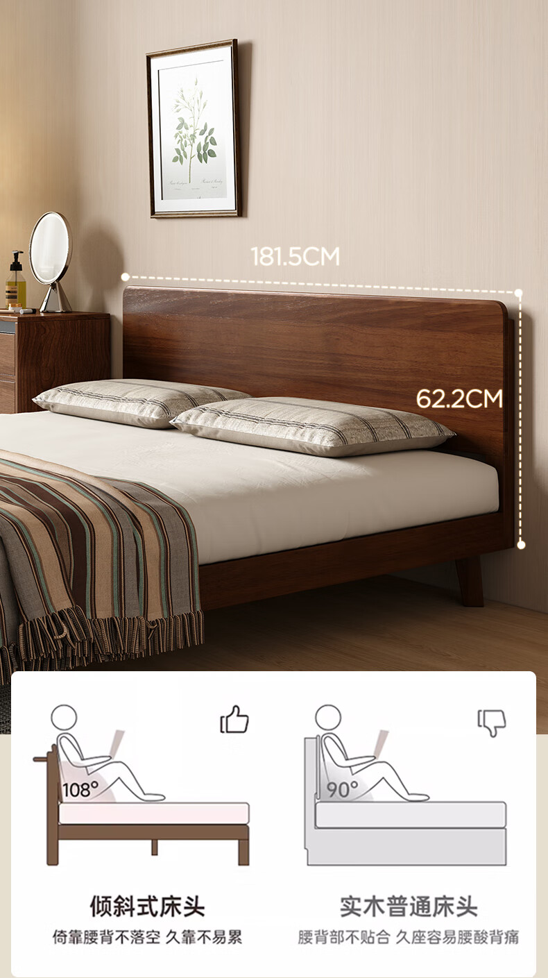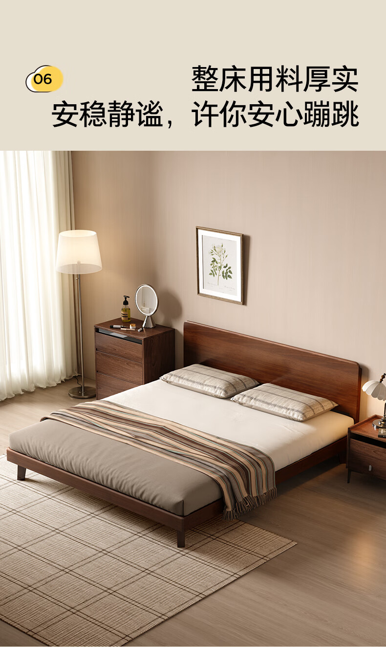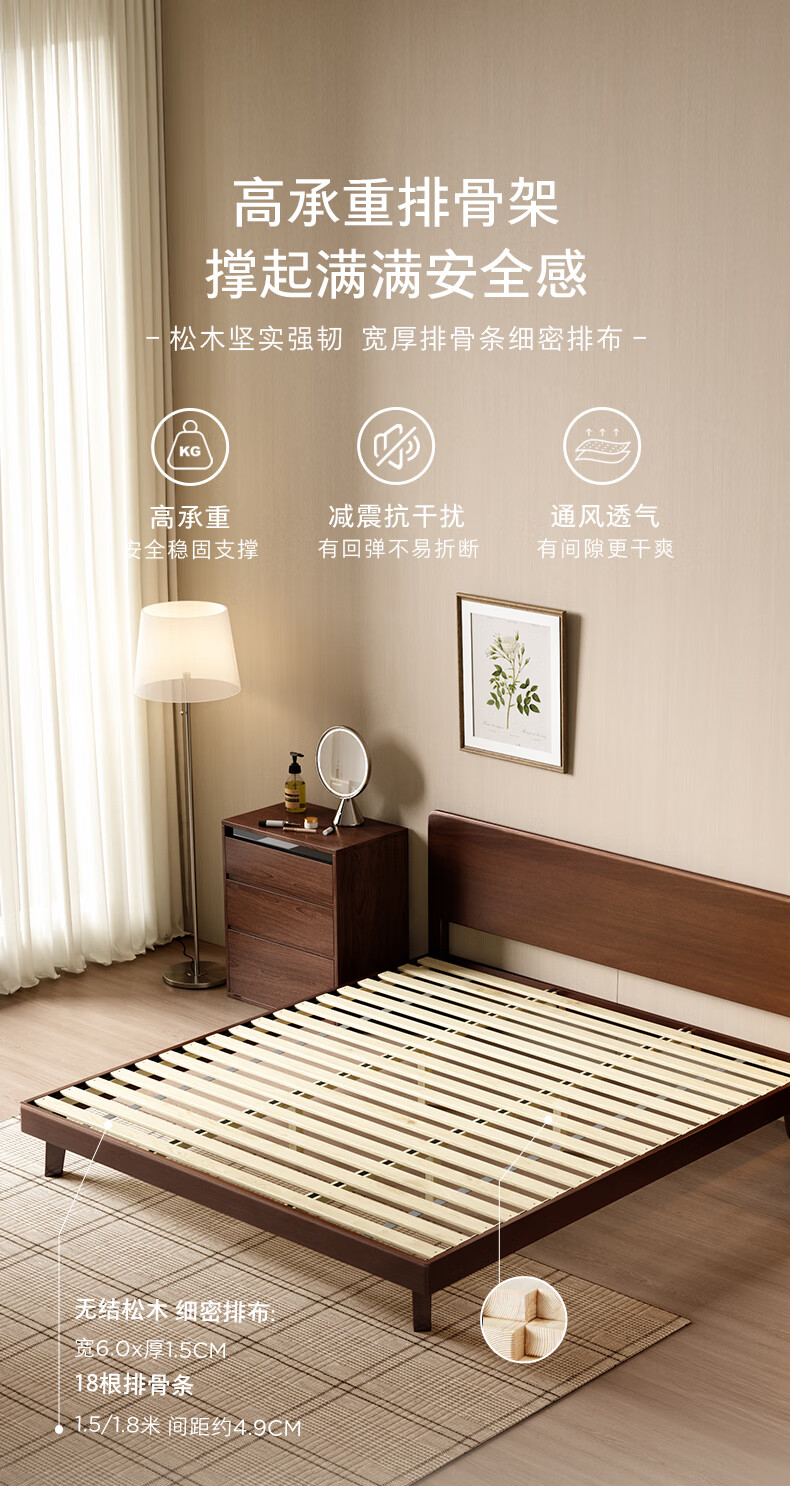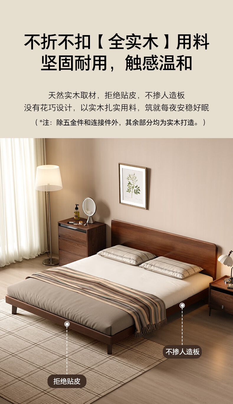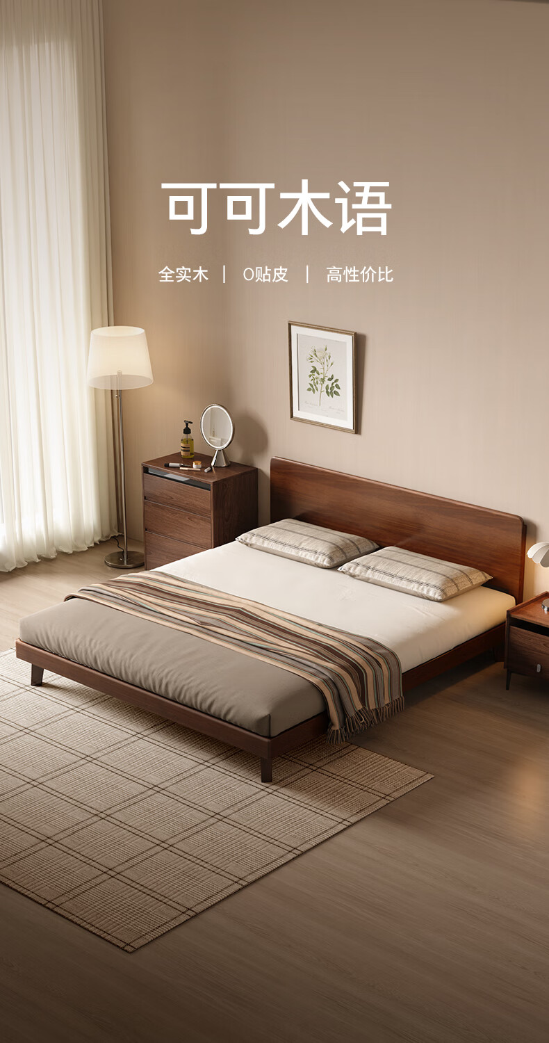 顾家家居(KUKA)中古风实木高脚板木床齐边小尺寸卧室床加密排骨架DS9275B 【胡桃木色】至尊·中古全实木高脚1.8米