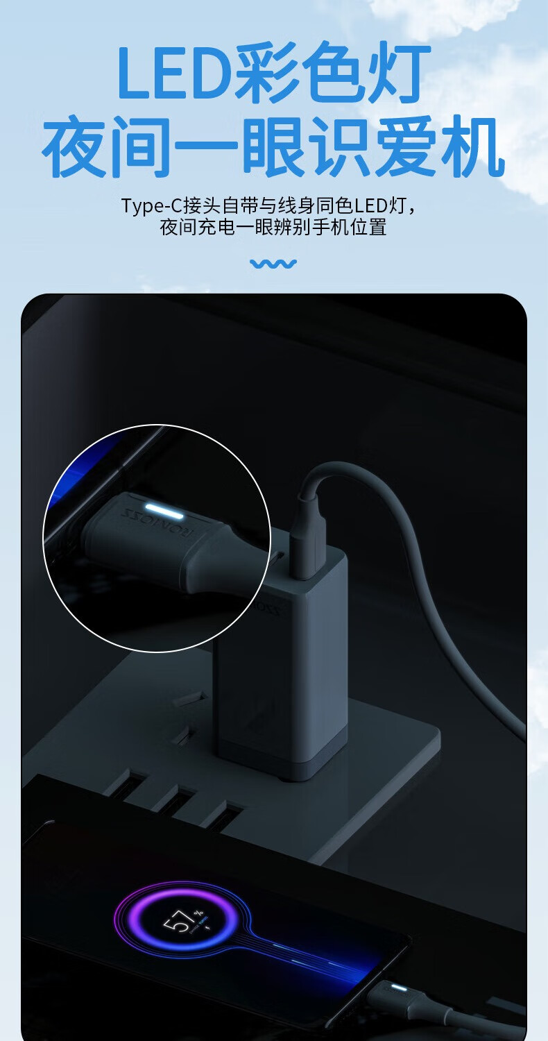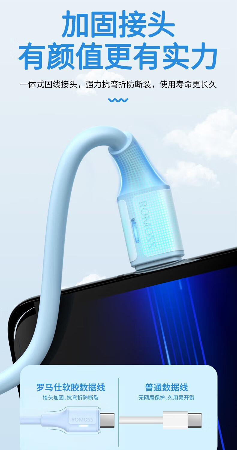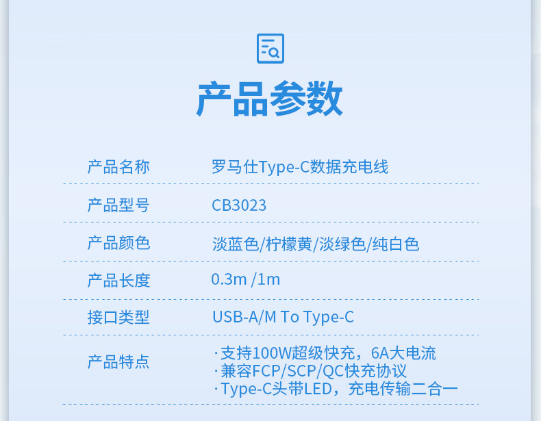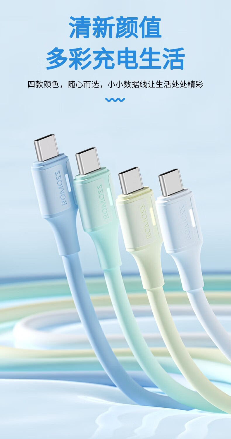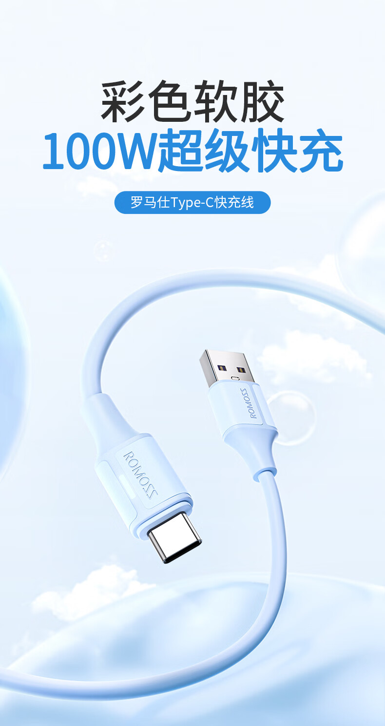 罗马仕Type-C数据线6A超级快充100W充电线带彩色LED指示灯适用华为Mate60小米荣耀平板安卓手机车载线充 淡蓝色【100W快充】1m