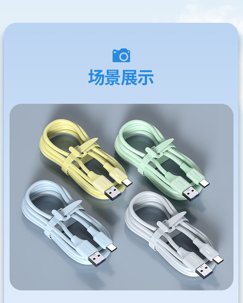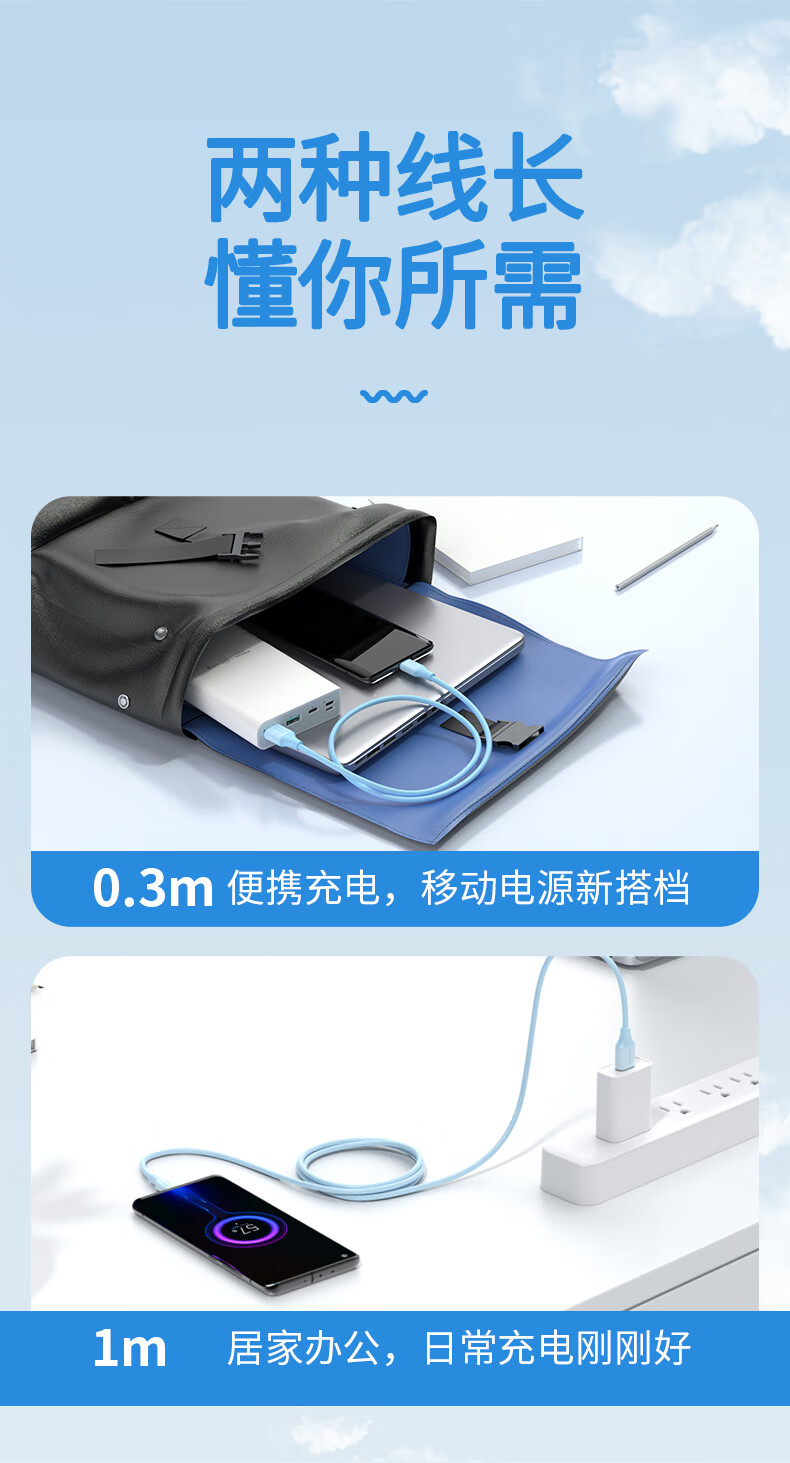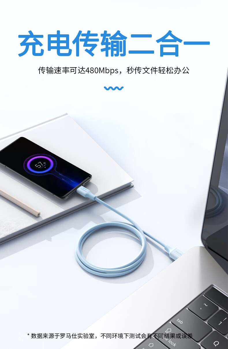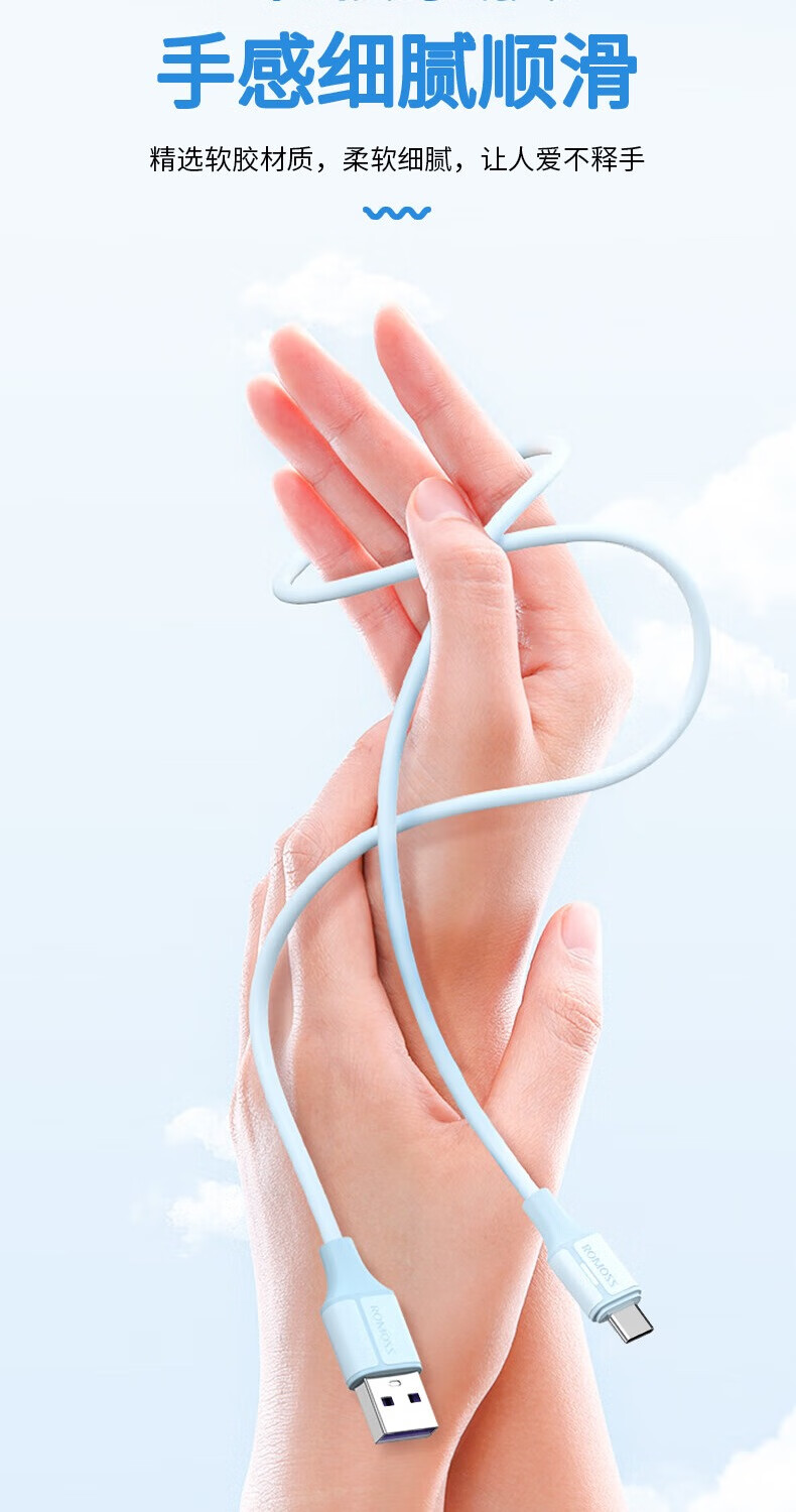 罗马仕Type-C数据线6A超级快充100W充电线带彩色LED指示灯适用华为Mate60小米荣耀平板安卓手机车载线充 淡蓝色【100W快充】1m