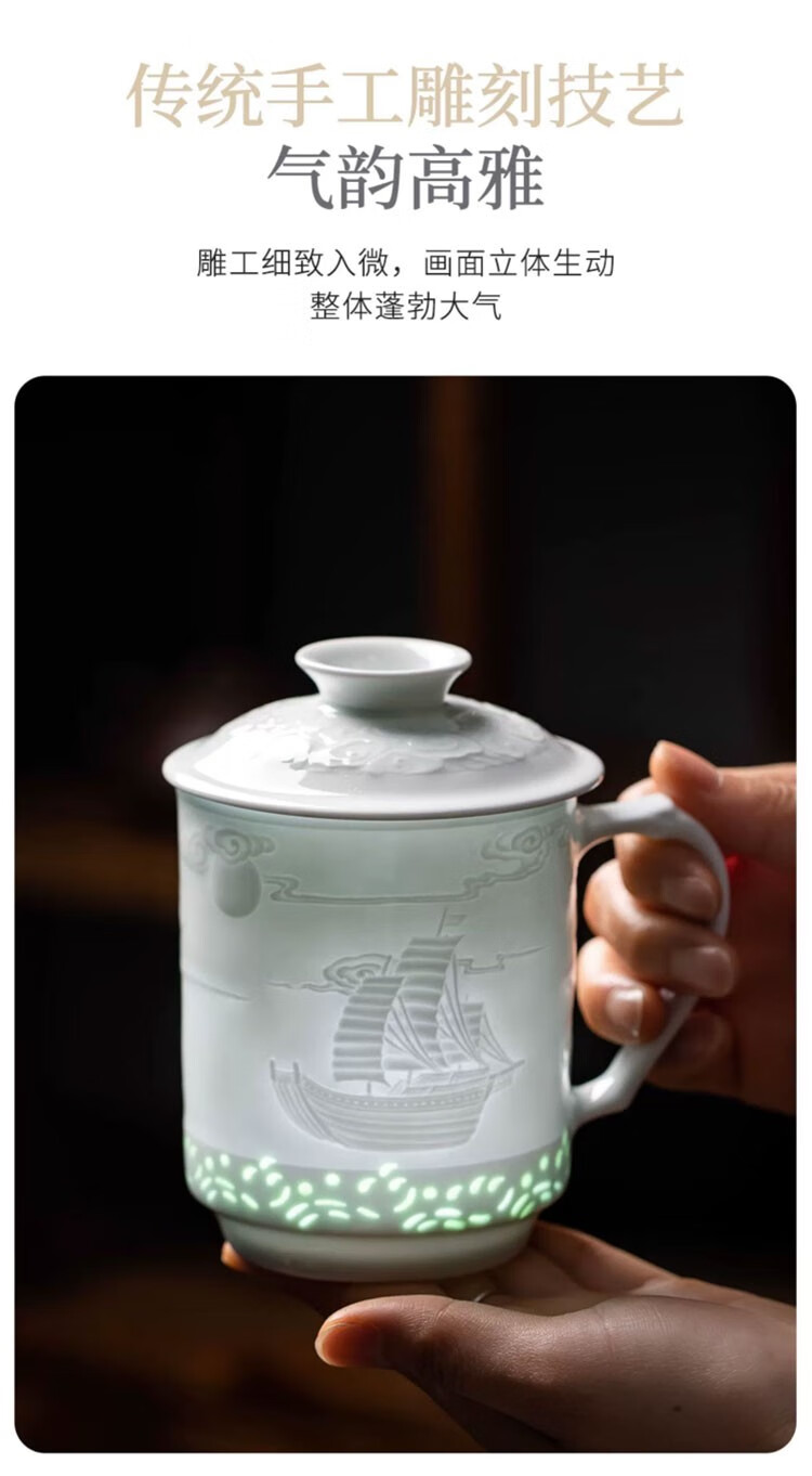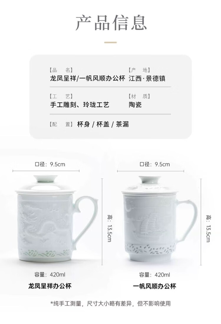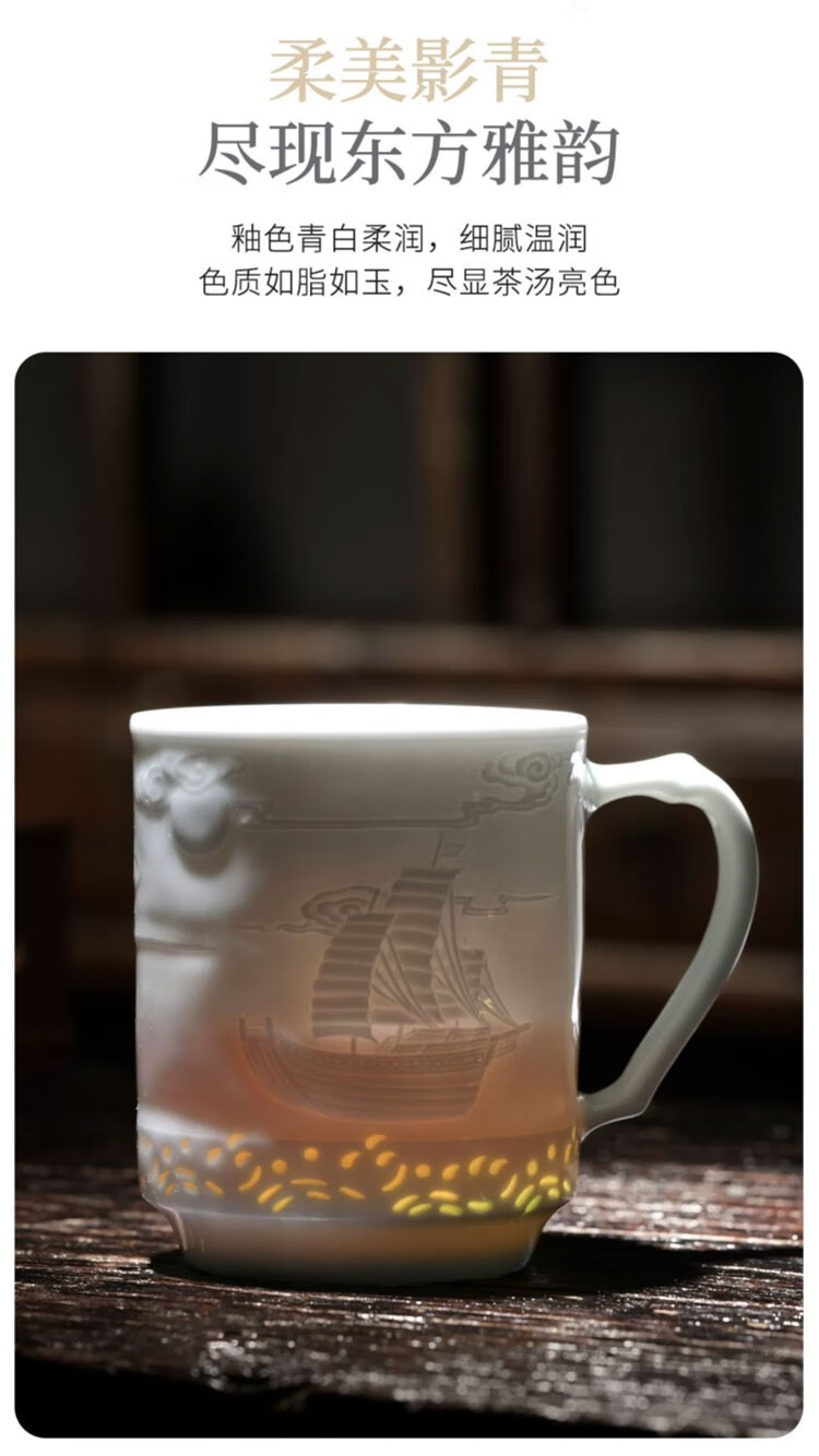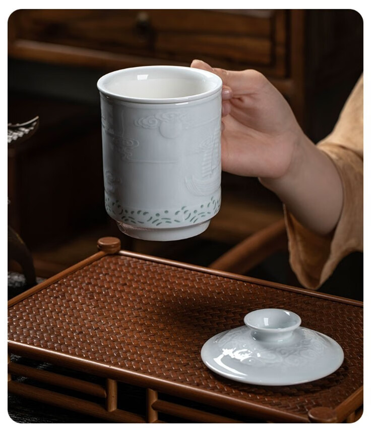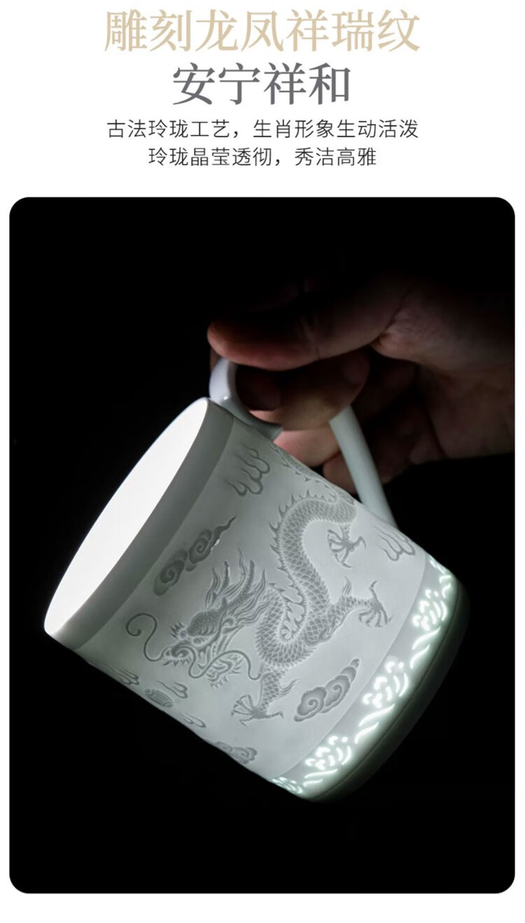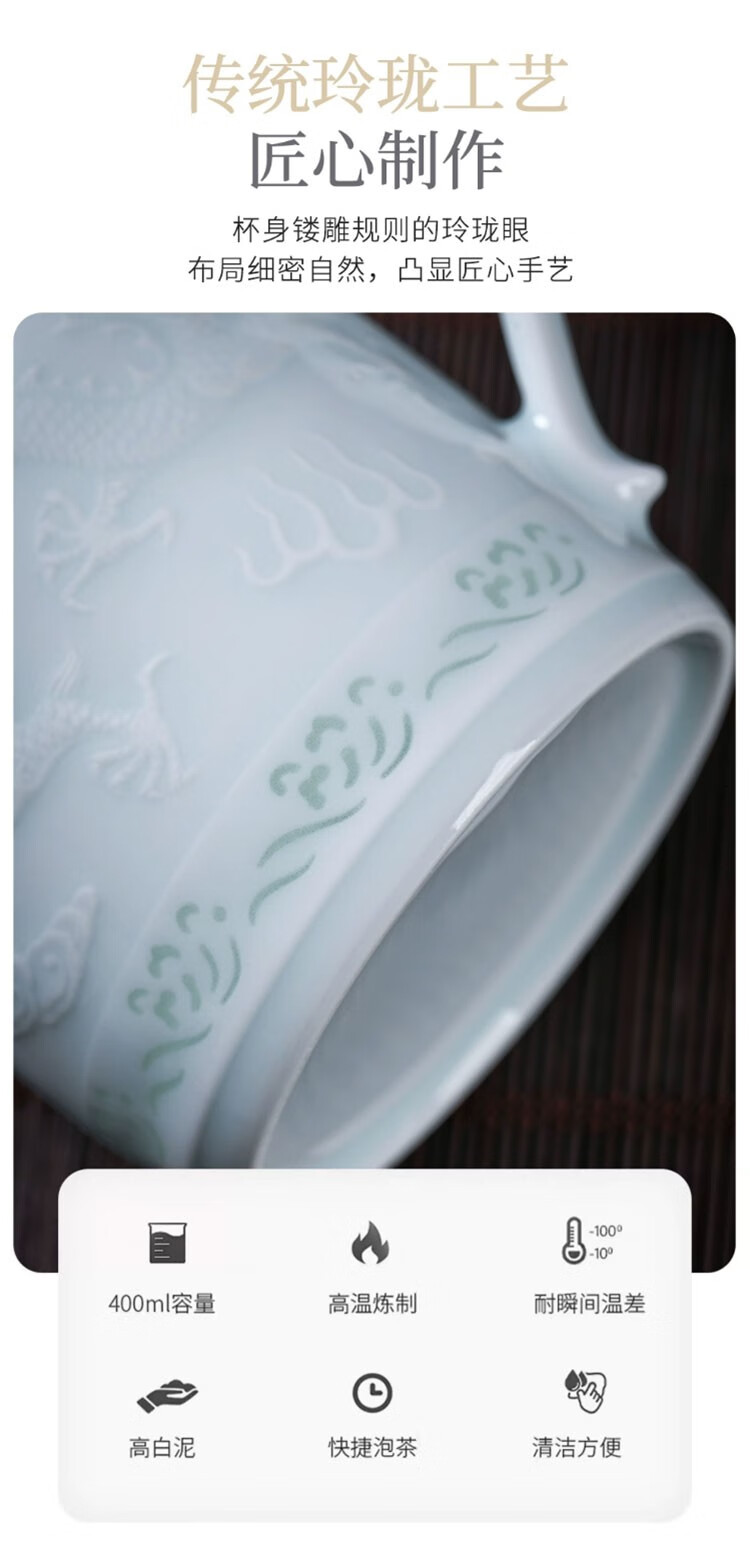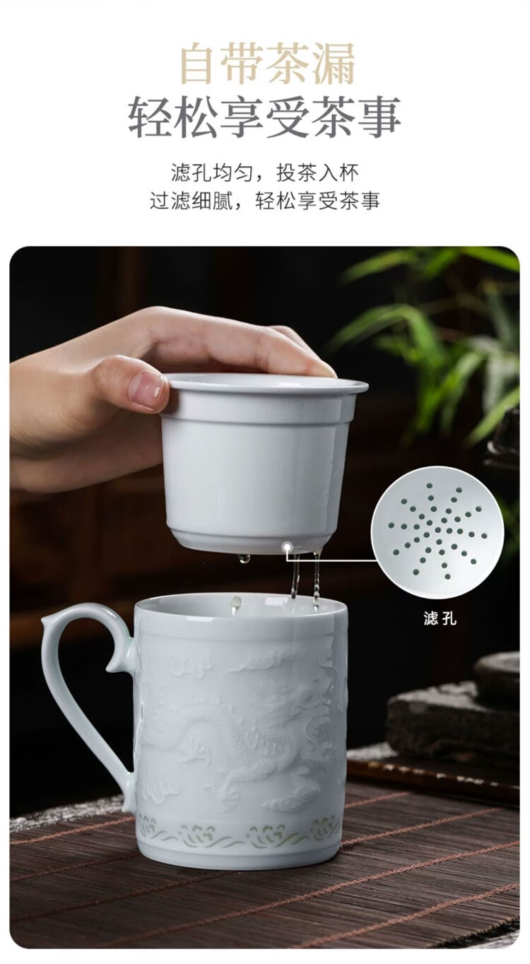 零峰景德镇影青陶瓷雕刻玲珑茶杯办公杯家用茶水分离泡茶杯伴手礼物 松鹤延年茶杯普通包装420ml1只 一组