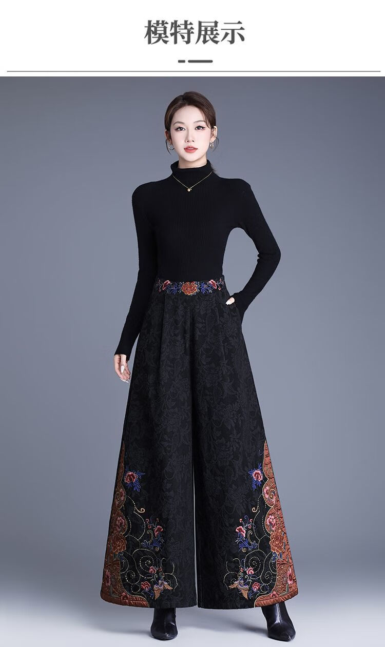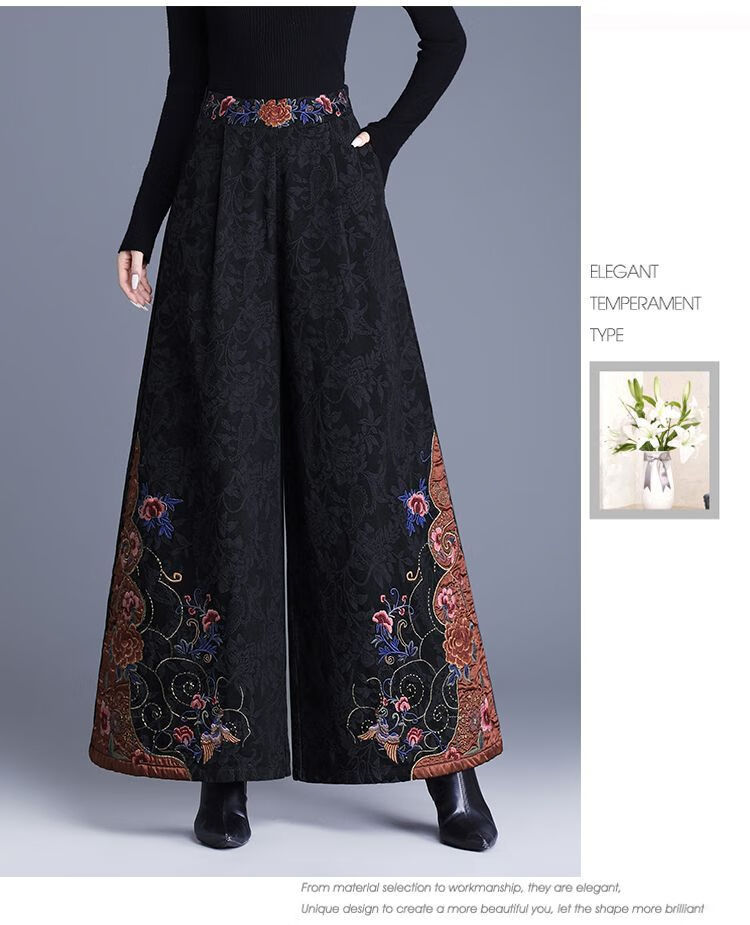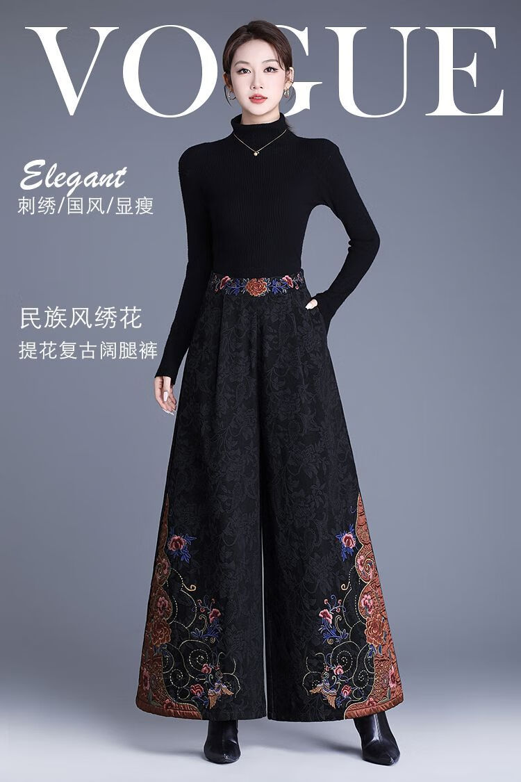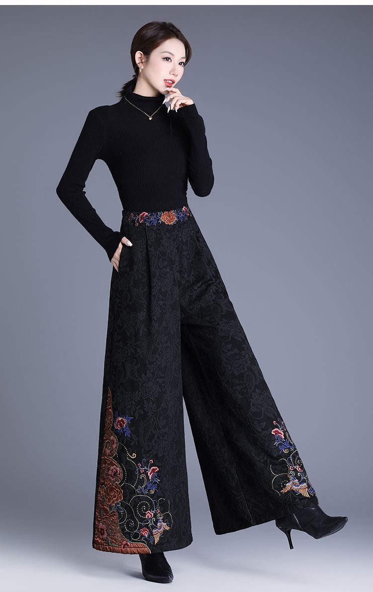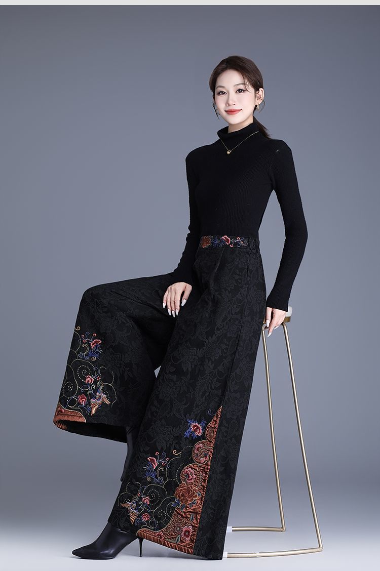 中年妈妈装新中式国风高腰阔腿裤重工绣花提花民族风刺绣长裤子女 黑色刺绣阔腿裤(不加绒) L