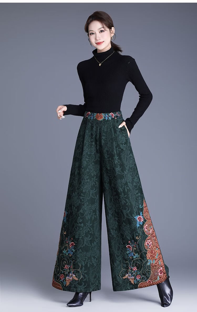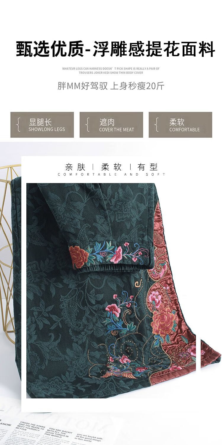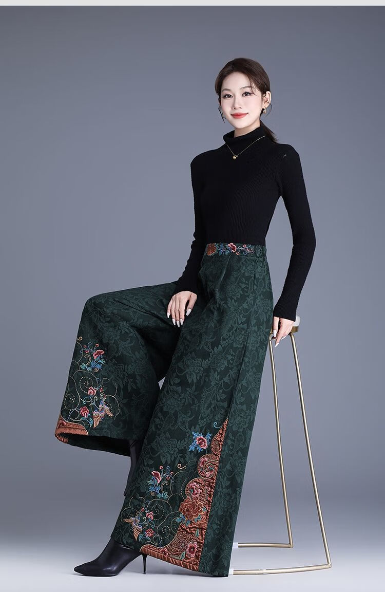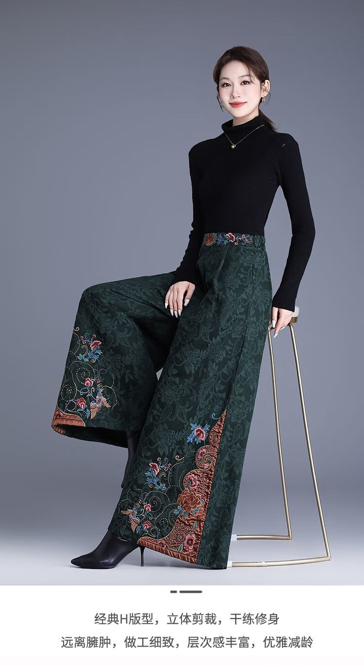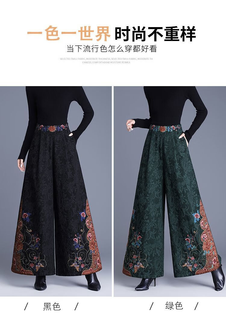 中年妈妈装新中式国风高腰阔腿裤重工绣花提花民族风刺绣长裤子女 黑色刺绣阔腿裤(不加绒) L