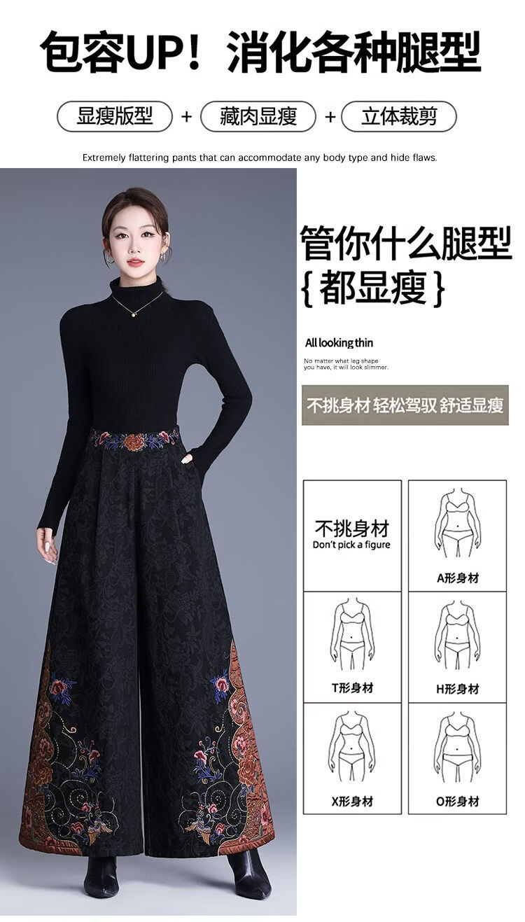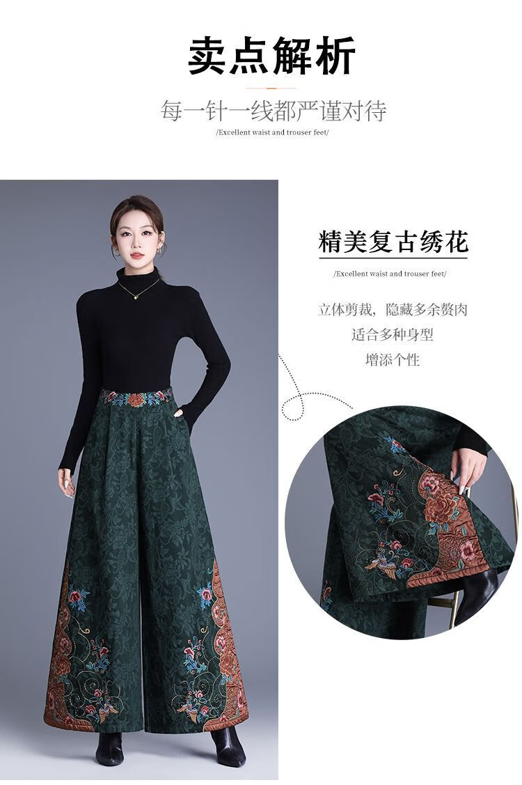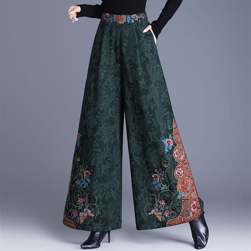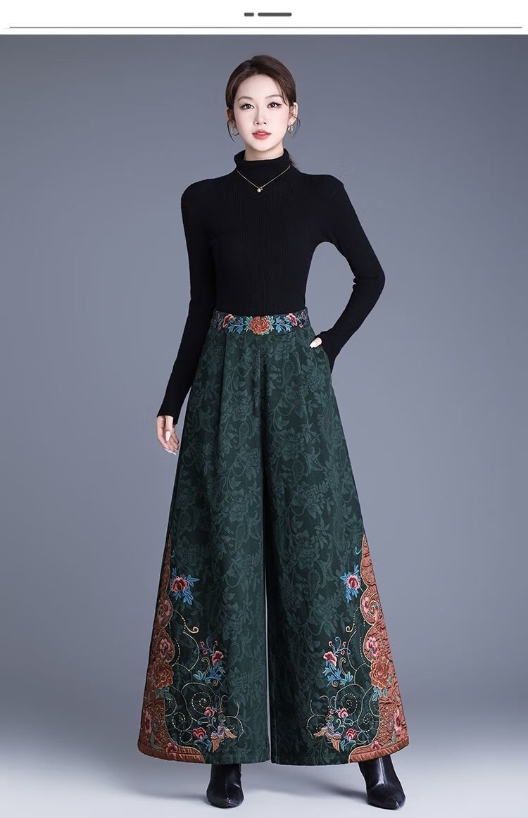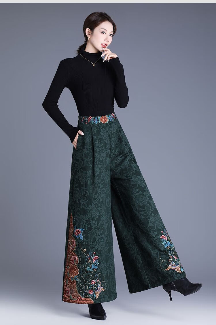 中年妈妈装新中式国风高腰阔腿裤重工绣花提花民族风刺绣长裤子女 黑色刺绣阔腿裤(不加绒) L
