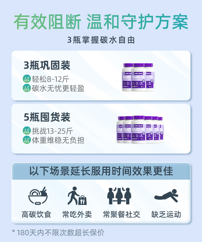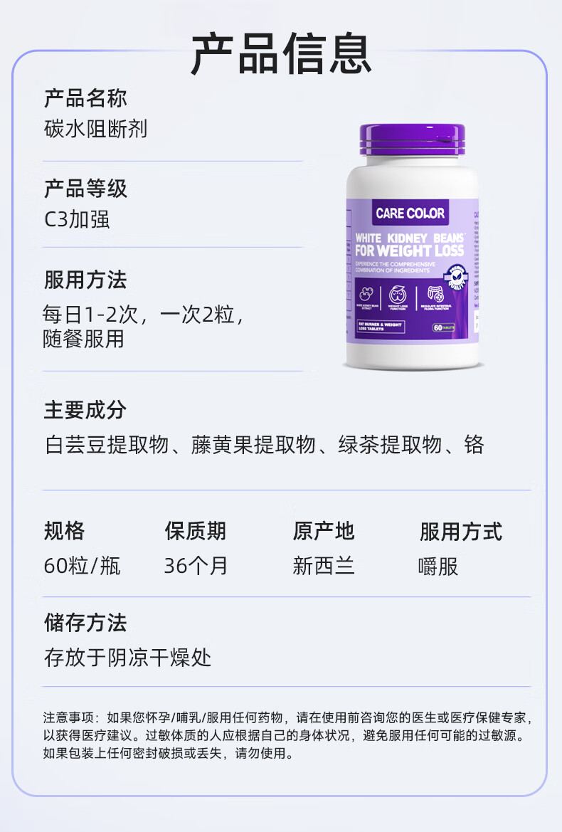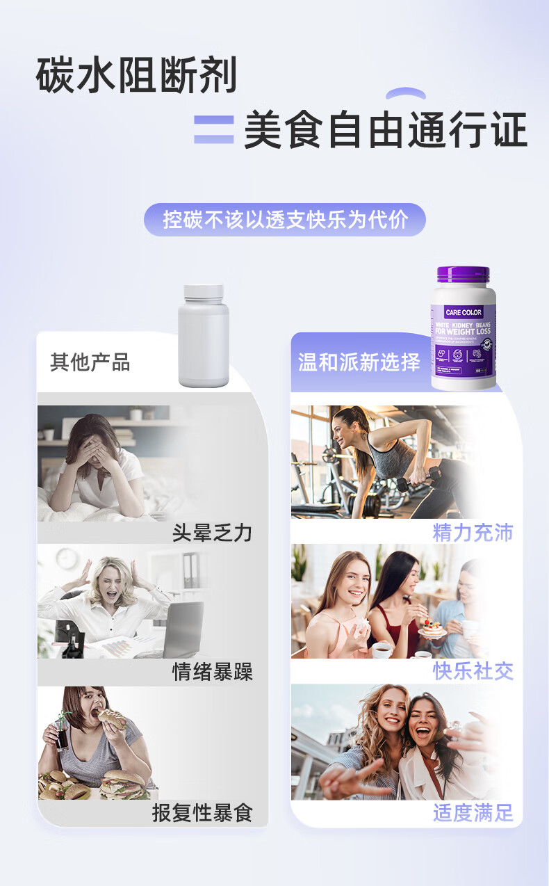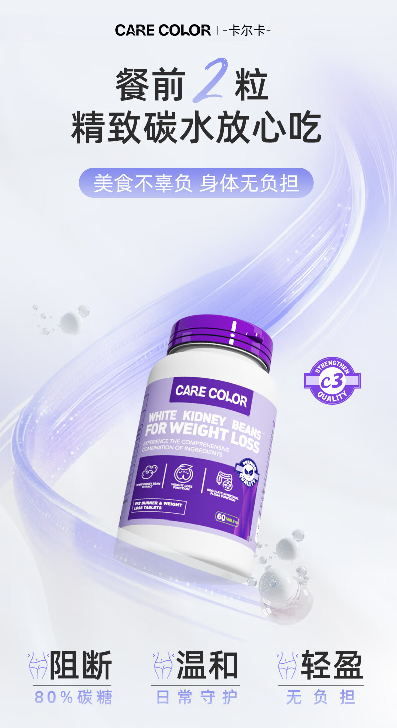 CARECOLOR卡尔卡阻断剂阻断碳水减肥瘦肚子燃脂减脂瘦身搭白芸豆男女通用C3 6瓶装 阻断剂PLUS【1次2粒自在嗨吃不惧长胖】