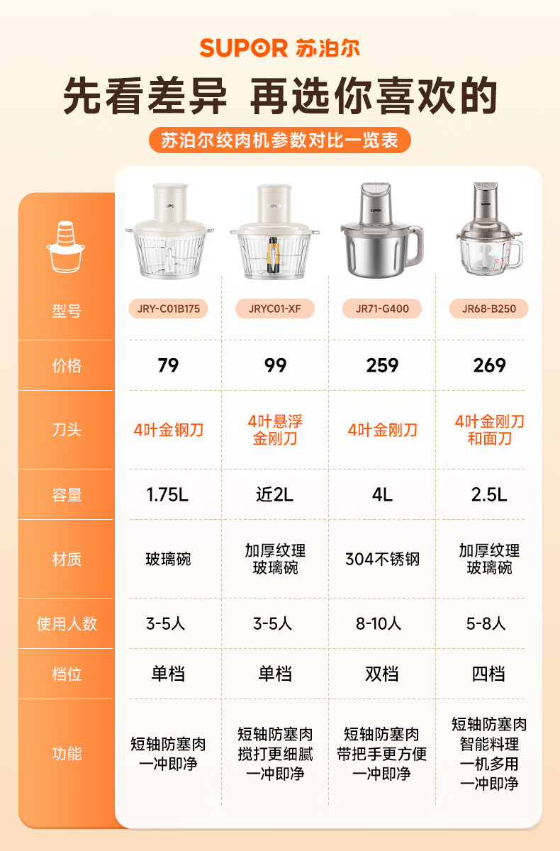 苏泊尔绞肉机家用多功能绞馅机 电动搅拌机 打肉饺子馅机碎肉机料理机-A 【4叶悬浮刀】赠送防滑垫-近 2L