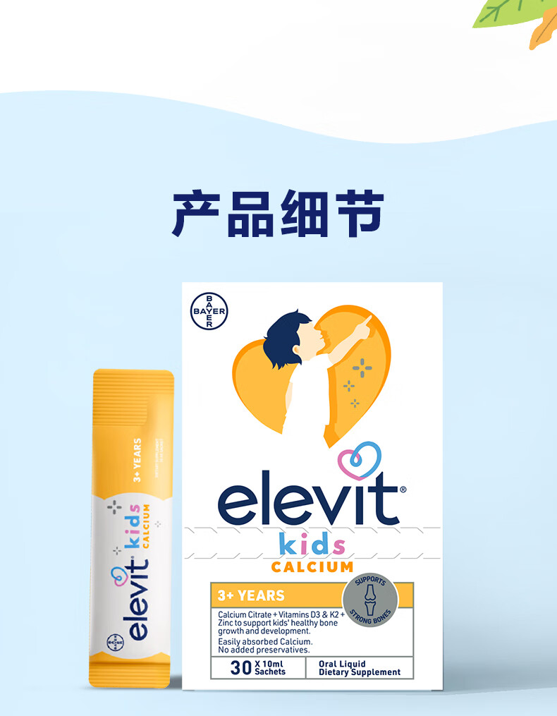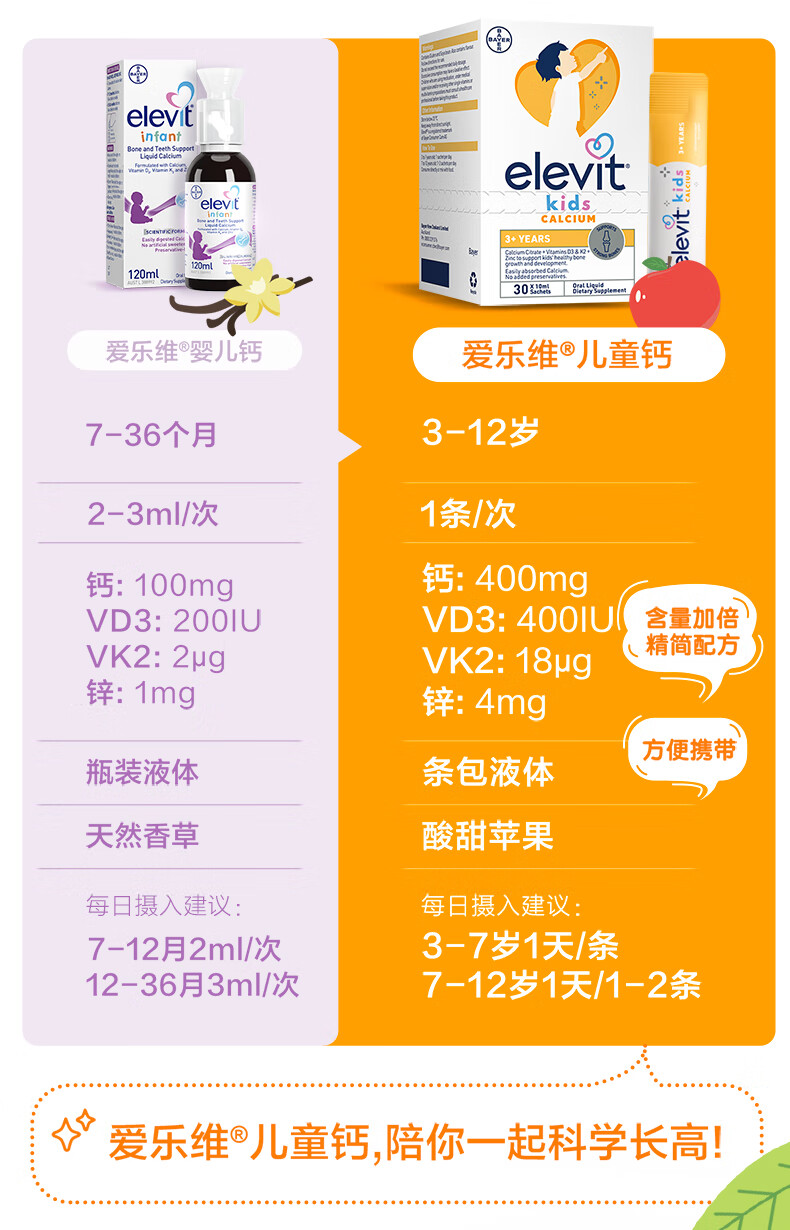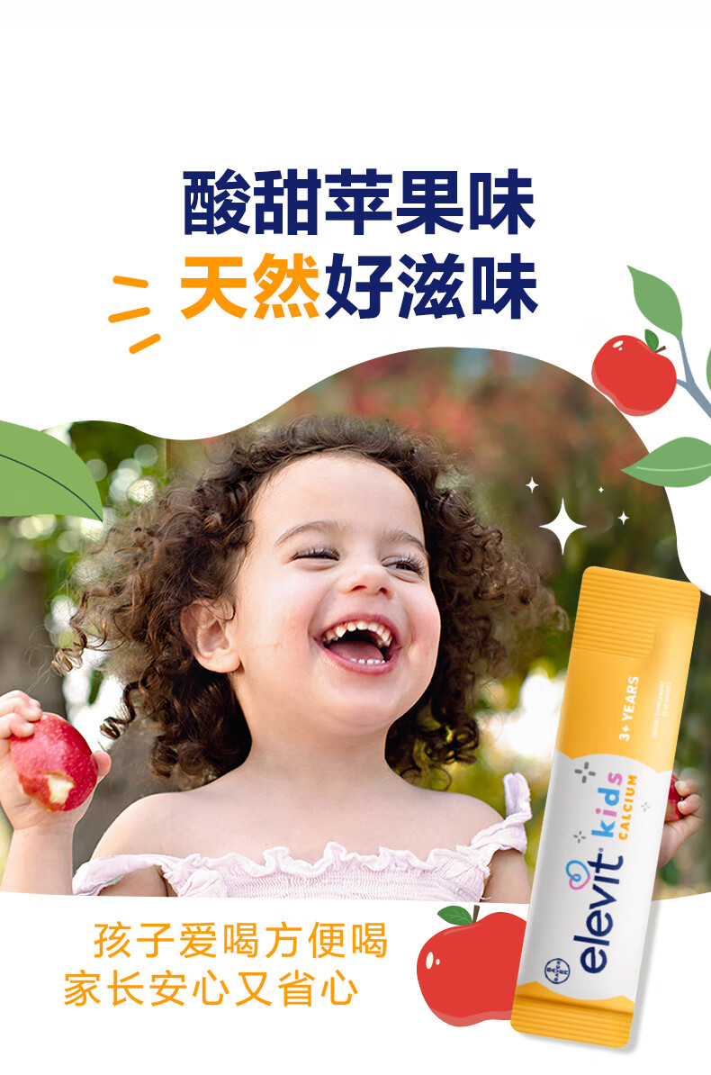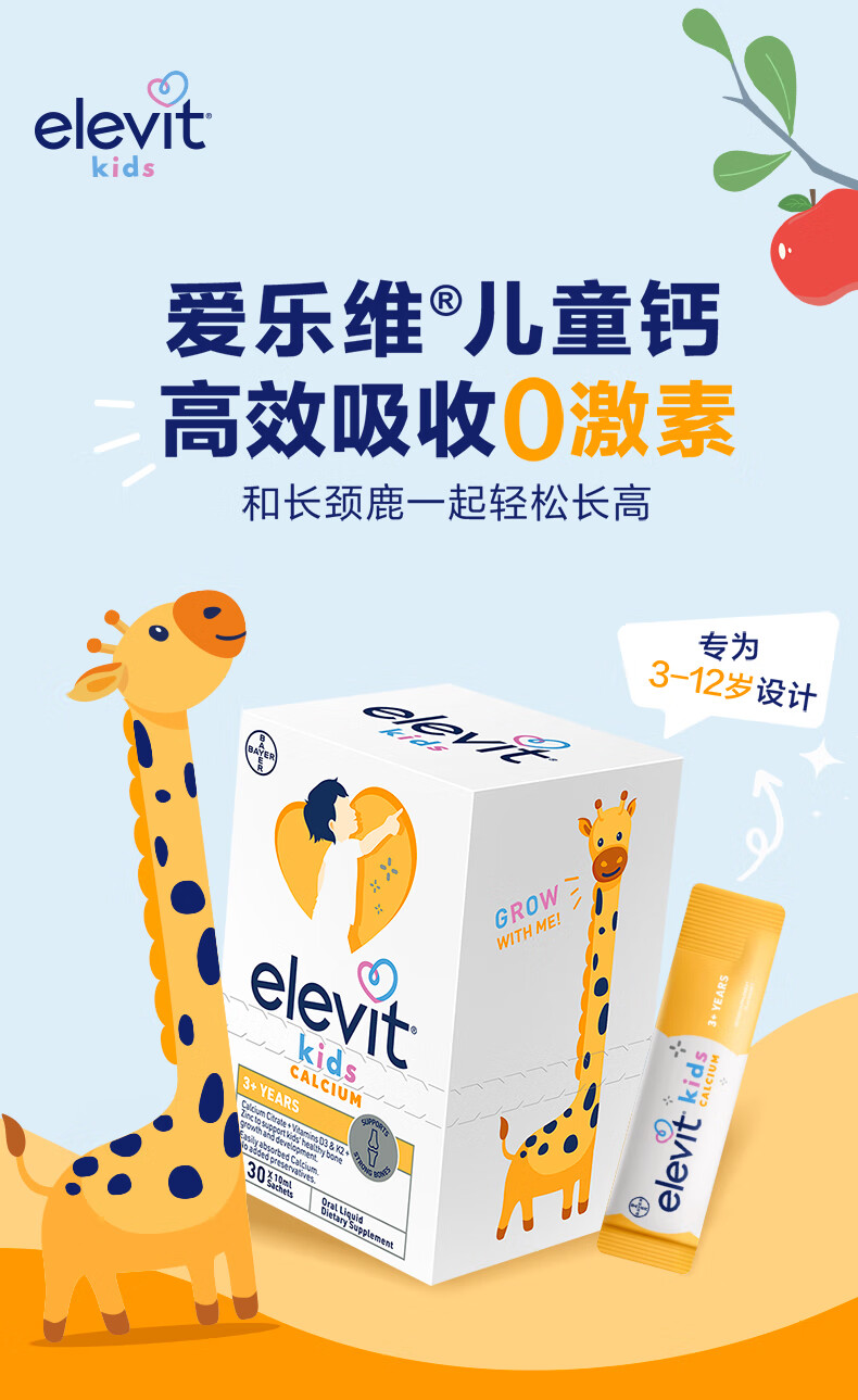 Elevit爱乐维液体钙柠檬酸钙维生素d3k2儿童钙10ml*2条非钙铁锌苹果味
