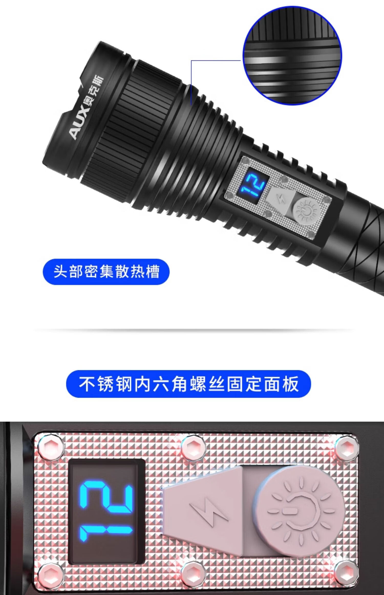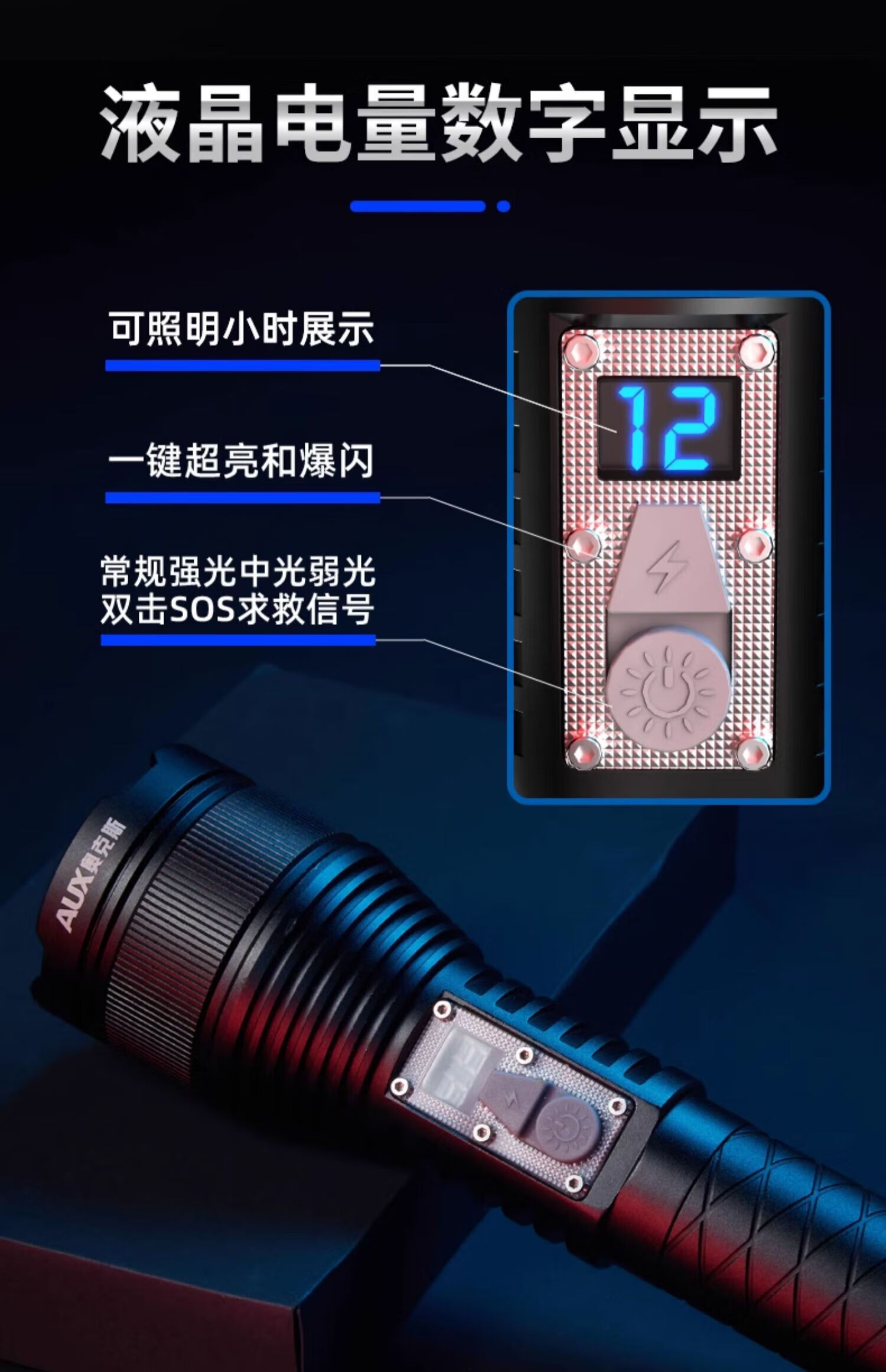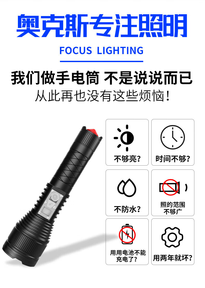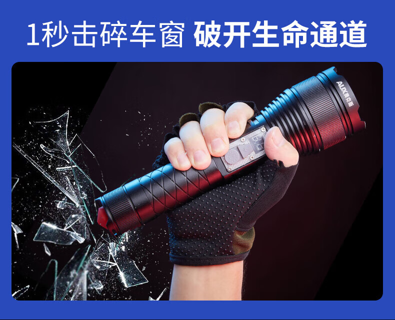 奥克斯(AUX)强光手电筒超长续航家用车载野外生存伸缩变焦铝合金机身带破窗锤 旗舰款+伸缩变焦+铝合金+4000毫安