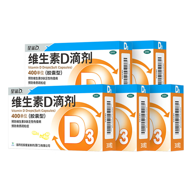 星鲨维生素d3滴剂(胶囊型)30粒*5盒【150粒】d3婴儿婴幼儿儿童成人维生素D促钙吸收补钙长高