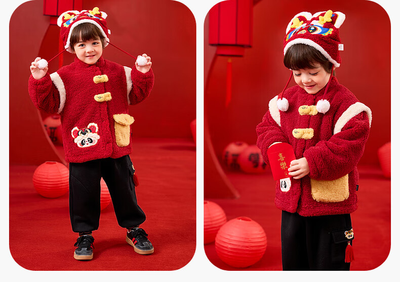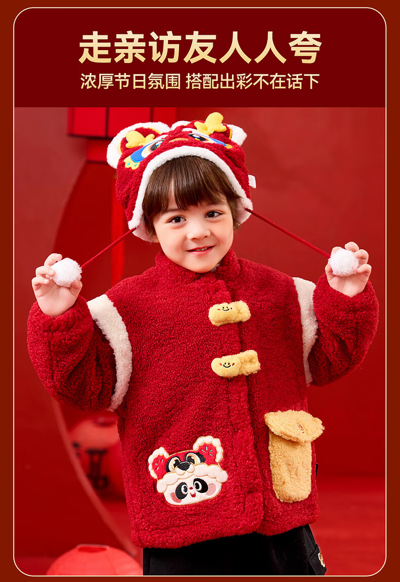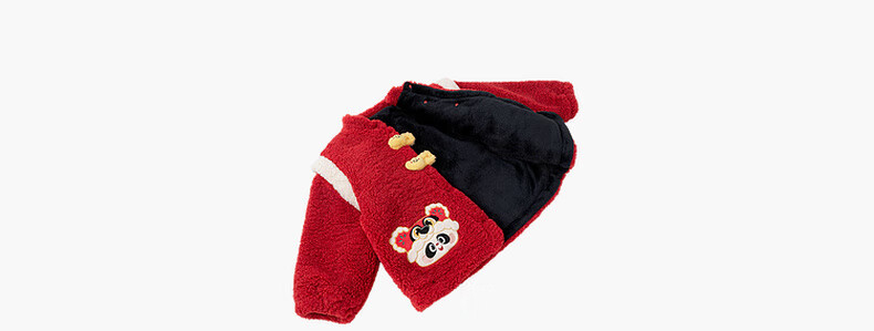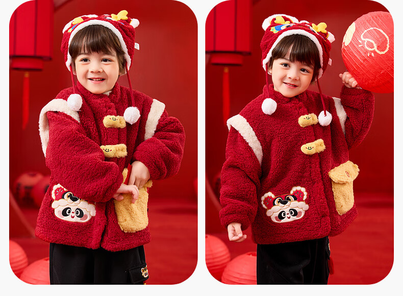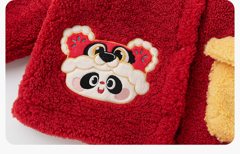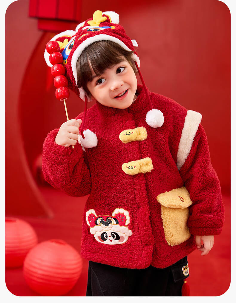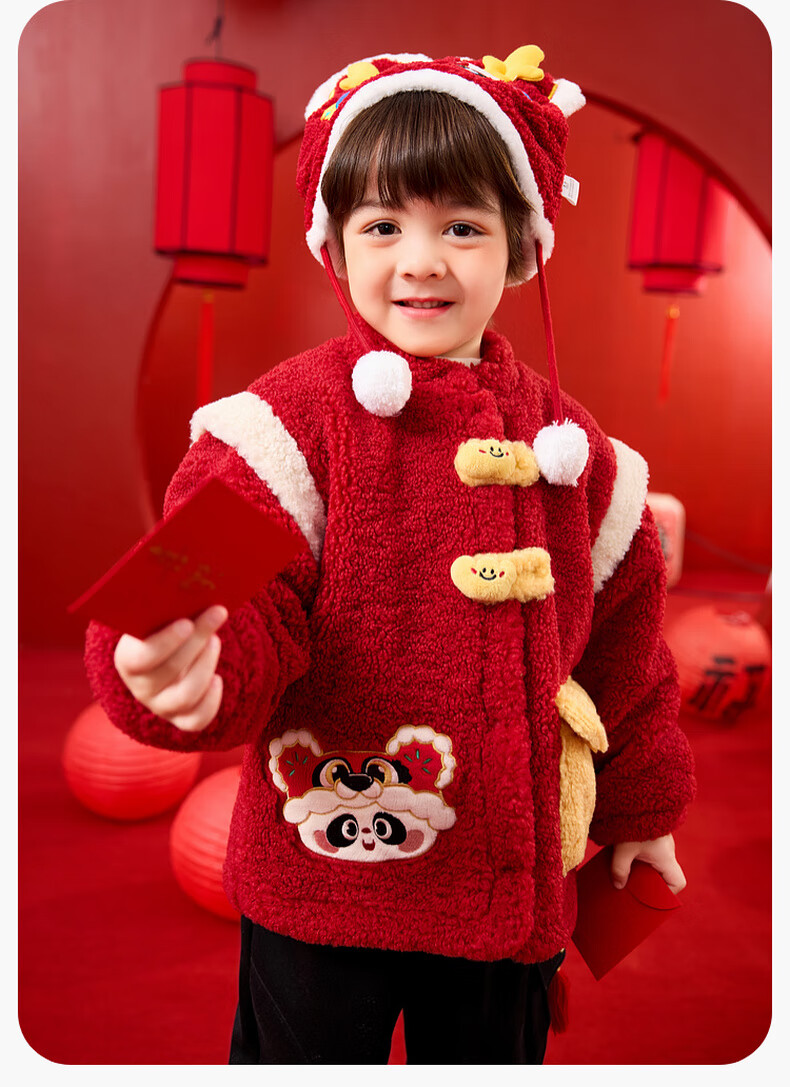 嘟嘟家【熊猫抱福】儿童外套新中式冬装男童外衣加绒冬款女童上衣童装潮 红色 90