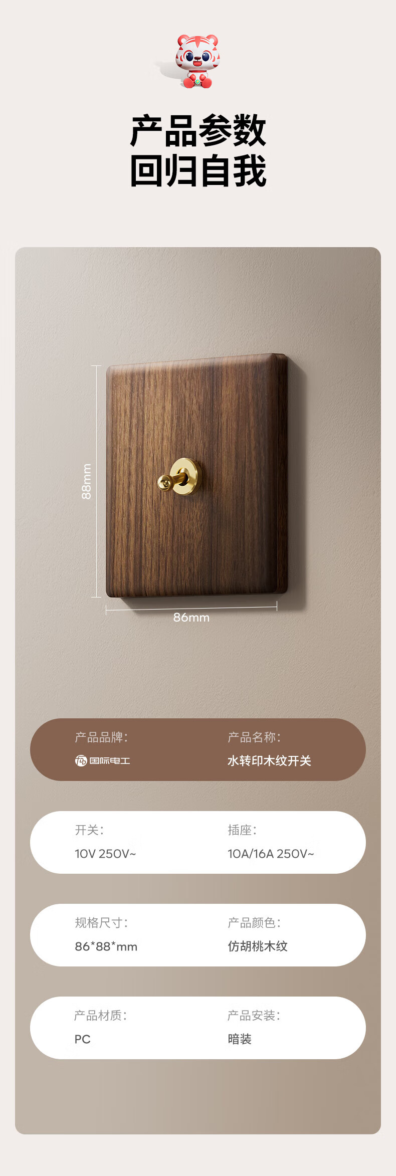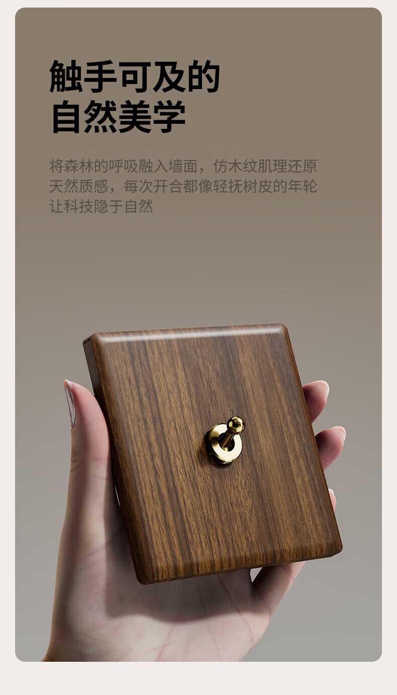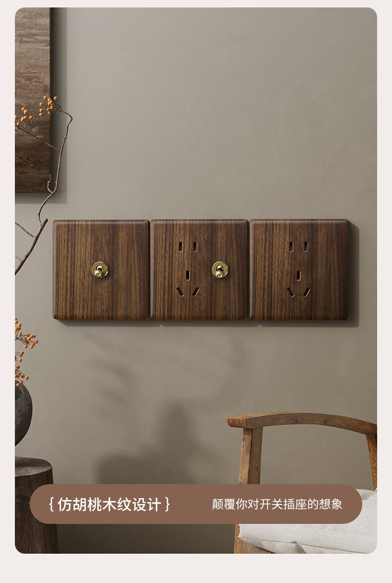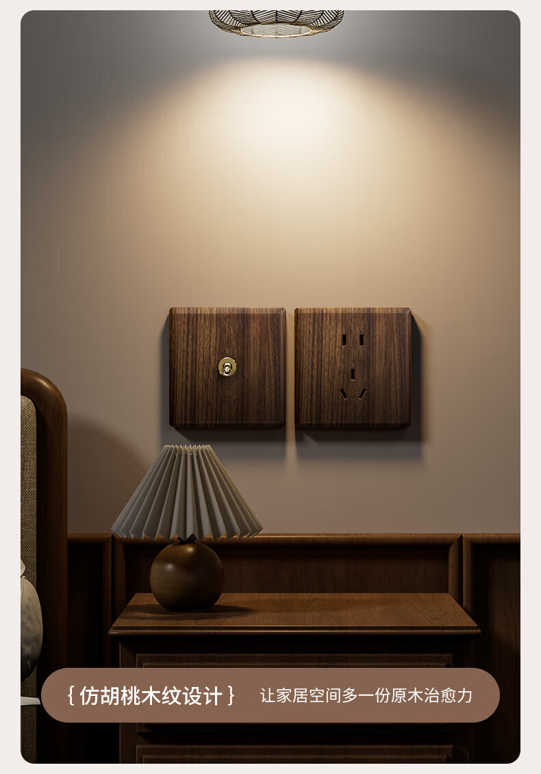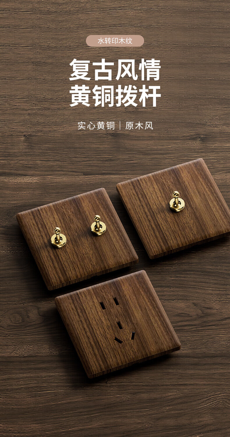 国际电工复古开关插座面板黄铜拨杆86型五孔仿胡桃木纹古风民宿酒店墙壁 空白面板