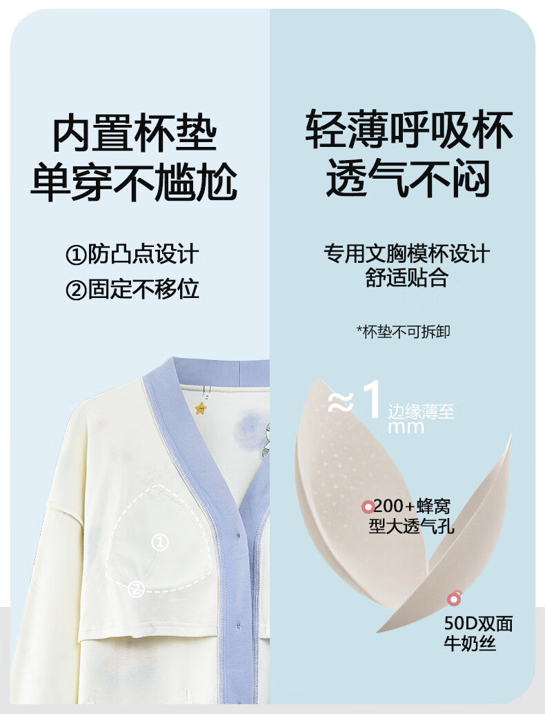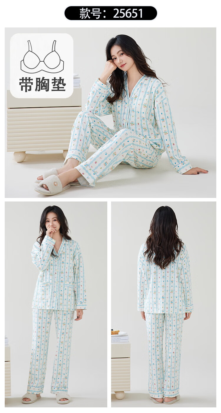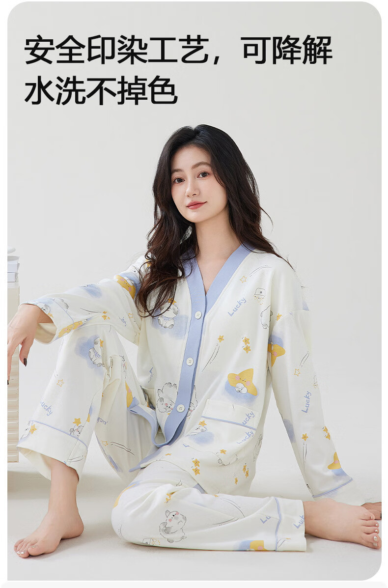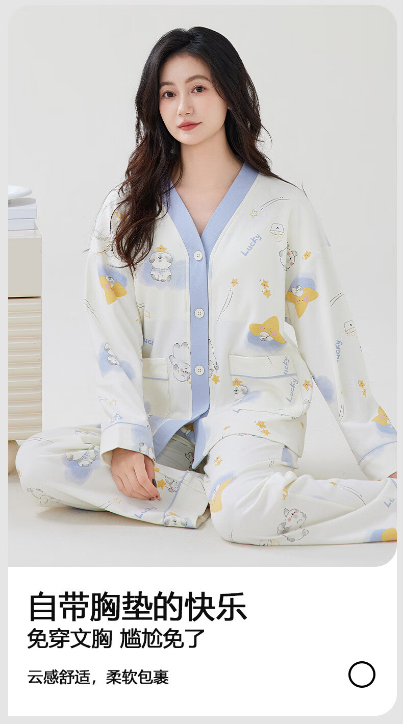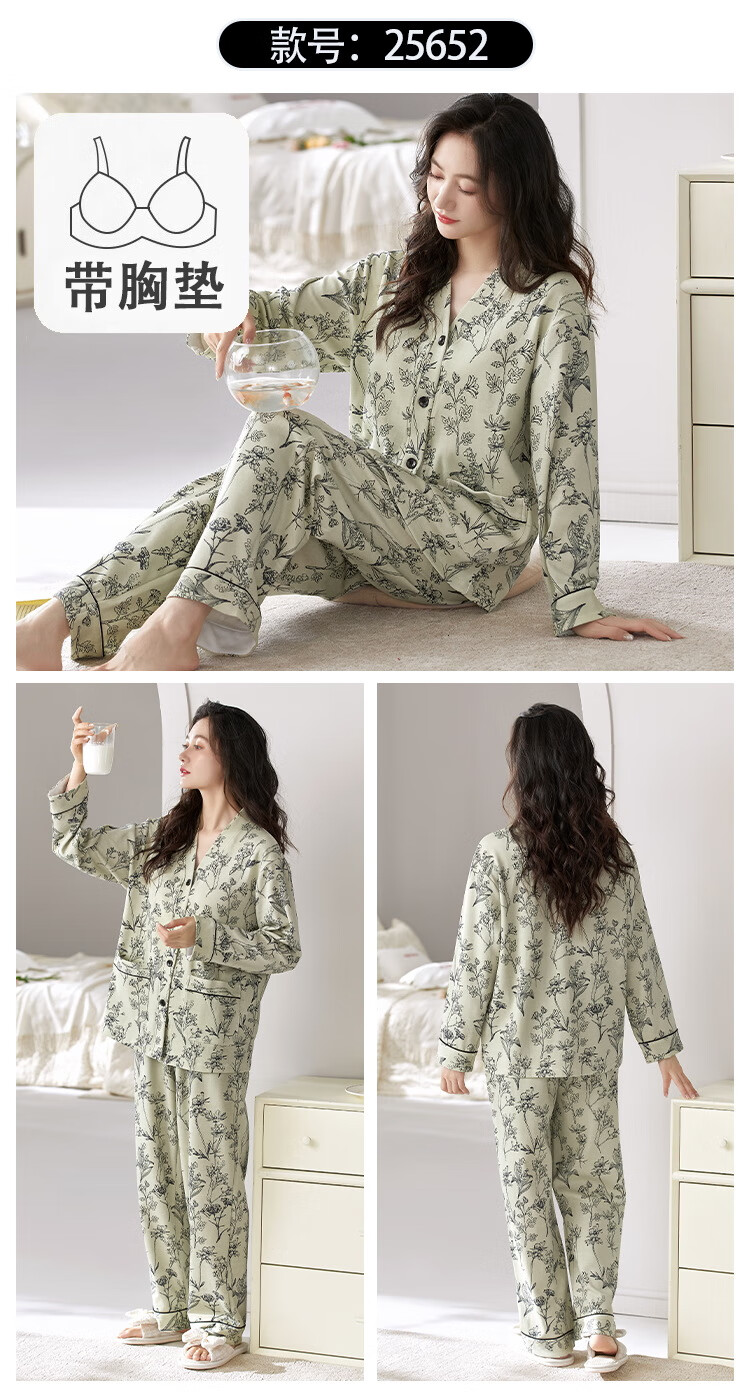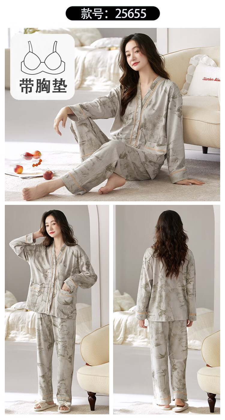 雅鹿睡衣女带胸垫长袖长裤套装春秋季薄款和服领开衫可外穿女家居服 T25655茶灰杏水墨 L 【95-115斤】