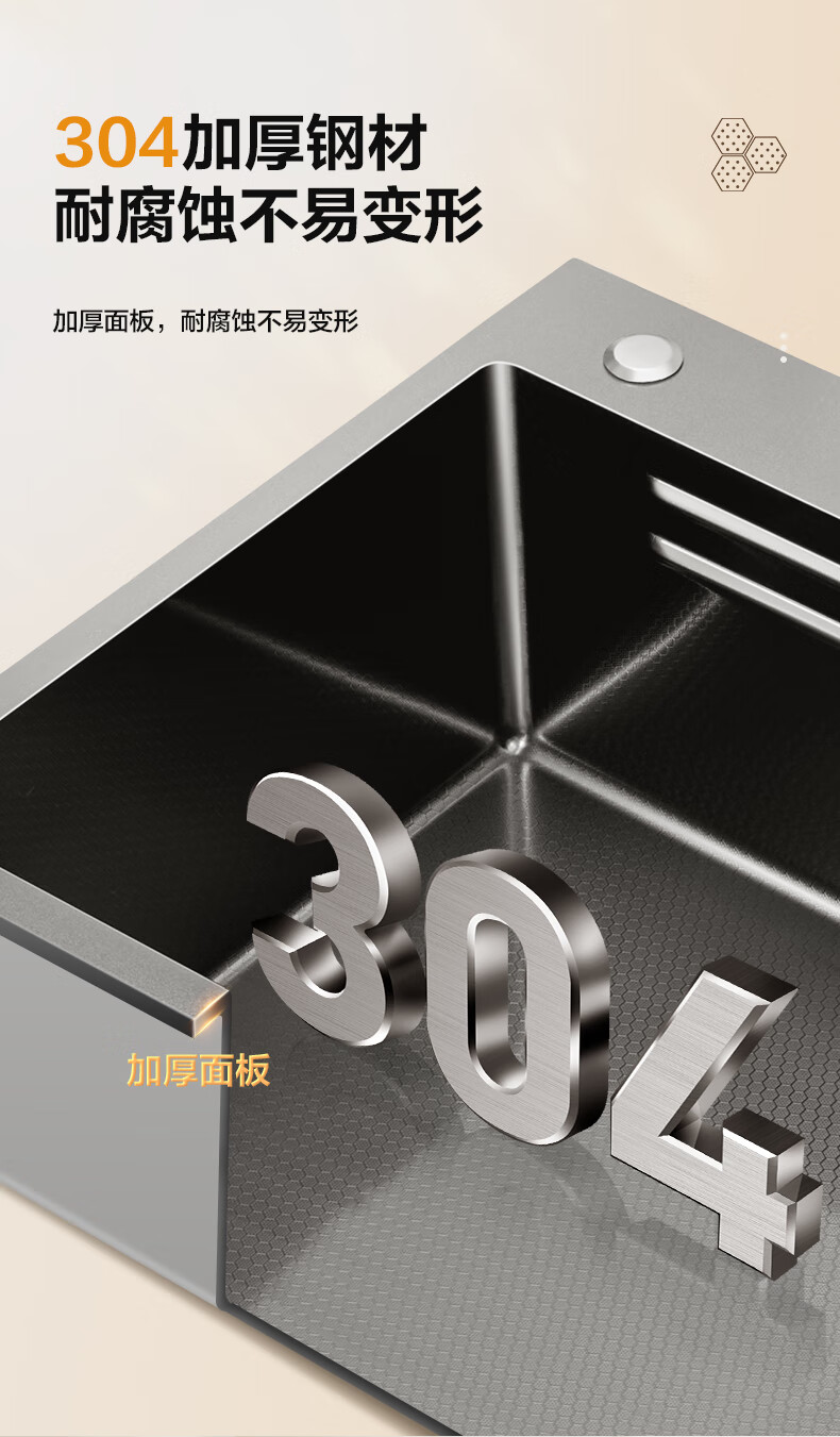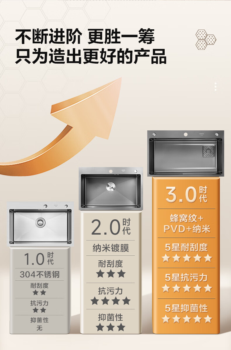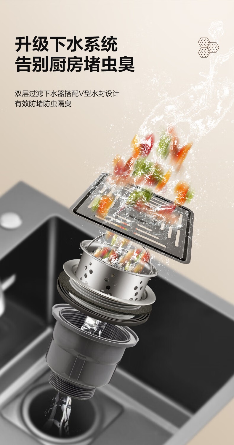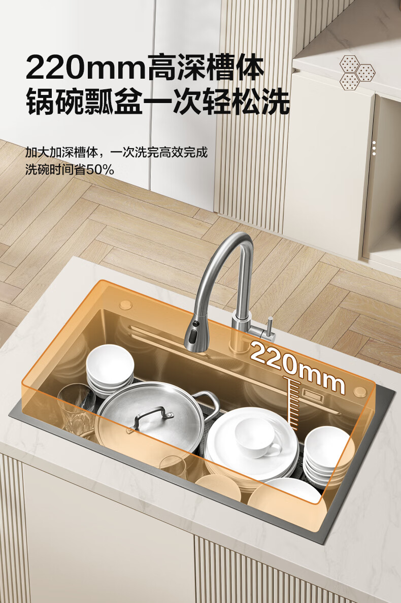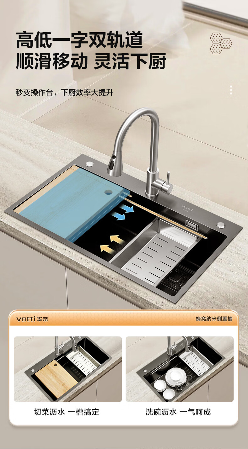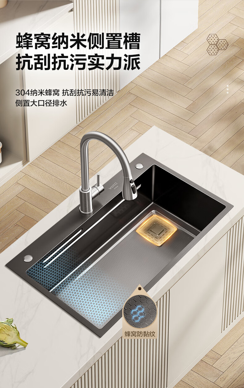 华帝(VATTI)厨房水槽大单槽洗菜盆一体盆304不锈钢蜂窝纳米多功能洗碗洗菜池 枪灰抽拉龙头丨蜂窝纳米槽 68CM*45CM