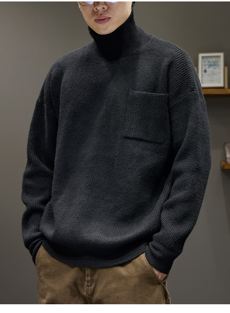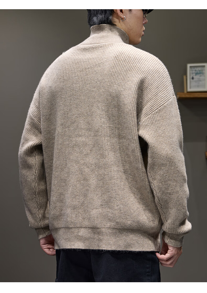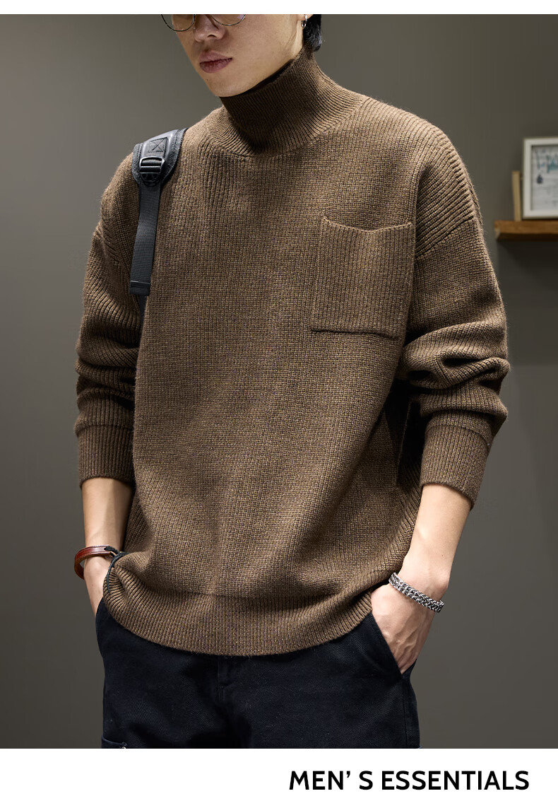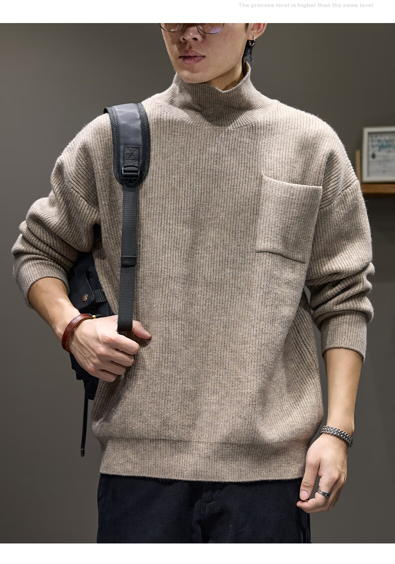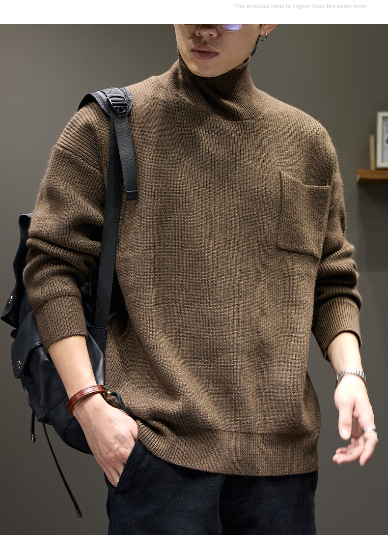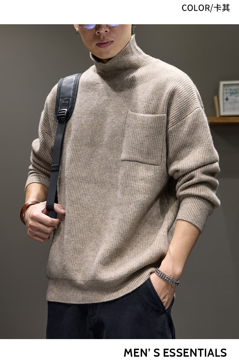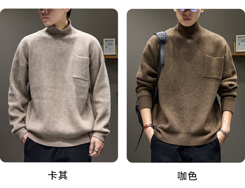 新百伦美式半高领毛衣男士秋冬季保暖针织衫宽松厚款休闲重磅外套 咖色 L 码【建议130-145斤】