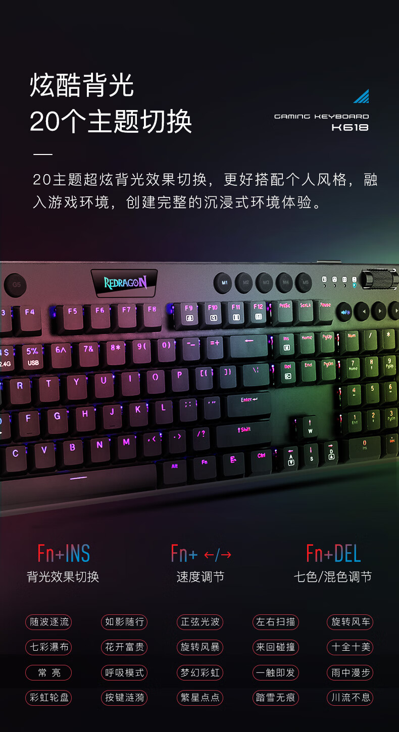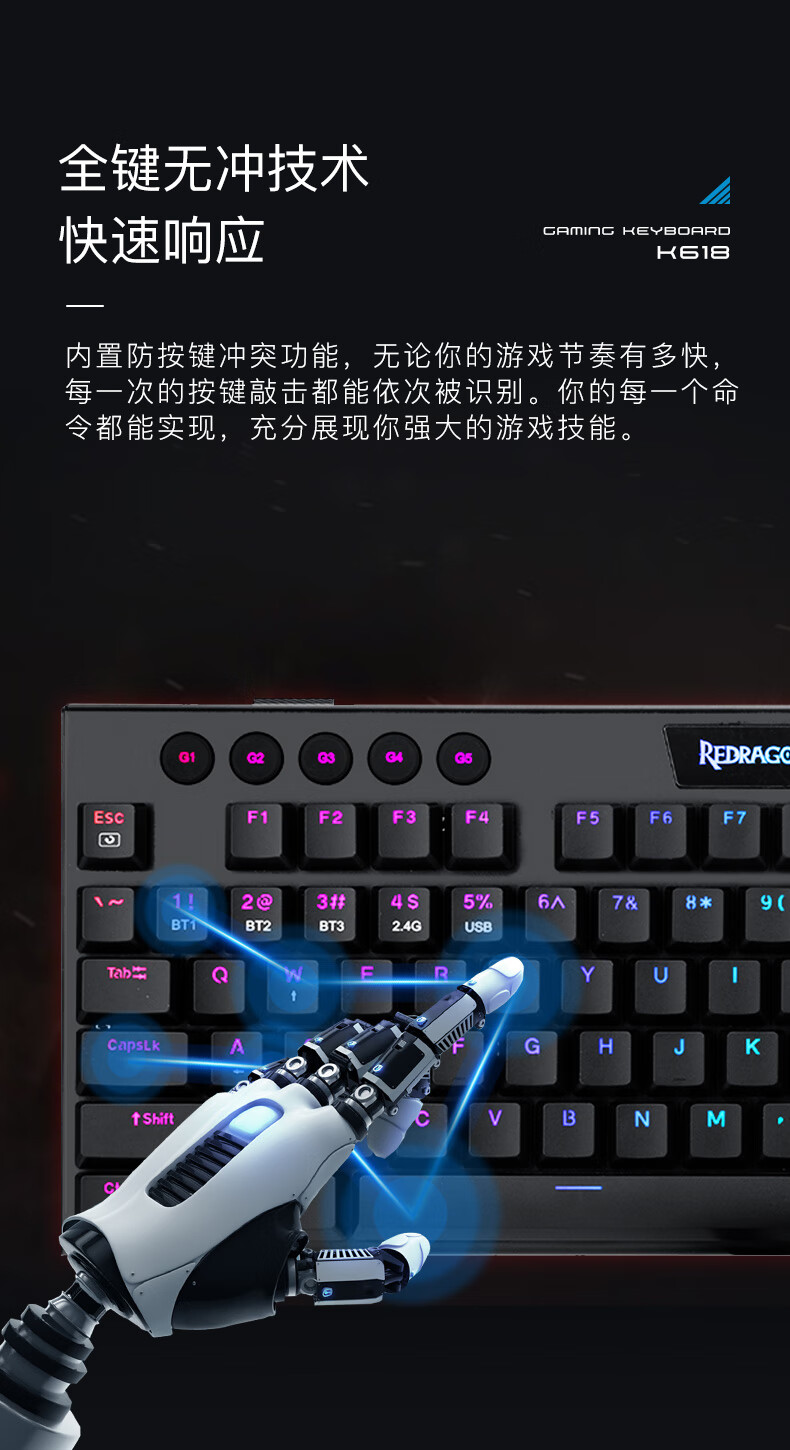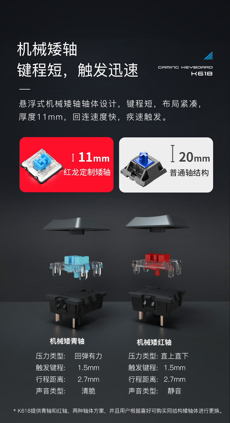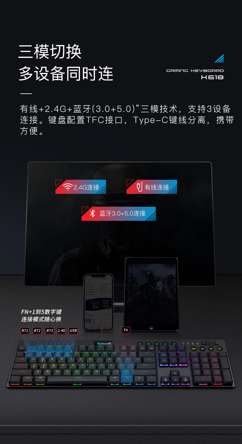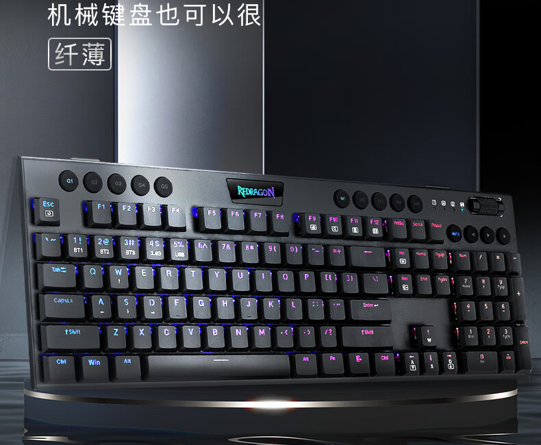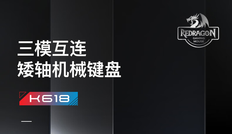 红龙(REDRAGON) 矮轴机械键盘 无线有线蓝牙三模 疾速触发全键无冲宏编辑多媒体滚轮 超薄办公游戏键盘 K621黑灰红-青轴